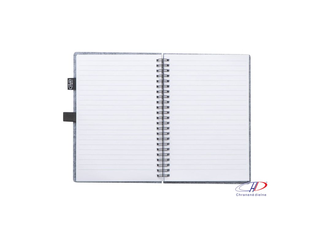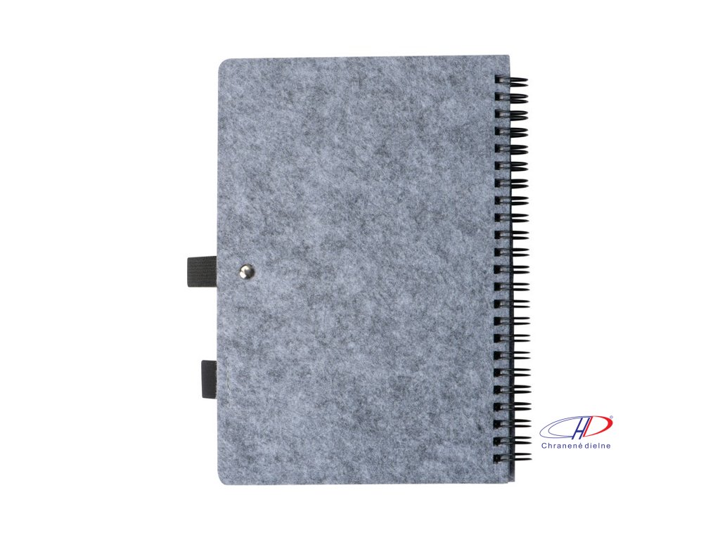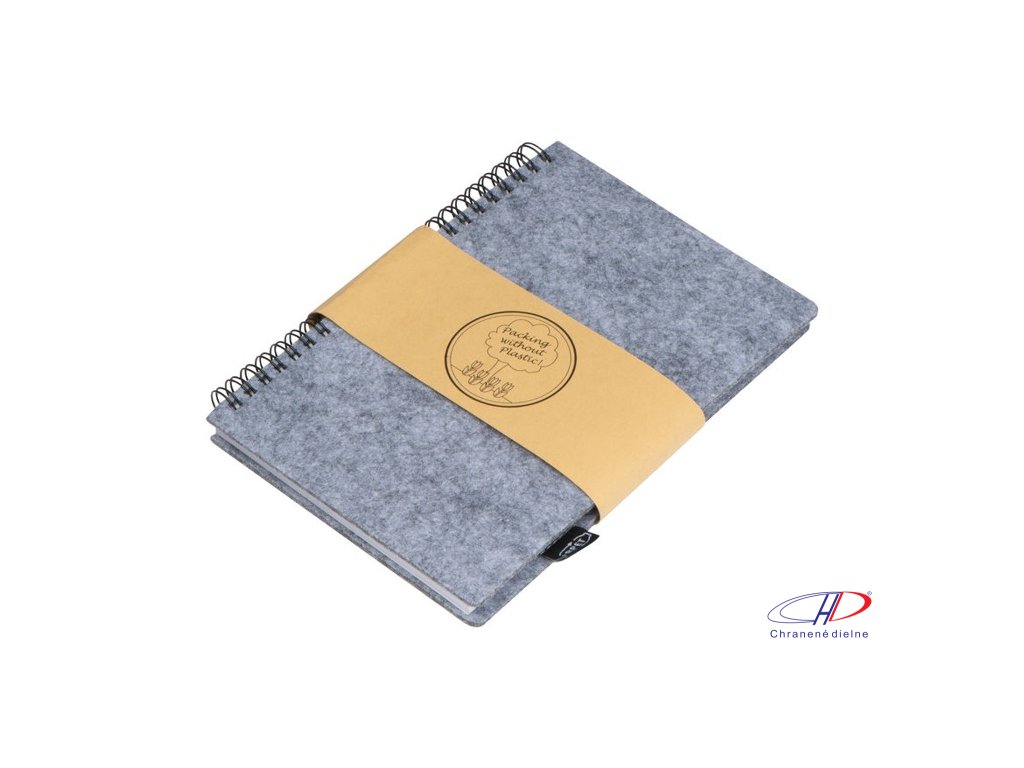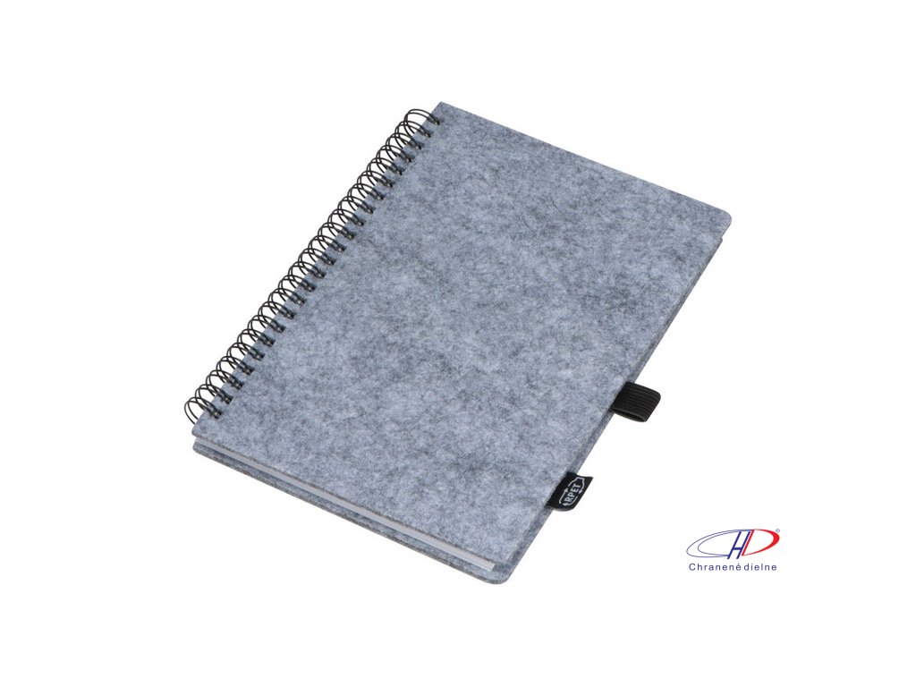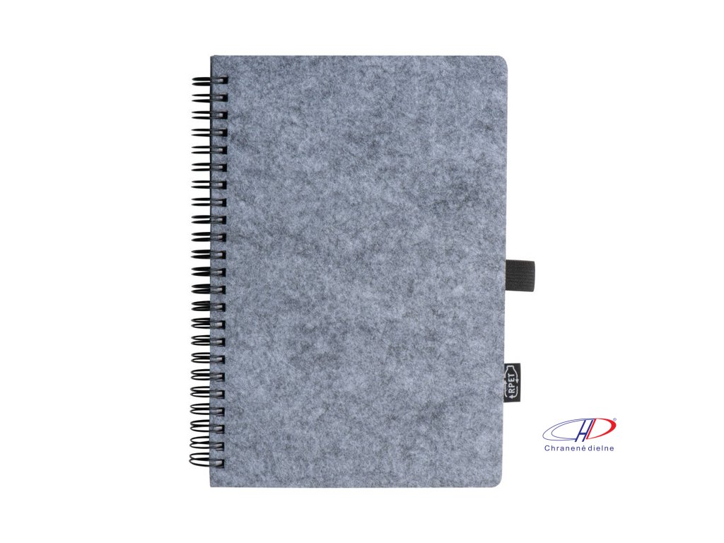 Plstený zápisník z RPET, obsahujúce 160 linajkových strán z recyklovaného papiera so špirálovou väzbou a pútkom na guľôčkové pero.Dodatočné parametre
