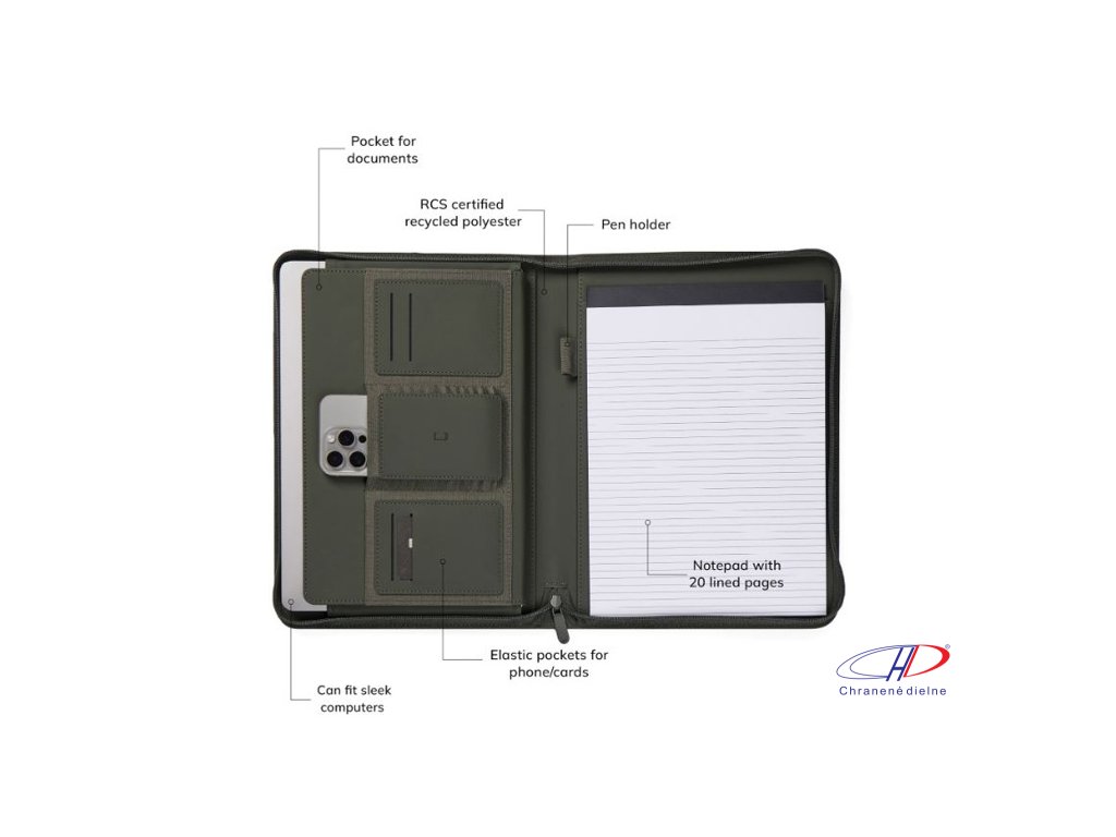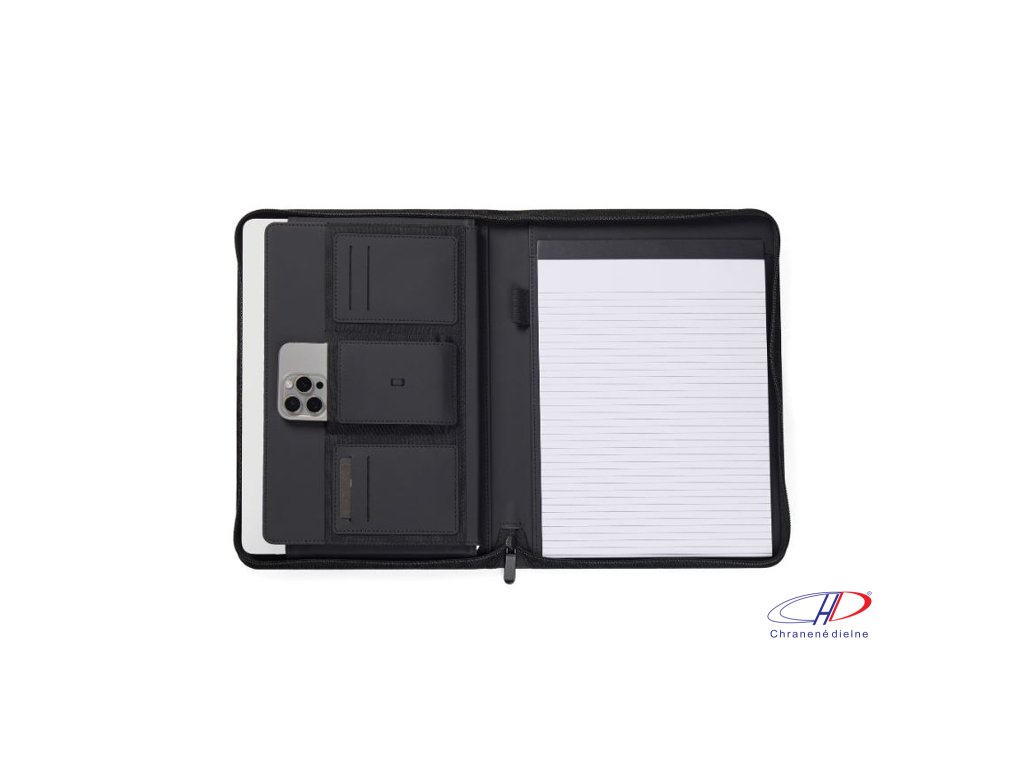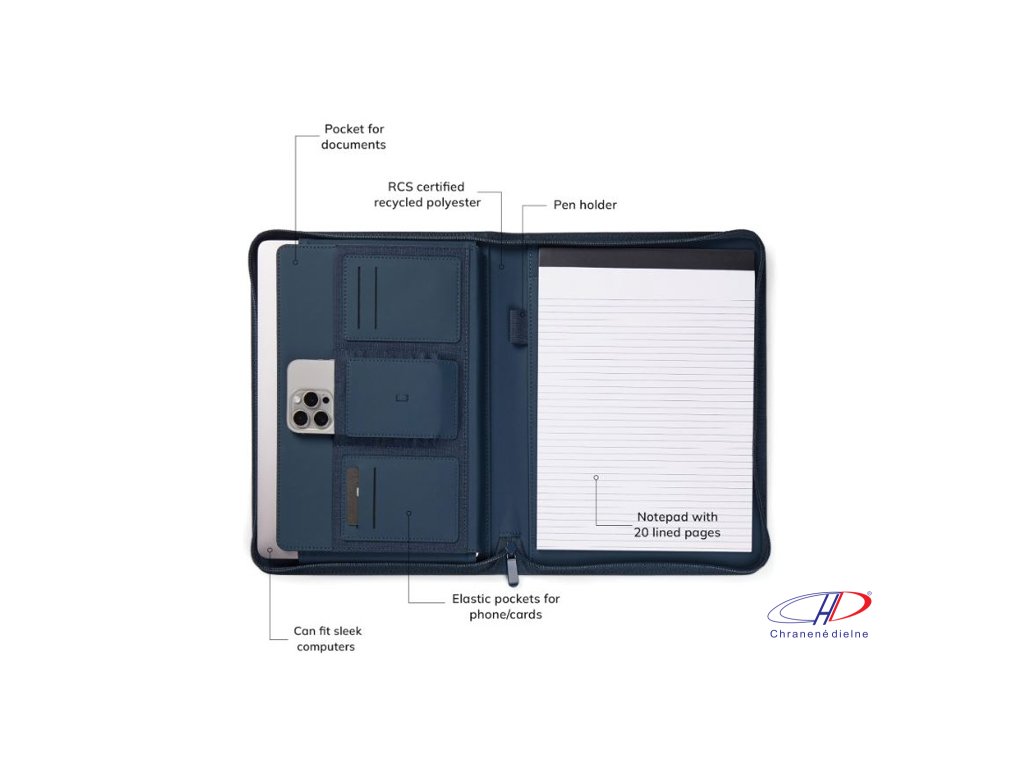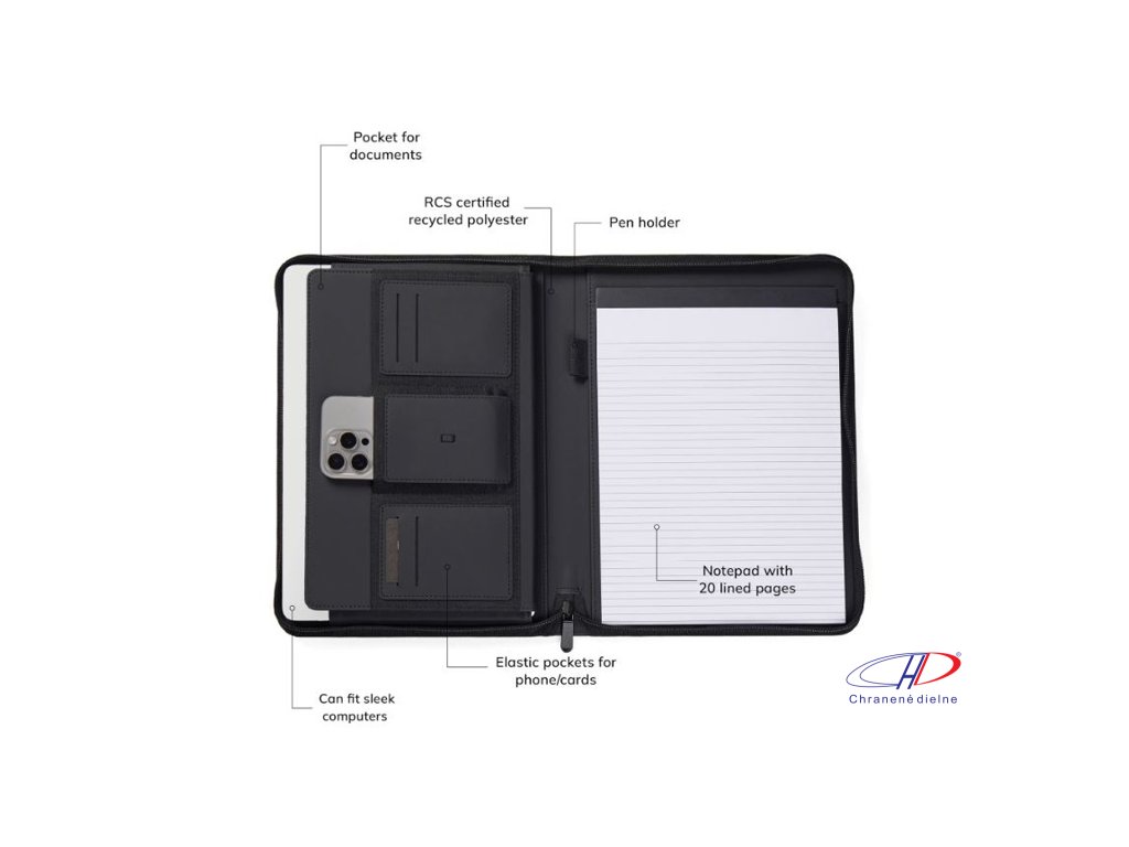 Portfólio A4 je vybavené držiakom na pero, vreckom na papier, vreckami na karty, telefón a poznámkovým blokom s 20 linkovanými stránkami. Papierová vložka je vymeniteľná. Certifikácia RCS.Dodatočné parametre