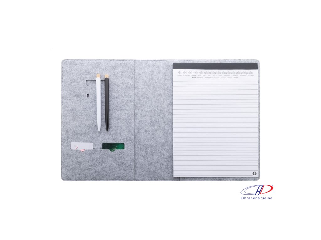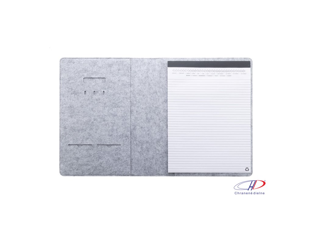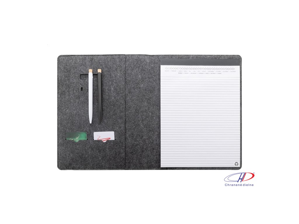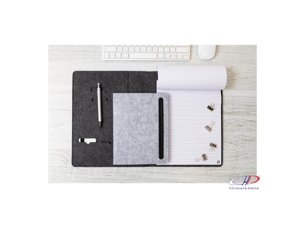 Plstená sloha A4 na dokumenty z RPET s prednými a niekoľkými vnútornými vreckami s organizérom. S 20 linajkovými listami poznámkového bloku z recyklovaného papiera.Dodatočné parametre