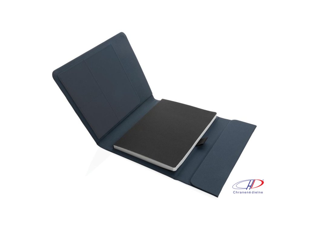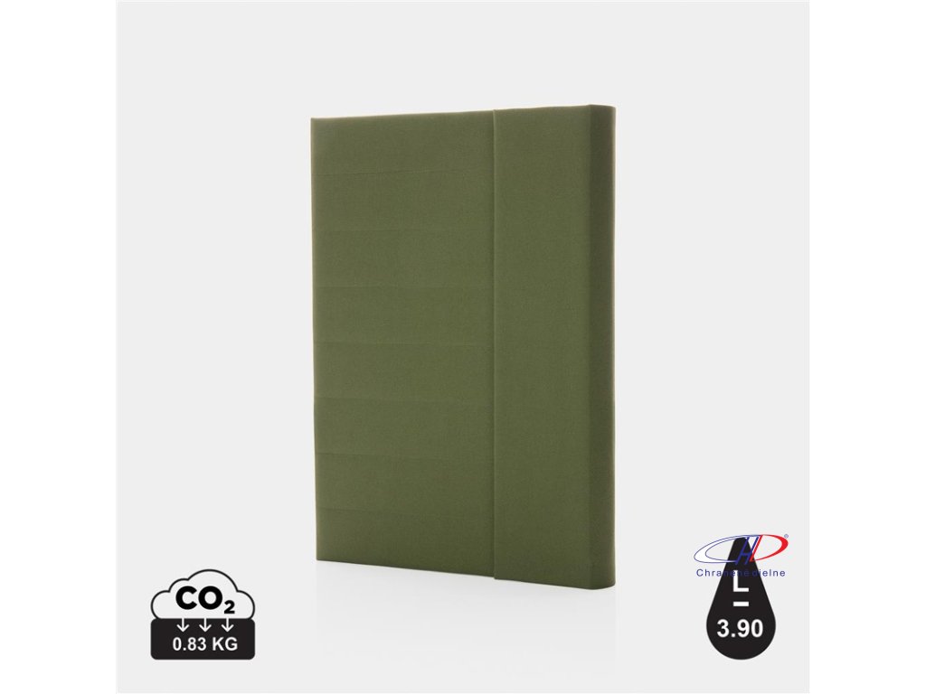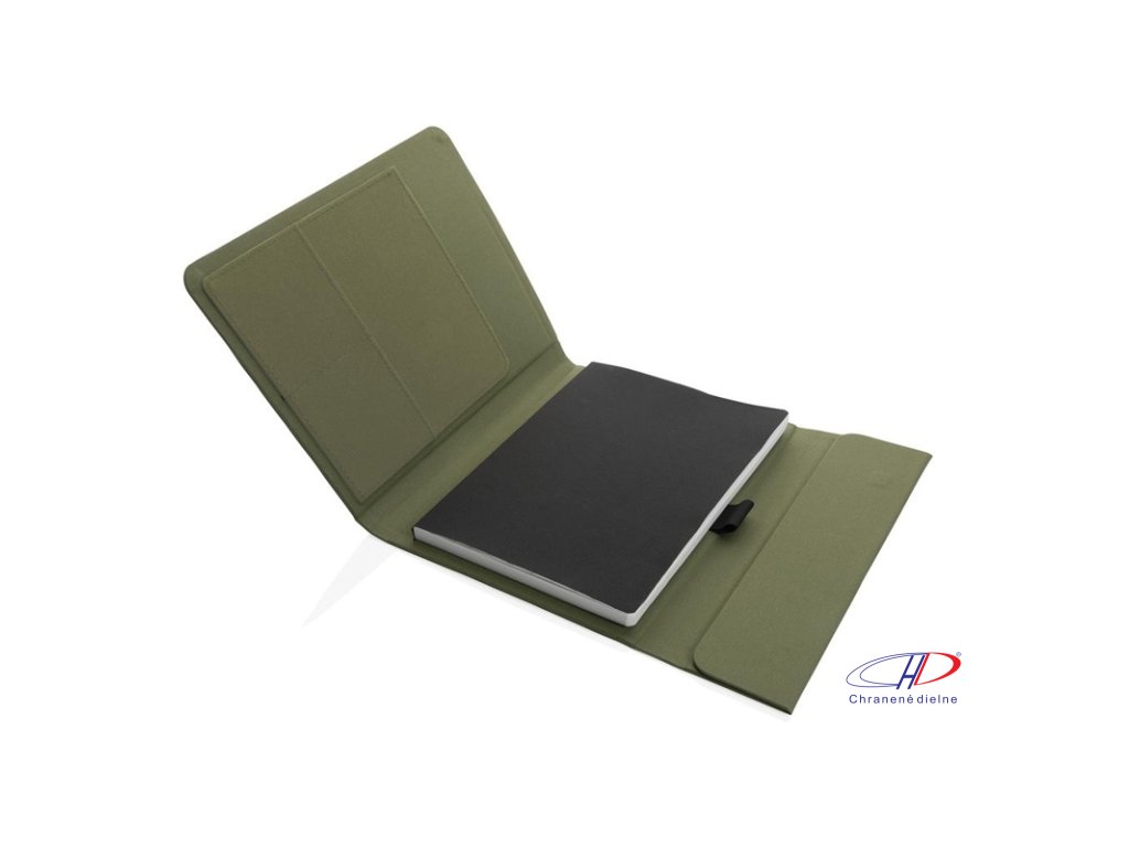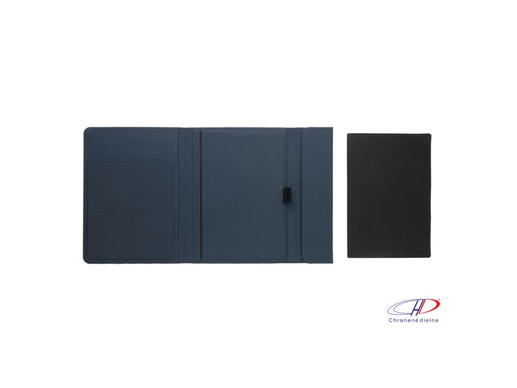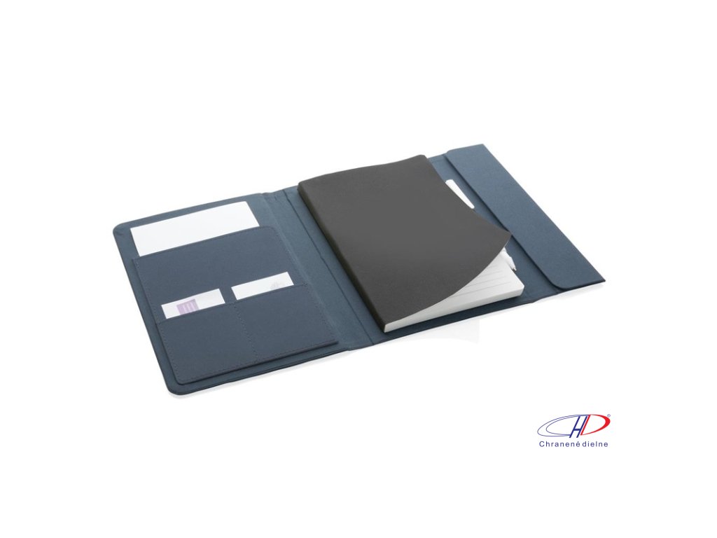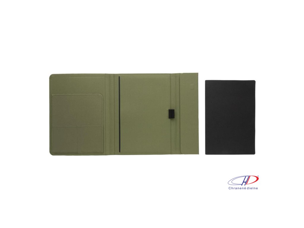 Portfólio A5. 1 veľké vrecko, 2 sloty na vizitky/karty, pútko na pero a vymeniteľný blok z recyklovaného linajkového krémového papiera (64 listov/128 strán, 80g/m2). Na výrobu bolo použitých 6,5 500ml PET fliaš a usporených 3,9 l vody. Bez PVC.Dodatočné parametre
