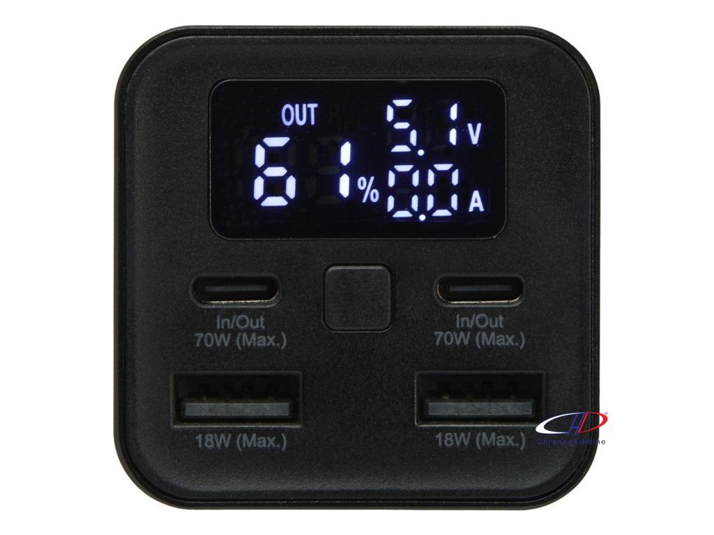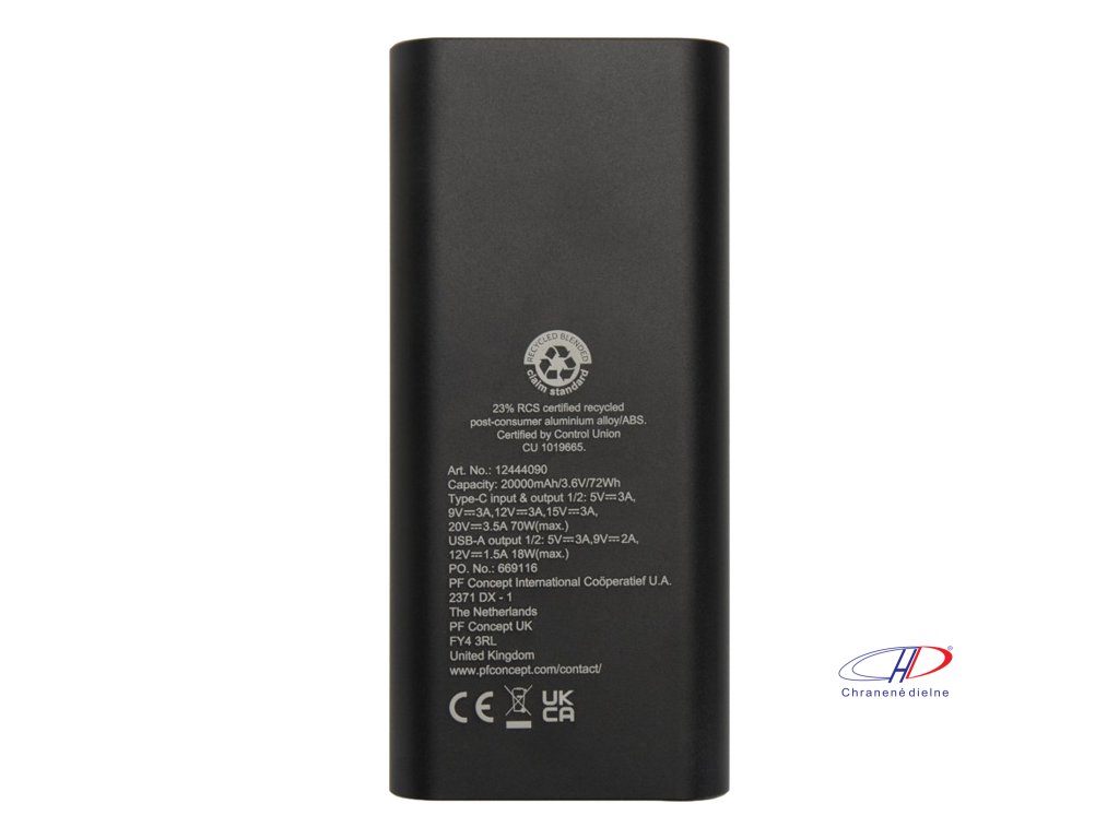Powerbanka 20 000 mAh z recyklovaného hliníka. 2 vysokorýchlostné 70W porty typu C a dva 18W porty USB-A. Vstavaný displej zobrazuje informácie o napájaní, vrátane percenta nabitia a údajov o dodávke napätia. Súčasťou balenia je 70W kábel typu C.Dodatočné parametre