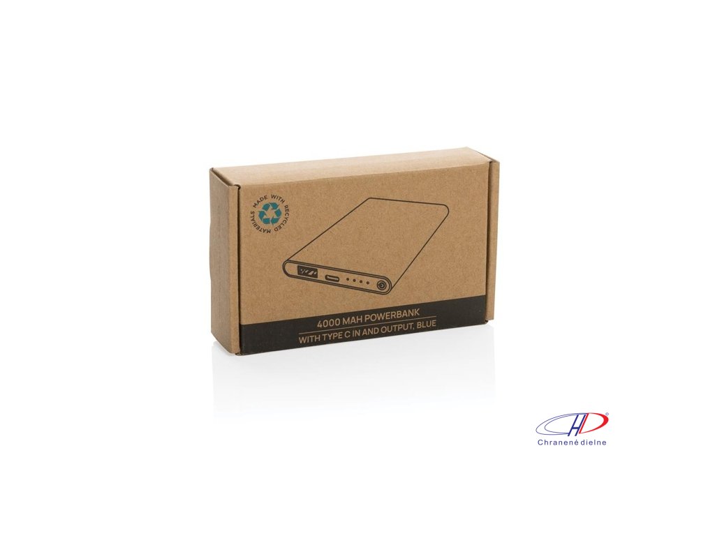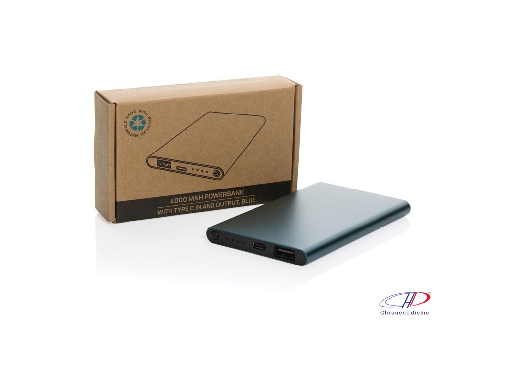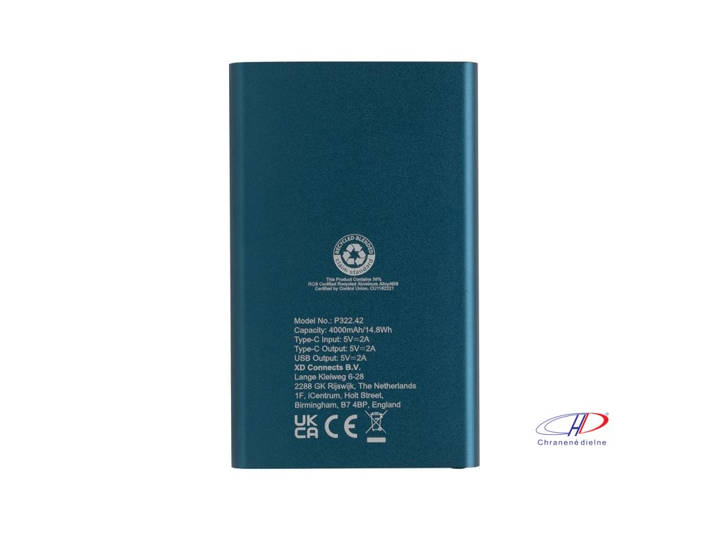 Plochá powerbanka 4 000 mAh. RCS je globálny štandard, ktorý umožňuje overiť použitie rec. materiálu. Podiel recyklátu: 36%. Svetelné indikátory. USB vstup C:5V/2A. USB C výstup:5V/2A, USB A výstup:5V/2A. Vrátane kábla z rec. TPE. PVC free. FSC® krabička.Dodatočné parametre