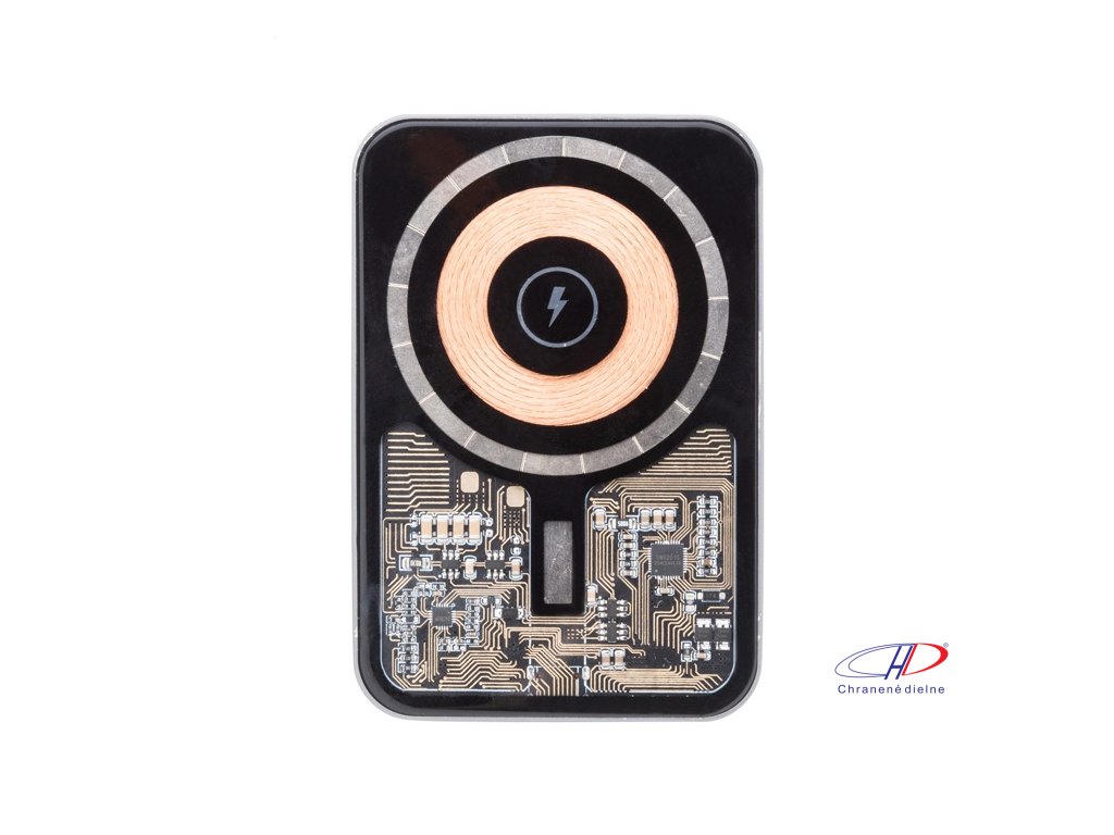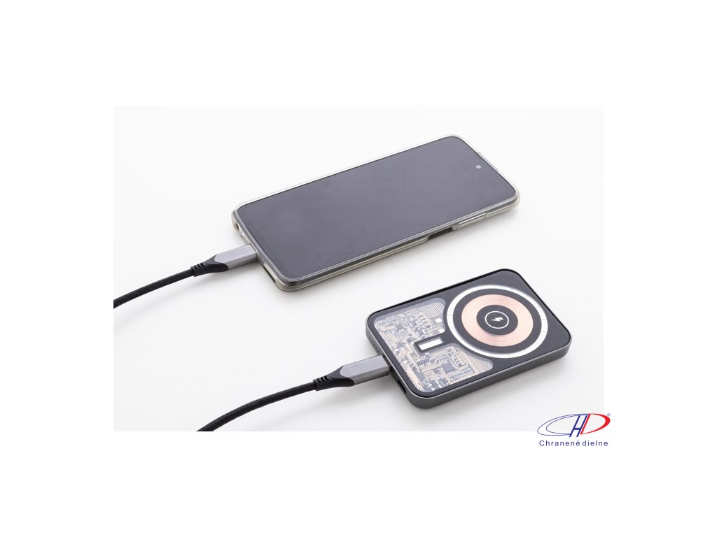 Powerbanka z recyklovaného hliníka s polopriehľadným krytom a viditeľnými elektronickými súčiastkami. 5000 mAh batéria, bezdrôtové nabíjanie 15W. So vstupom USB-C a portom pre nabíjačku. Vrátane samolepiaceho kovového krúžku. Vrátane USB nabíjacieho káblaDodatočné parametre