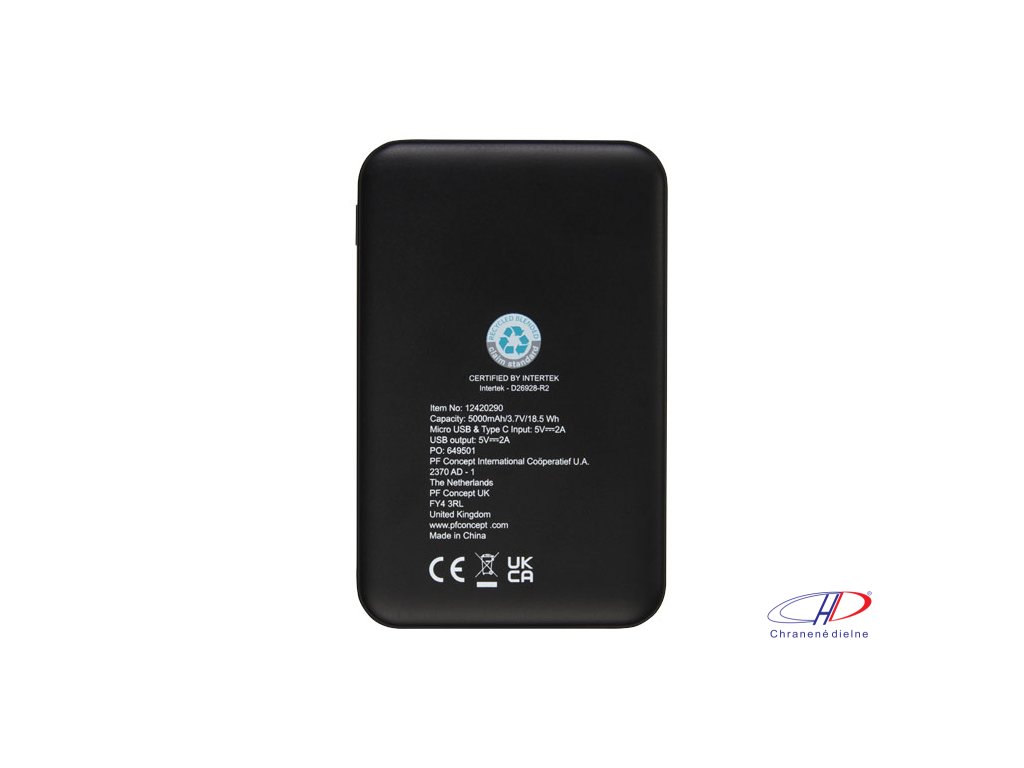 Powerbanka z recyklovaného ABS plastu s certifikáciou RCS. Powerbanka obsahuje lítium polymérovú batériu triedy A s dlhou životnosťou 5 000 mAh. Indikátory napájania indikujú zostávajúcu úroveň energie, takže vždy viete, kedy je treba dobiť.Dodatočné parametre