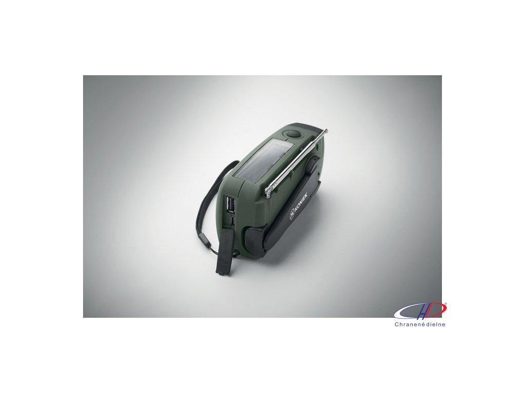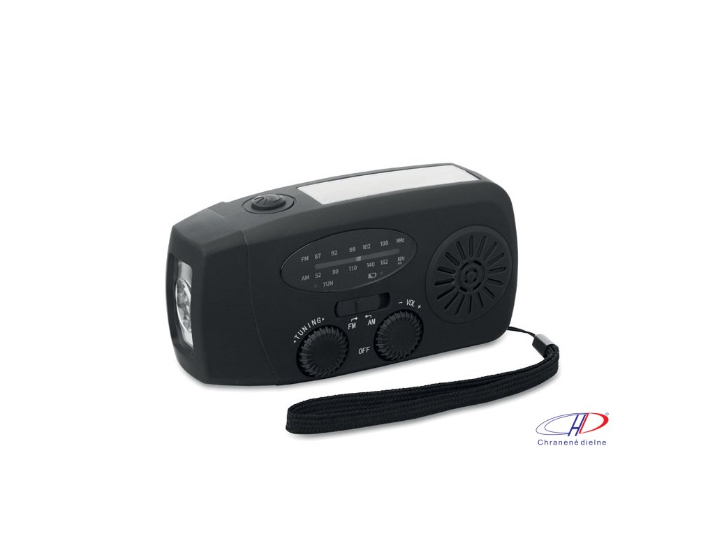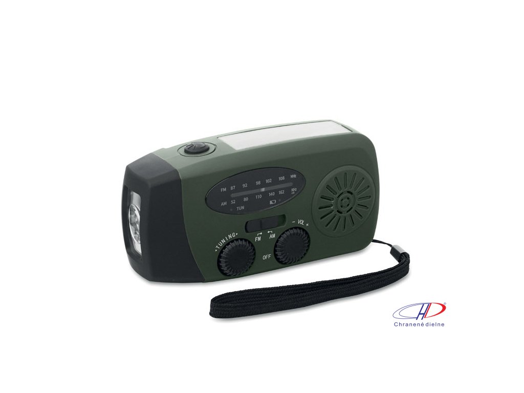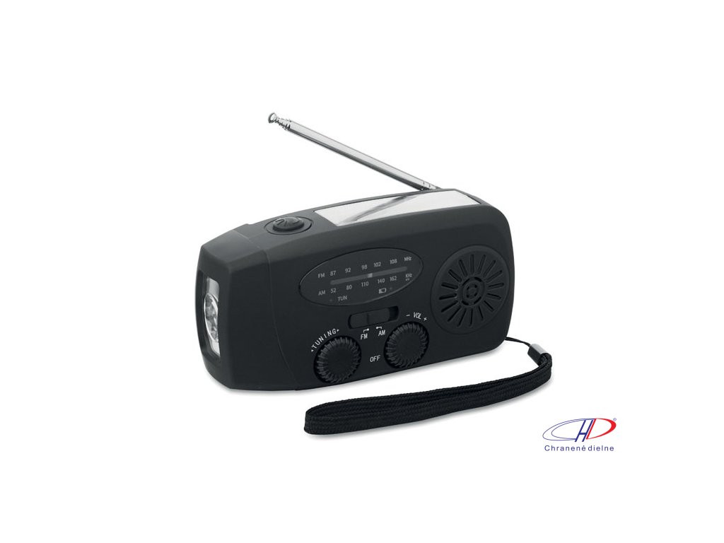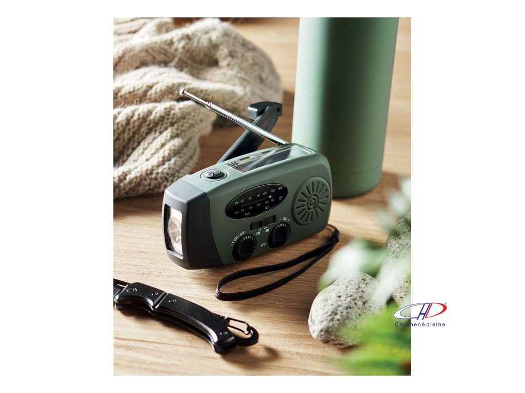Prenosné AM/FM rádio z ABS plastu s LED baterkou (2 nastavenia) a 1200 mAh powerbankou pre núdzové nabíjanie. Samostatné napájanie solárnou energiou a ručnou kľukou.Dodatočné parametre