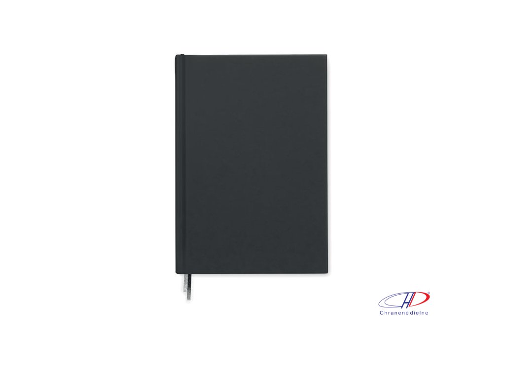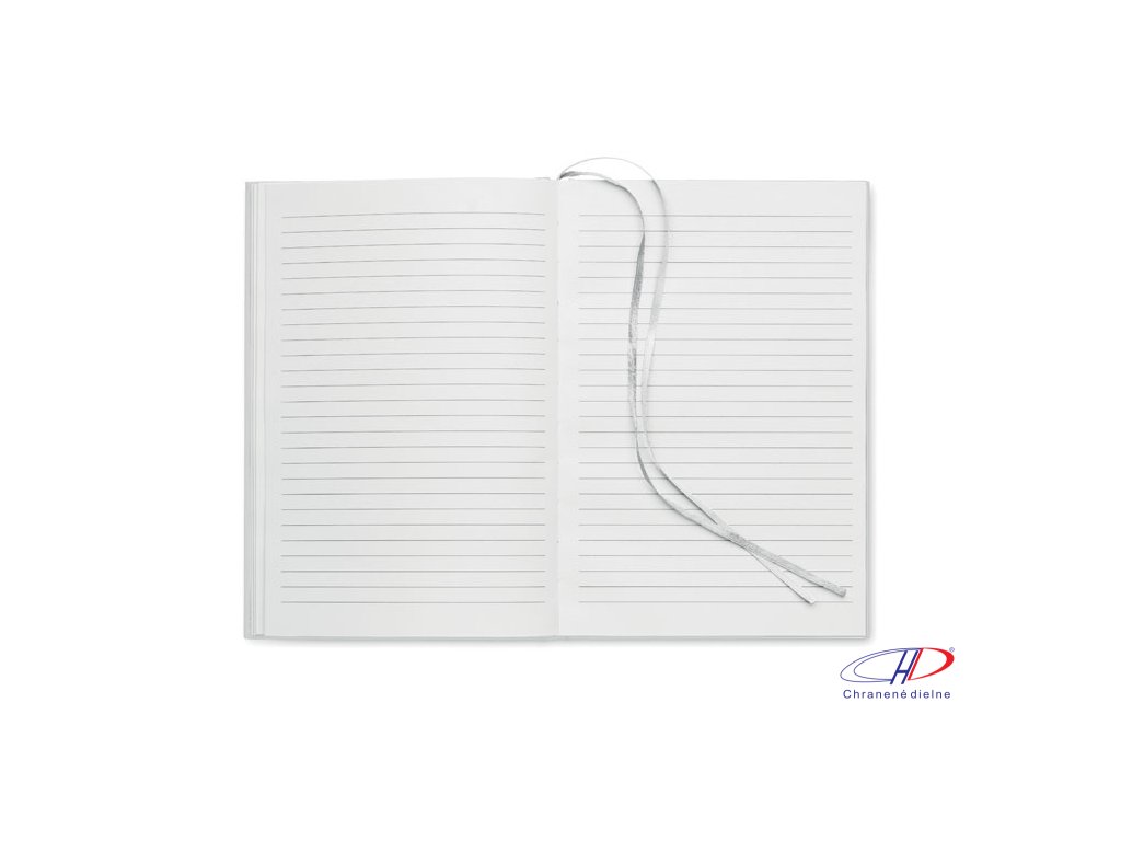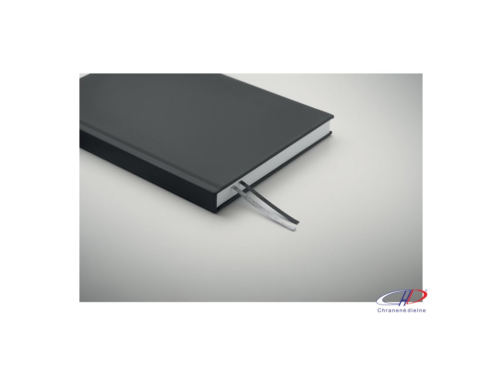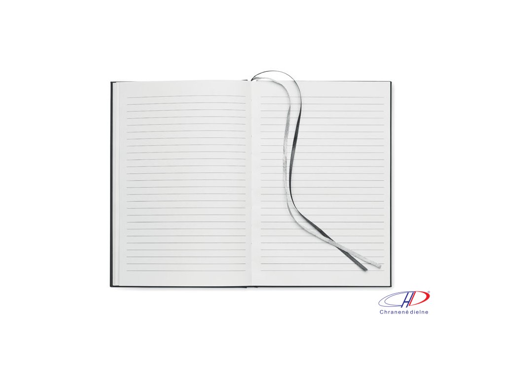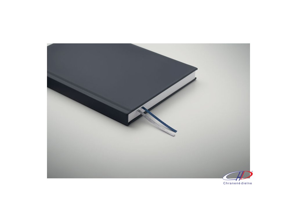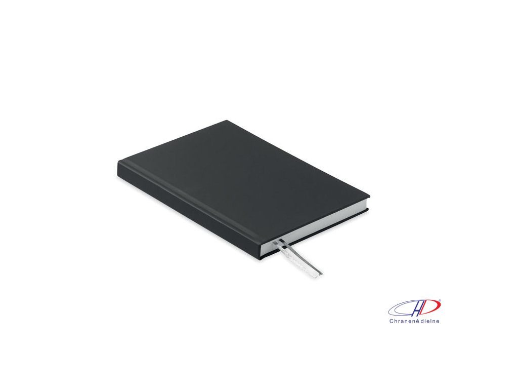 Zápisník A5 z 60 % recyklovaného polyesteru a 40 % PU. Viazaný v prebale. 256 linajkových strán z recyklovaného papiera s gramážou 70 g/m2 (128 listov). S 2 polyesterovými stuhami na označovanie strán.Dodatočné parametre