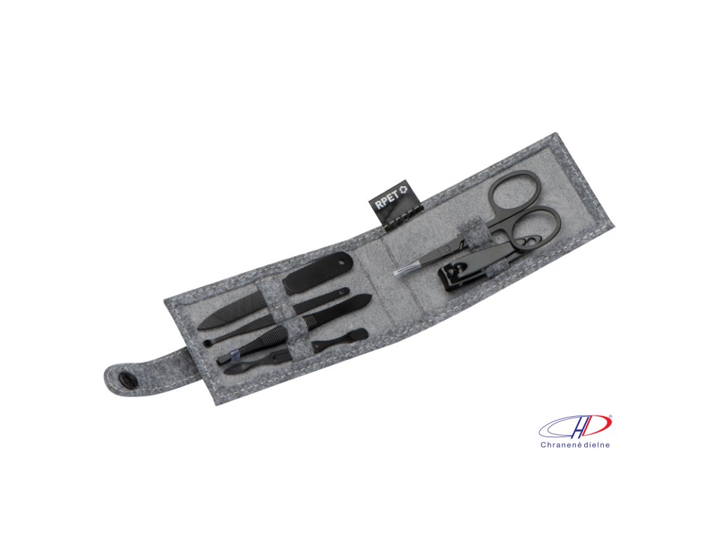 Manikúrová sada vyrobená z plsti RPET s príslušenstvom čiernej farby. Sada obsahuje nožničky, pilník na nechty, štipec na nechty, pinzetu a odstraňovač nechtovej kožičky.Dodatočné parametre