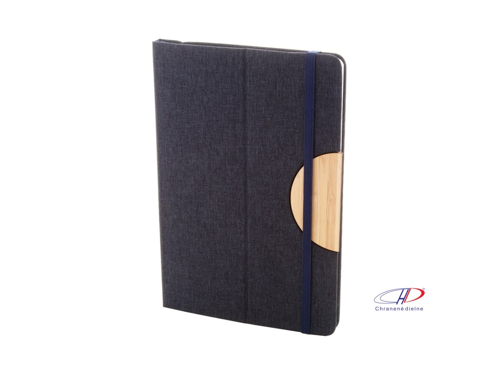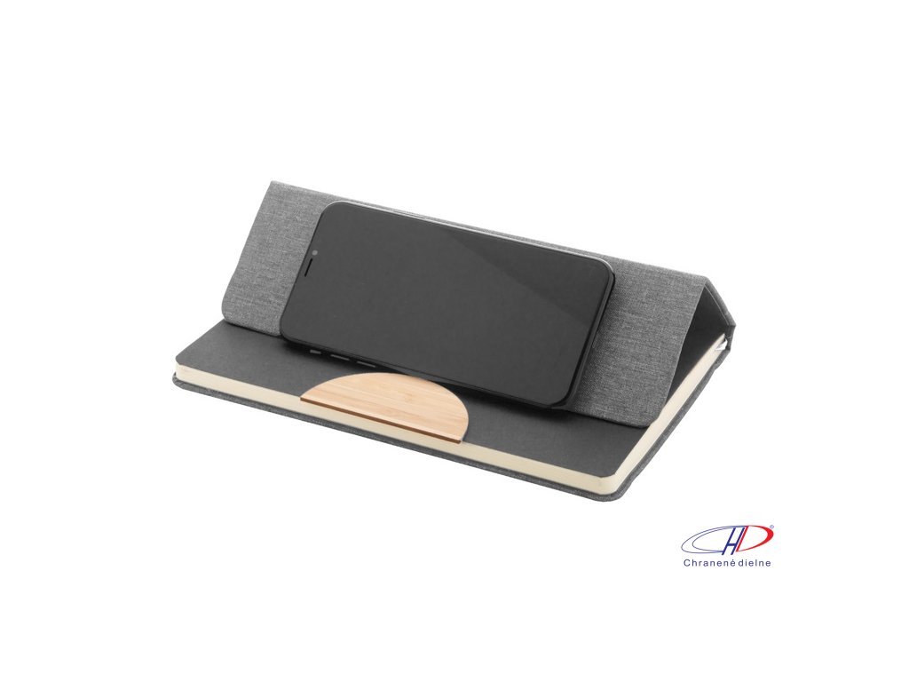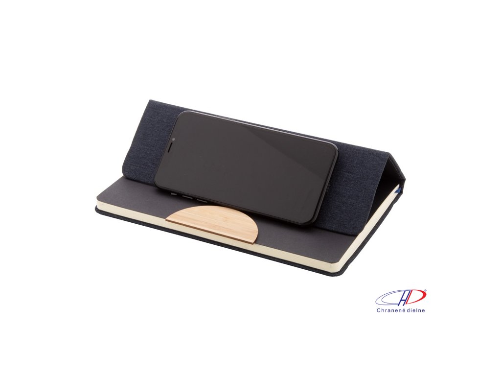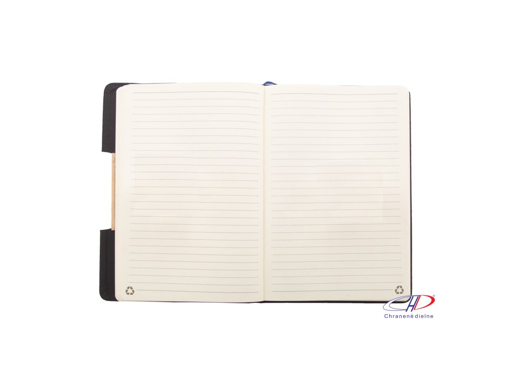 Blok A5 s doskami potiahnutými RPET s bambusovou vložkou a funkciou stojanu na mobil. 80 linajkových listov z recyklovaného papiera, záložka a gumička.Dodatočné parametre
