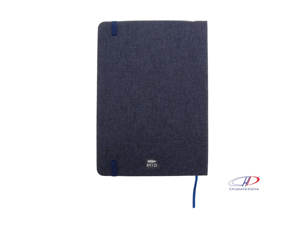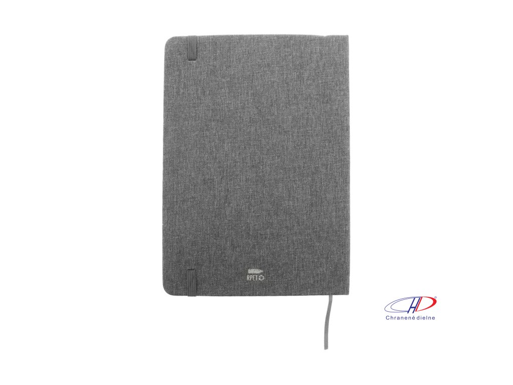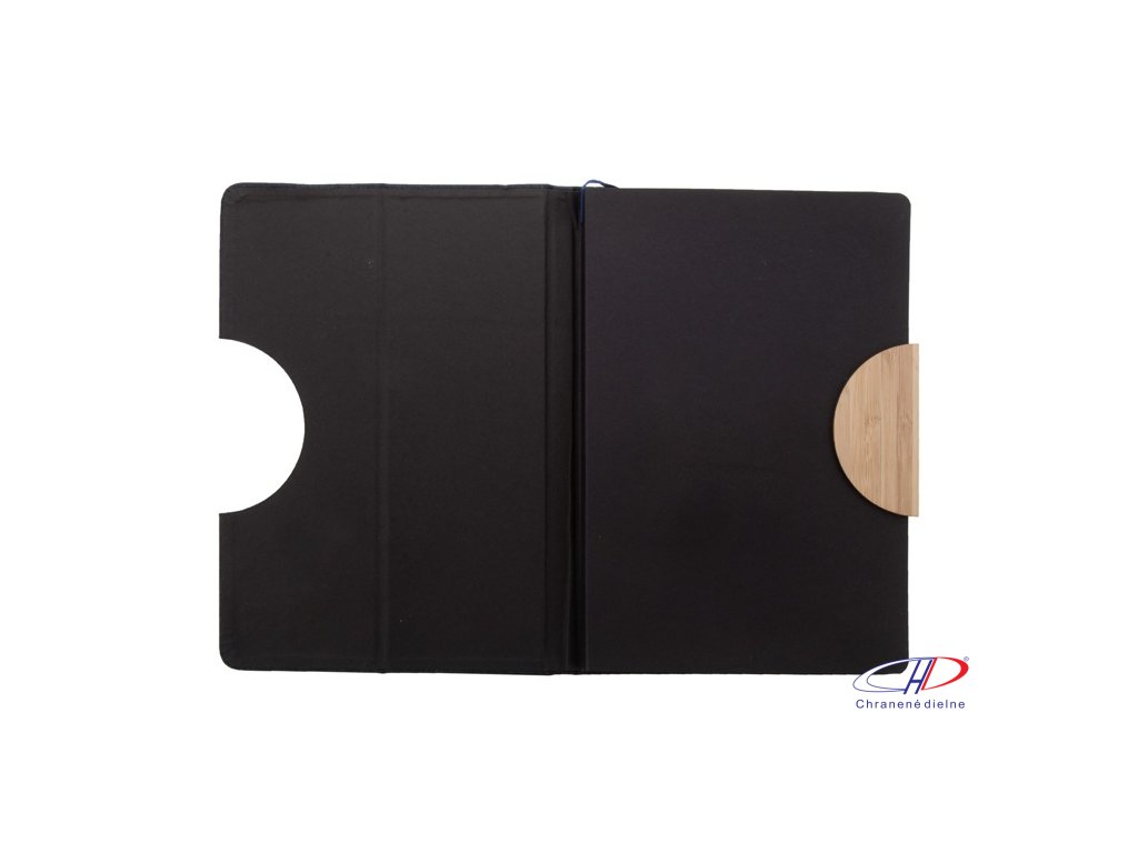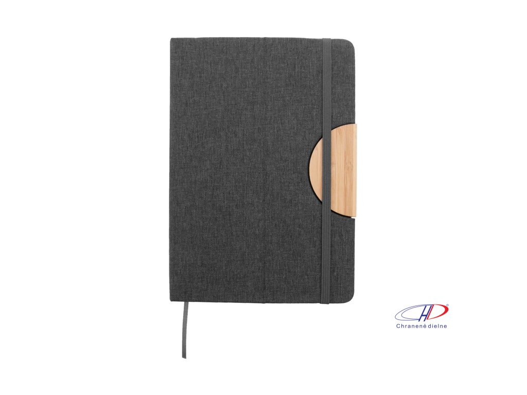 Blok A5 s doskami potiahnutými RPET s bambusovou vložkou a funkciou stojanu na mobil. 80 linajkových listov z recyklovaného papiera, záložka a gumička.Dodatočné parametre