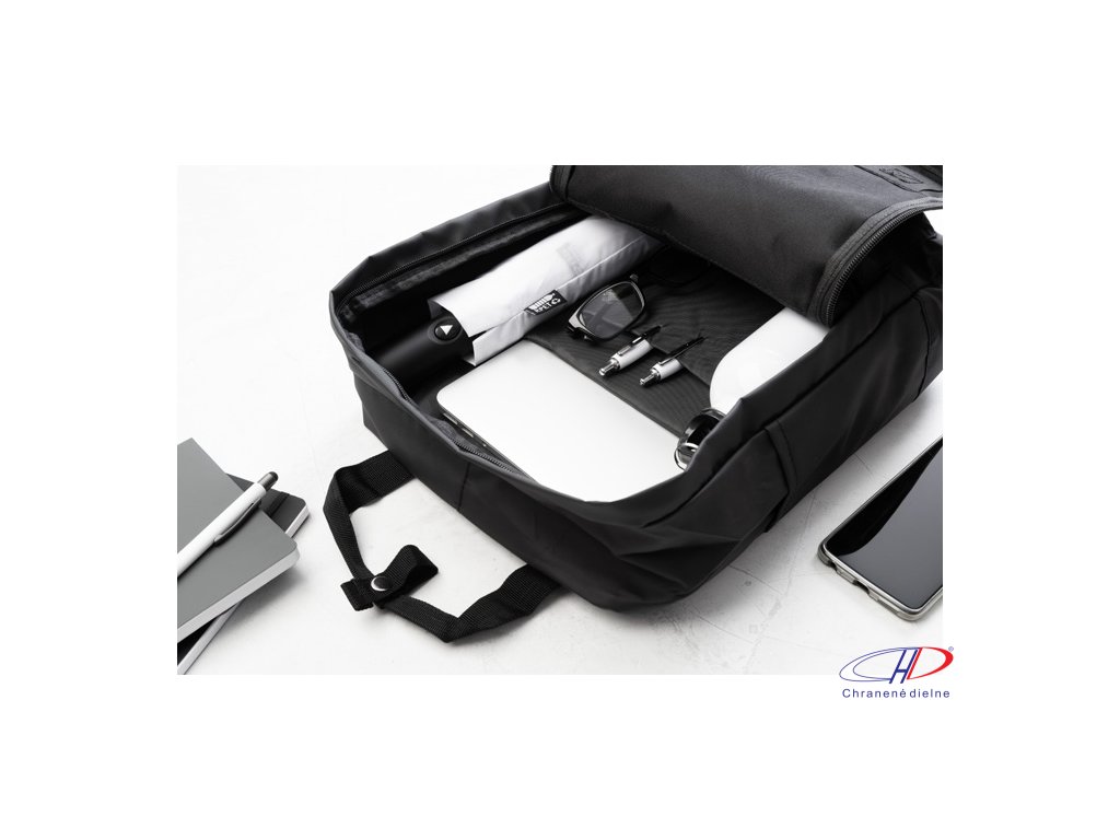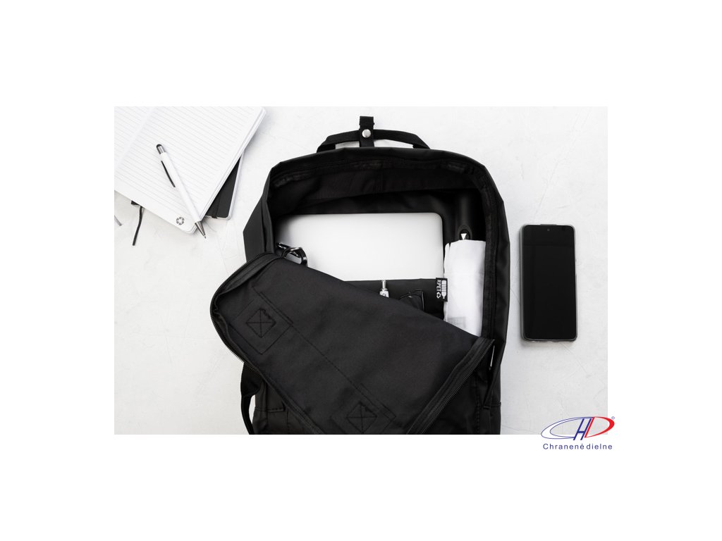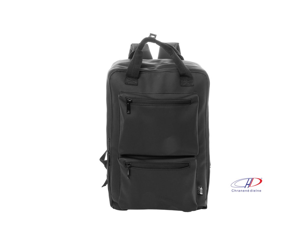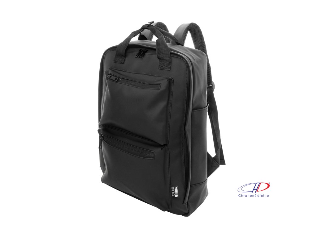 Vodotesný, mäkký batoh z recyklovanej PU kože s hlavným oddielom na zips, 2 prednými vreckami na zips, bočnými vreckami a polstrovanou priehradkou na notebook (15") a tablet (10") S polstrovaným chrbtom a popruhmi. S výrazným recyklovaným PU štítkom.Dodatočné parametre