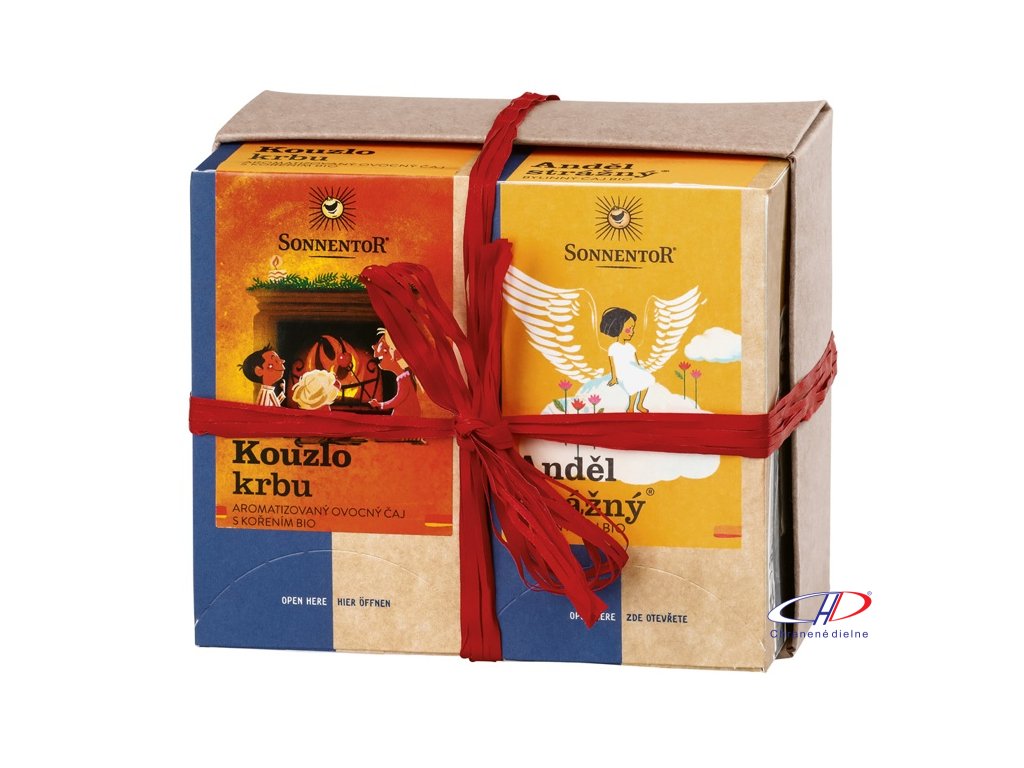 Darčeková sada 2 organických čajov Sonnentor. Obsahuje ovocný čaj Kúzlo krbu a bylinkový čaj Anjel strážny, 2× 18 vrecúšok. V prípade záujmu o viac ako 10 kusov nás kontaktujte ohľadom cenovej ponuky.Dodatočné parametre