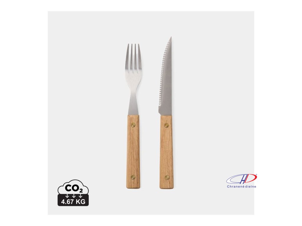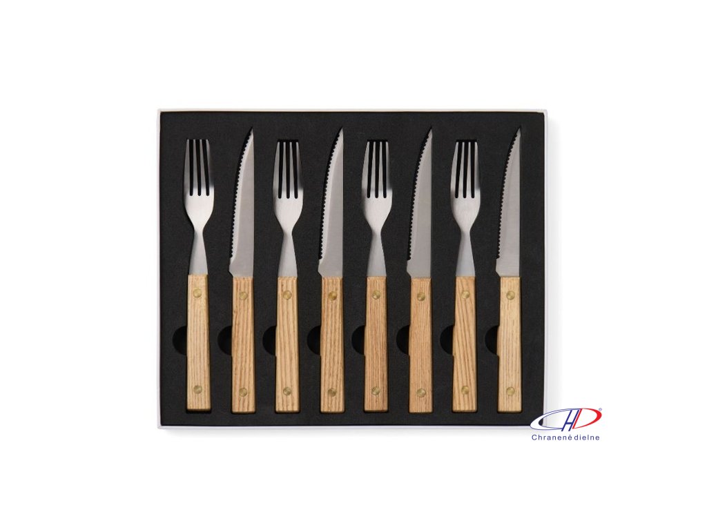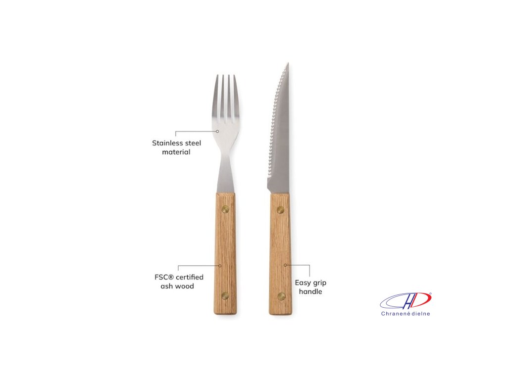 Táto 8-diela sada v škandinávskom štýle je vyrobená z jaseňového dreva s certifikátom FSC® a vysoko kvalitnej nerezovej ocele. Súprava obsahuje štyri ostré nože a štyri vidličky.Dodatočné parametre