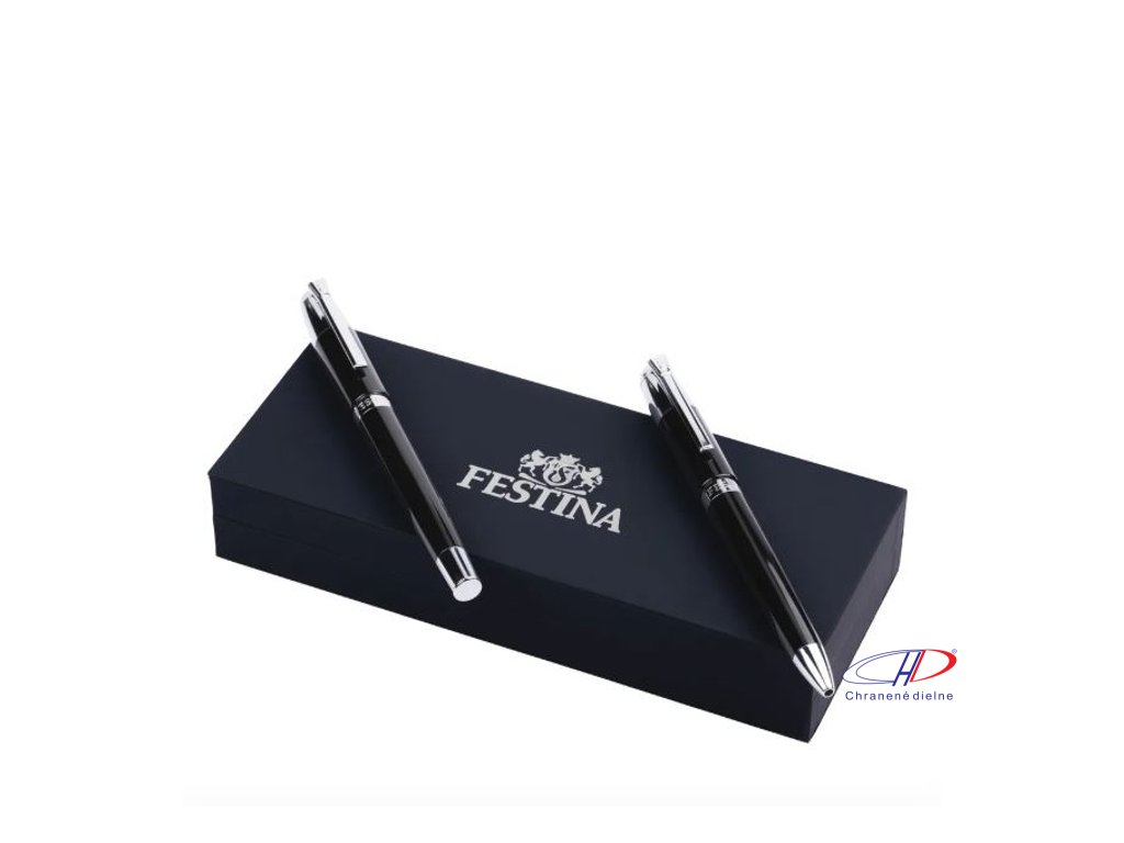 Sada v darčekovom balení obsahuje guľôčkové pero a roller Festina Classicals Chrome, oboje s čiernou náplňou.