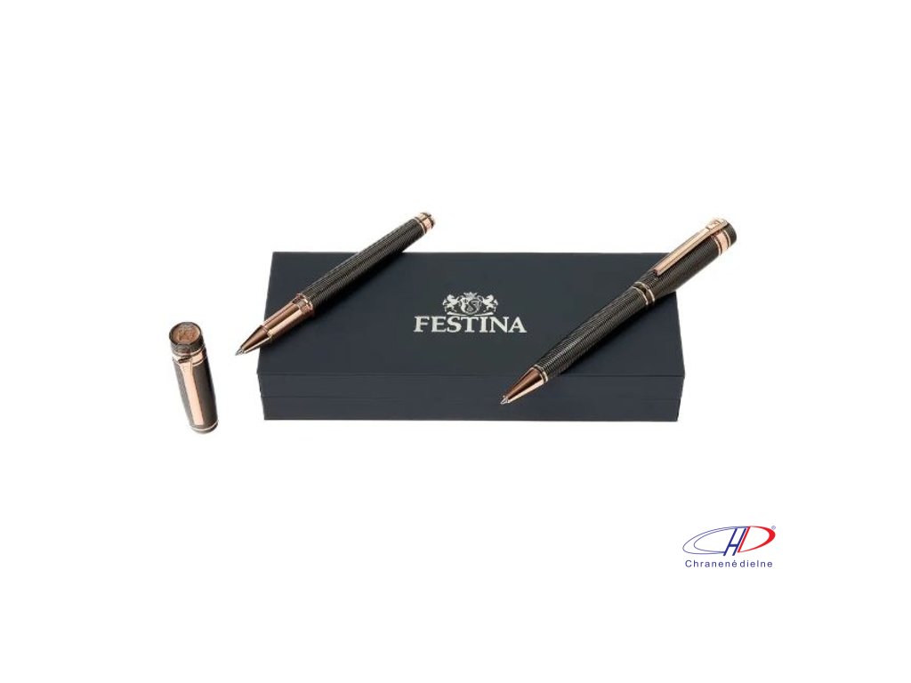 Sada v darčekovom balení obsahuje guľôčkové pero a roller Festina Bold Stripe, oboje s čiernou náplňou.