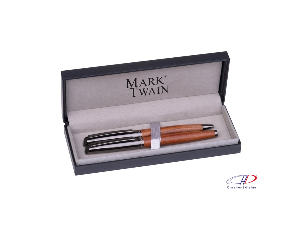 Písacia sada Mark Twain vyrobená z nehrdzavejúcej ocele a dreva. Guľôčkové pero s modrým atramentom, dĺžka písania 1200 m; roller s modrým atramentom, dĺžka písania 400 m.Dodatočné parametre