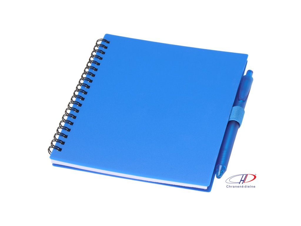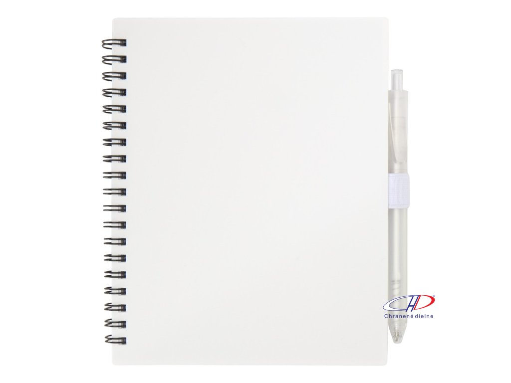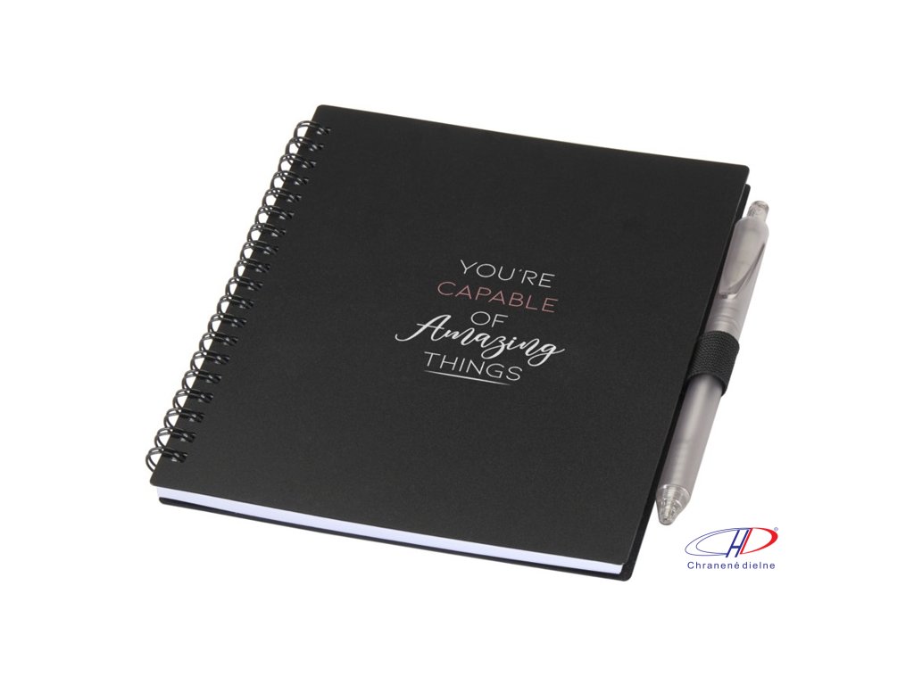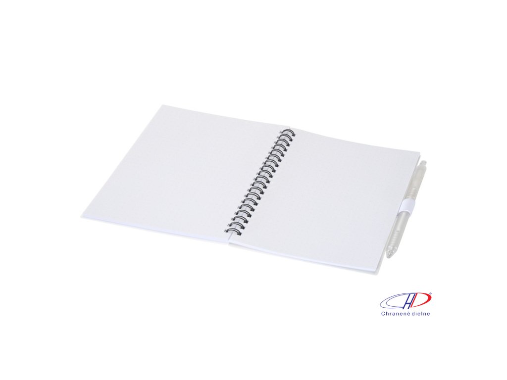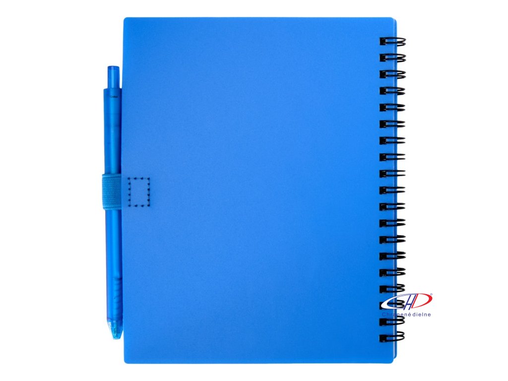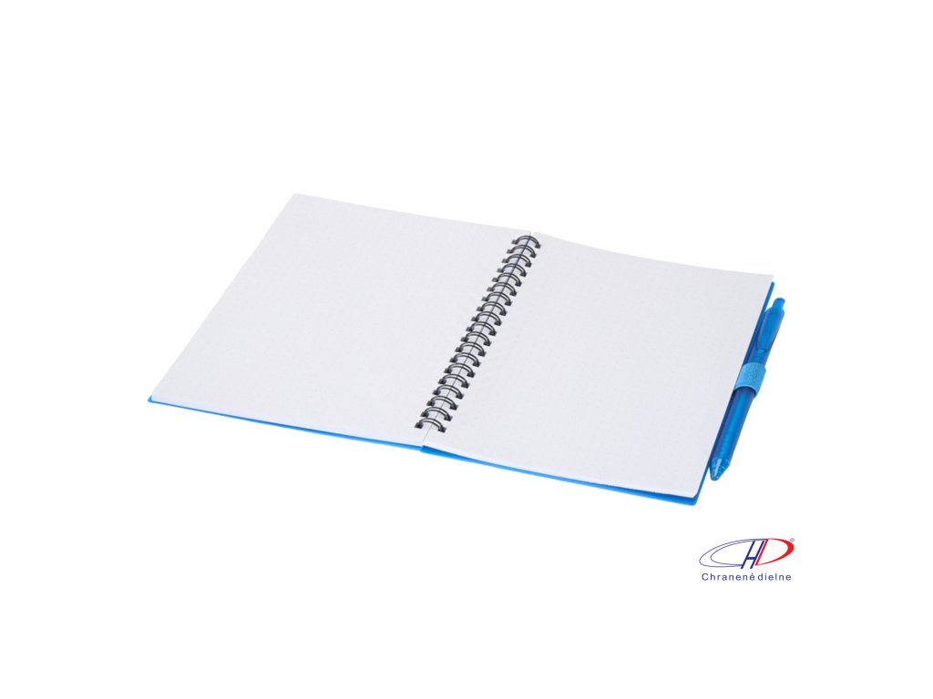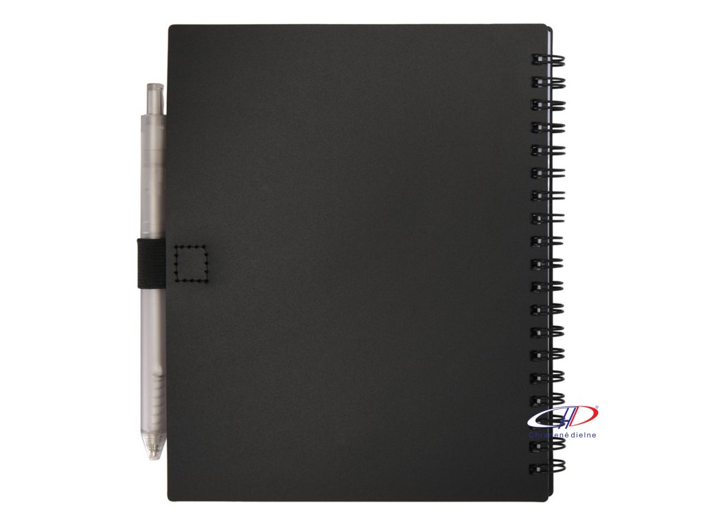 Zápisník s mäkkou väzbou z recyklovaného plastu a má 70 bodkovaných listov papiera 70 g/m2. Zaoblené rohy a pútko na pero. Veľkosť zápisníka: 140 × 178 mm. Guľôčkové pero z recyklovaného plastu (modrá náplň, dĺžka písania 1000 metrov, hrot 1,0 mm)Dodatočné parametre