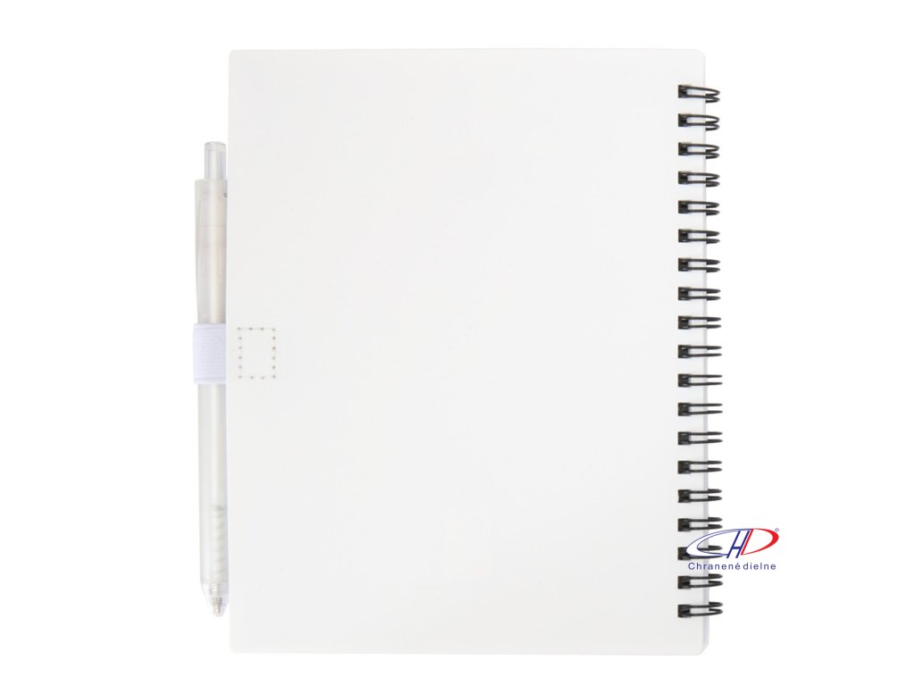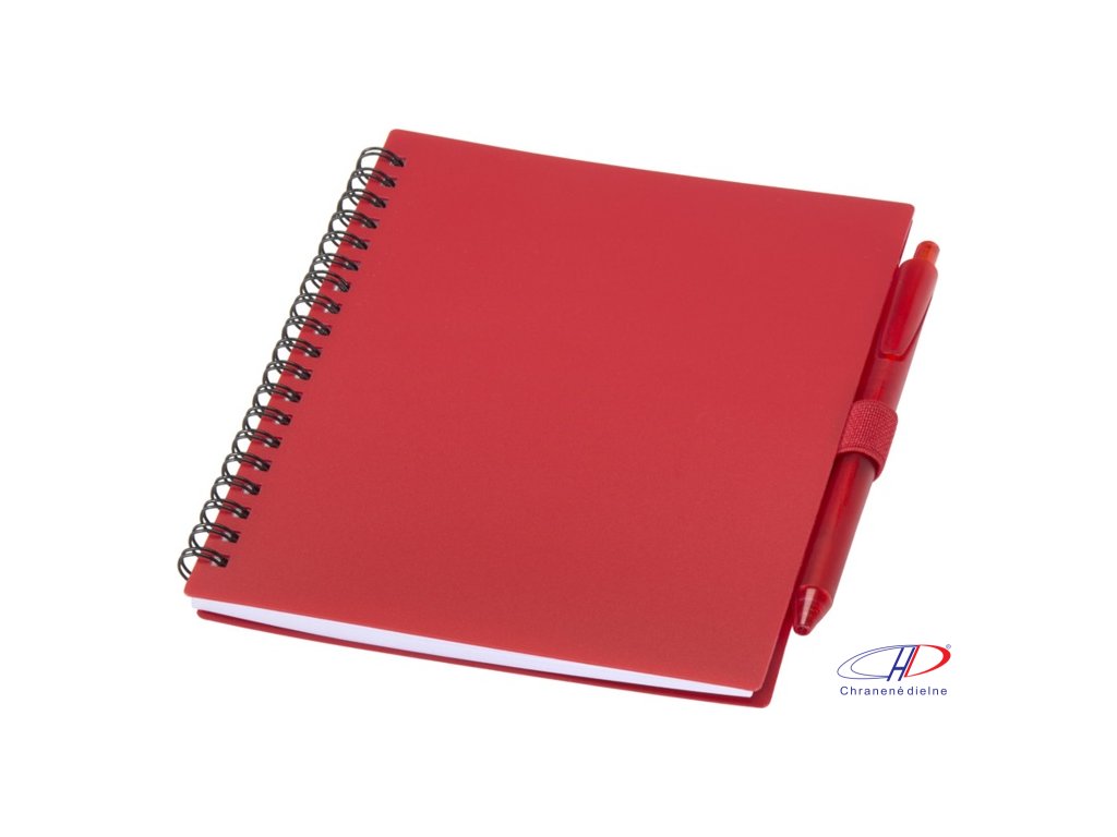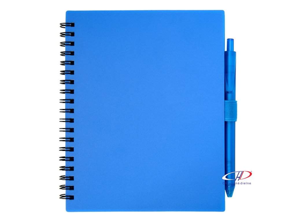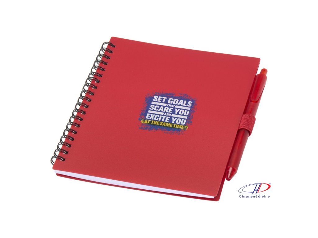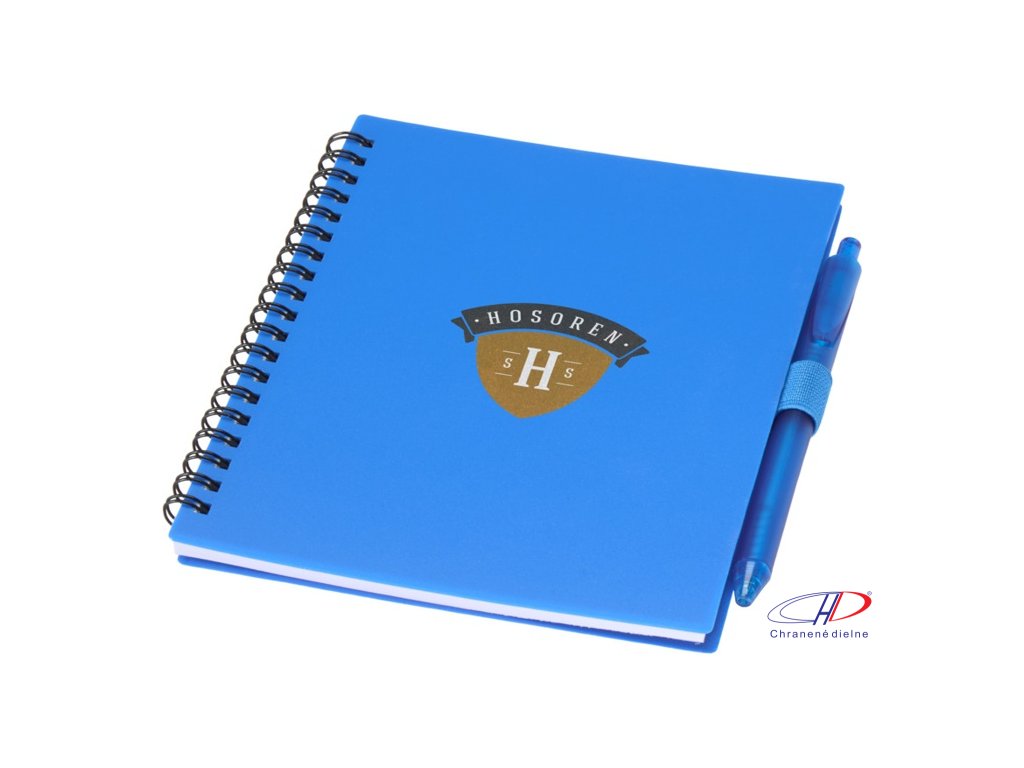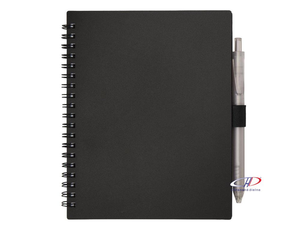 Zápisník s mäkkou väzbou z recyklovaného plastu a má 70 bodkovaných listov papiera 70 g/m2. Zaoblené rohy a pútko na pero. Veľkosť zápisníka: 140 × 178 mm. Guľôčkové pero z recyklovaného plastu (modrá náplň, dĺžka písania 1000 metrov, hrot 1,0 mm)Dodatočné parametre