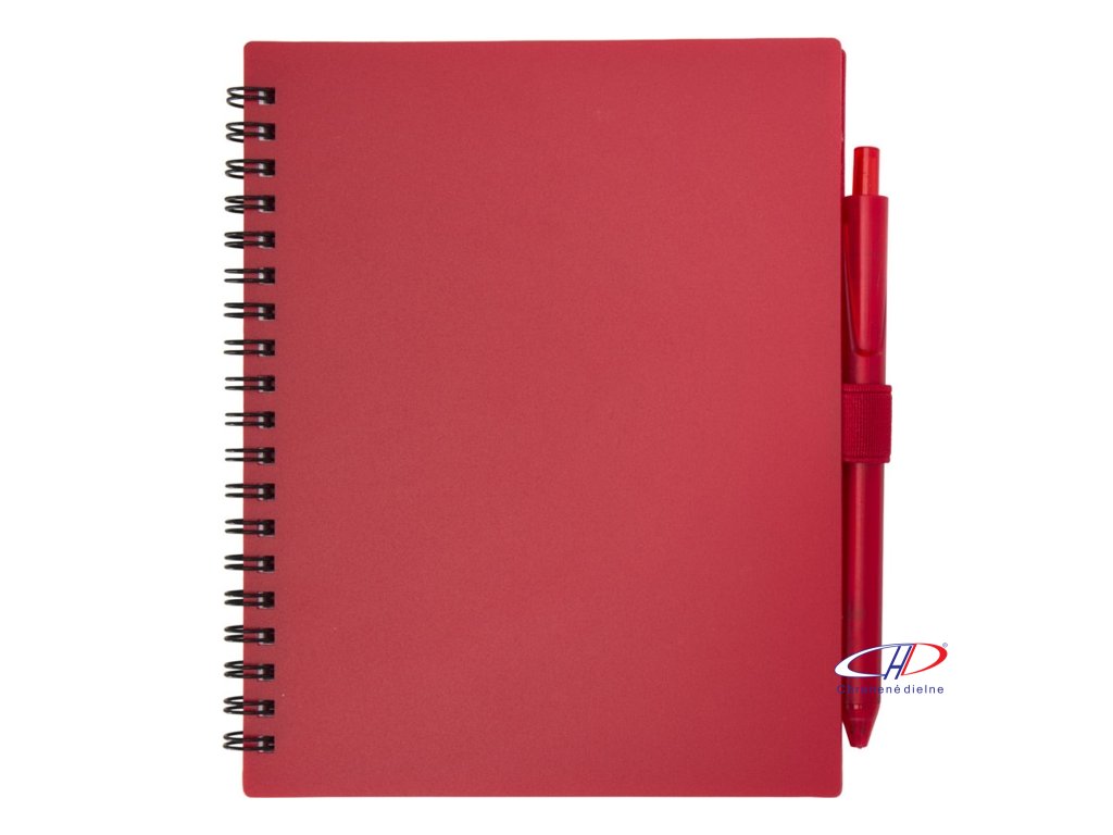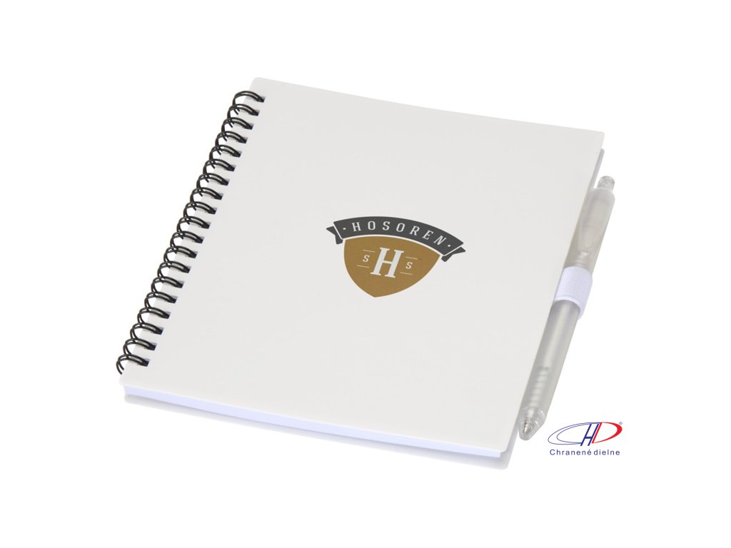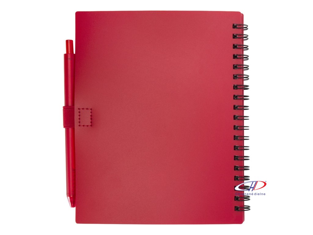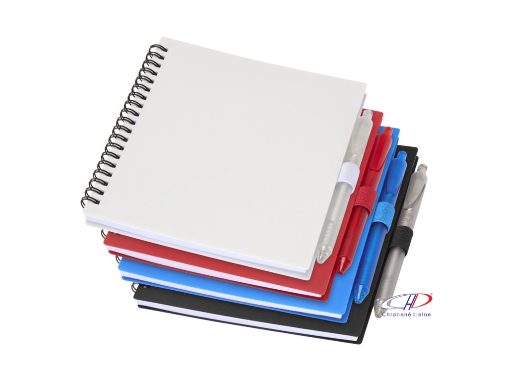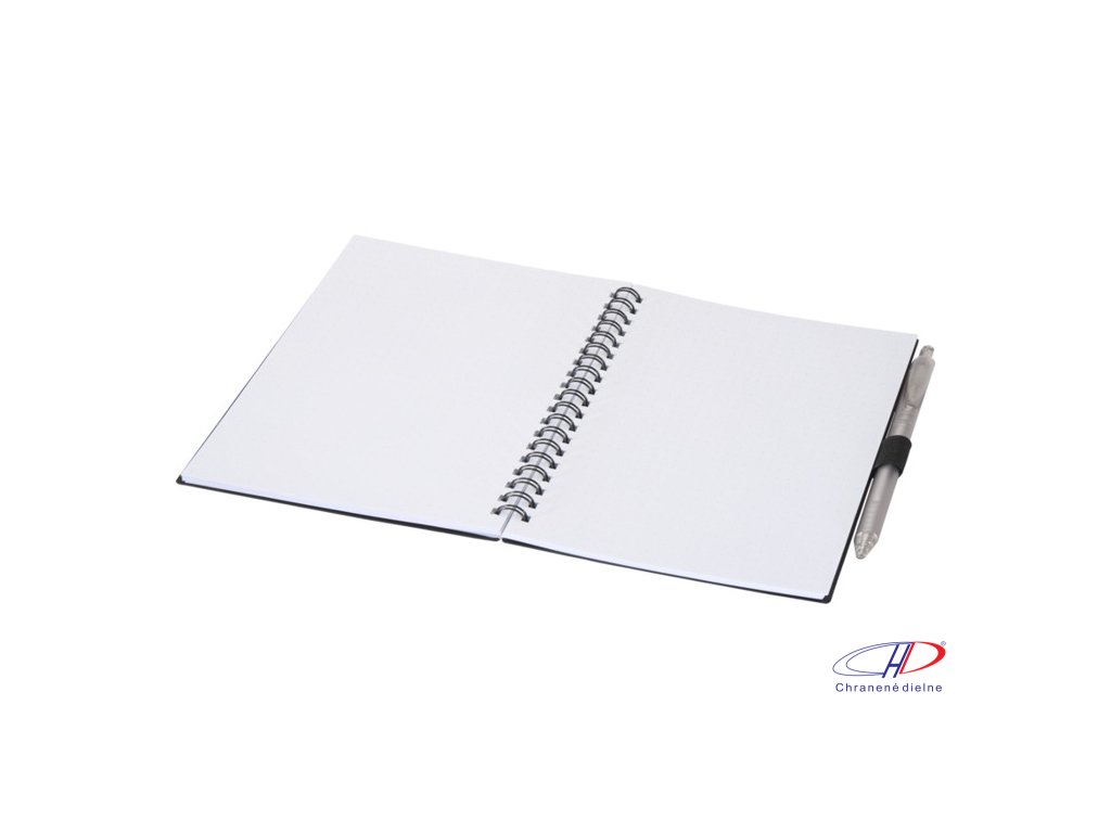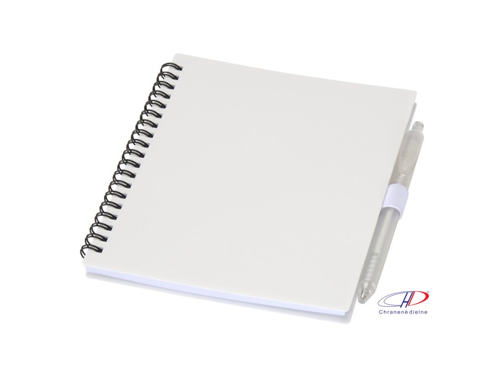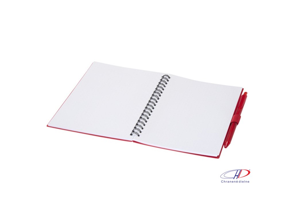 Zápisník s mäkkou väzbou z recyklovaného plastu a má 70 bodkovaných listov papiera 70 g/m2. Zaoblené rohy a pútko na pero. Veľkosť zápisníka: 140 × 178 mm. Guľôčkové pero z recyklovaného plastu (modrá náplň, dĺžka písania 1000 metrov, hrot 1,0 mm)Dodatočné parametre