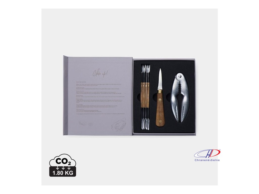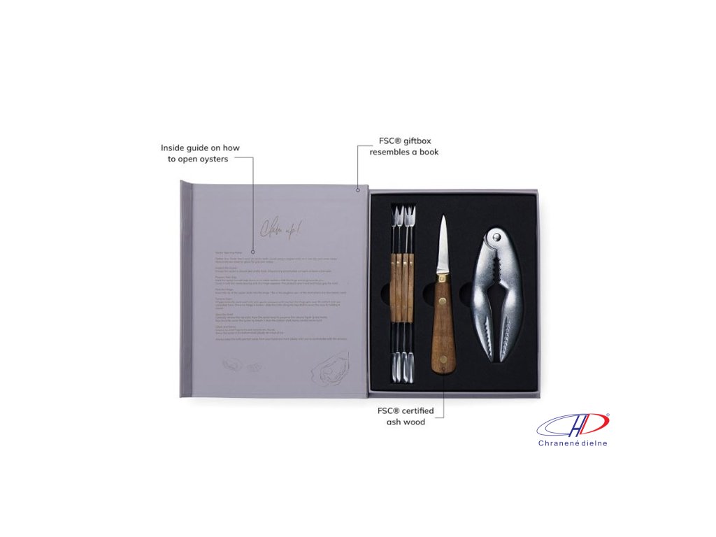 Sada je elegantne zabalená v darčekovej krabici FSC®, ktorá pripomína klasickú knihu. Obsahuje nôž na ustrice, luskáčik na mušle a štyri vidličky na morské plody, ktoré sú precízne vyrobené z nerezovej ocele a jaseňového dreva s certifikáciou FSC®.Dodatočné parametre