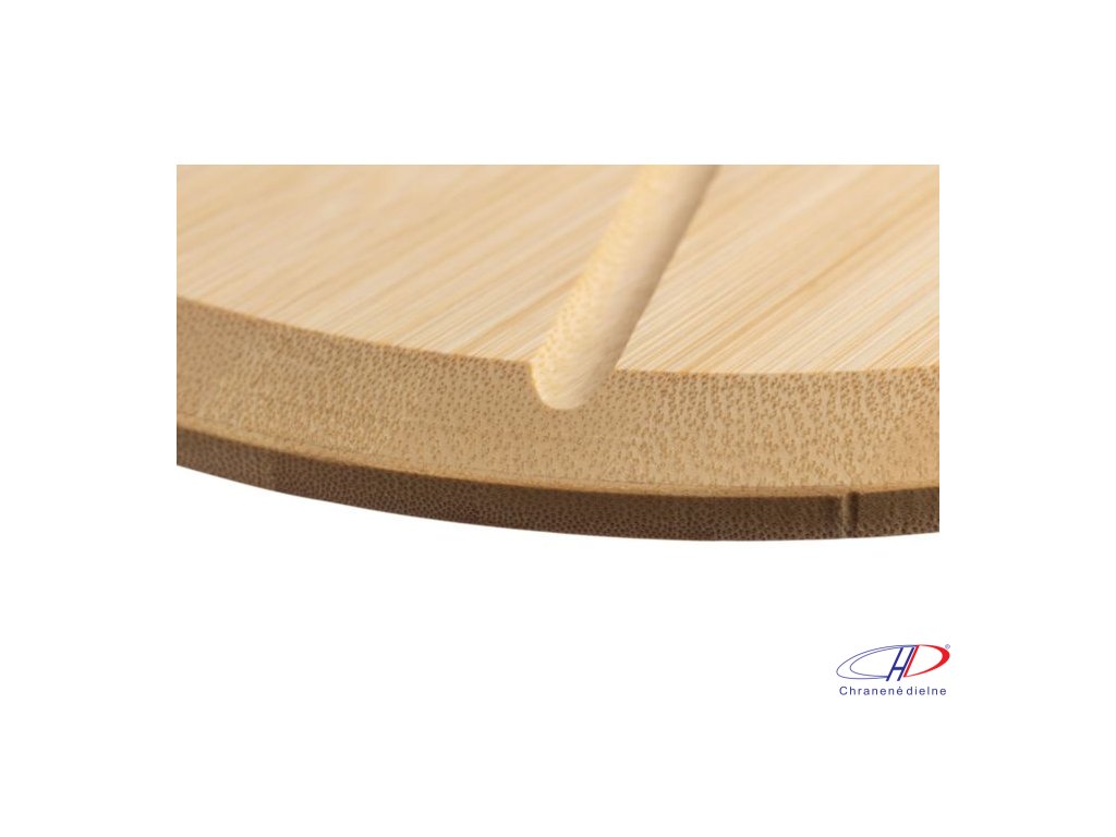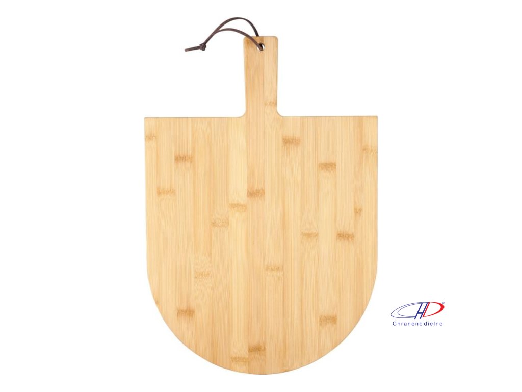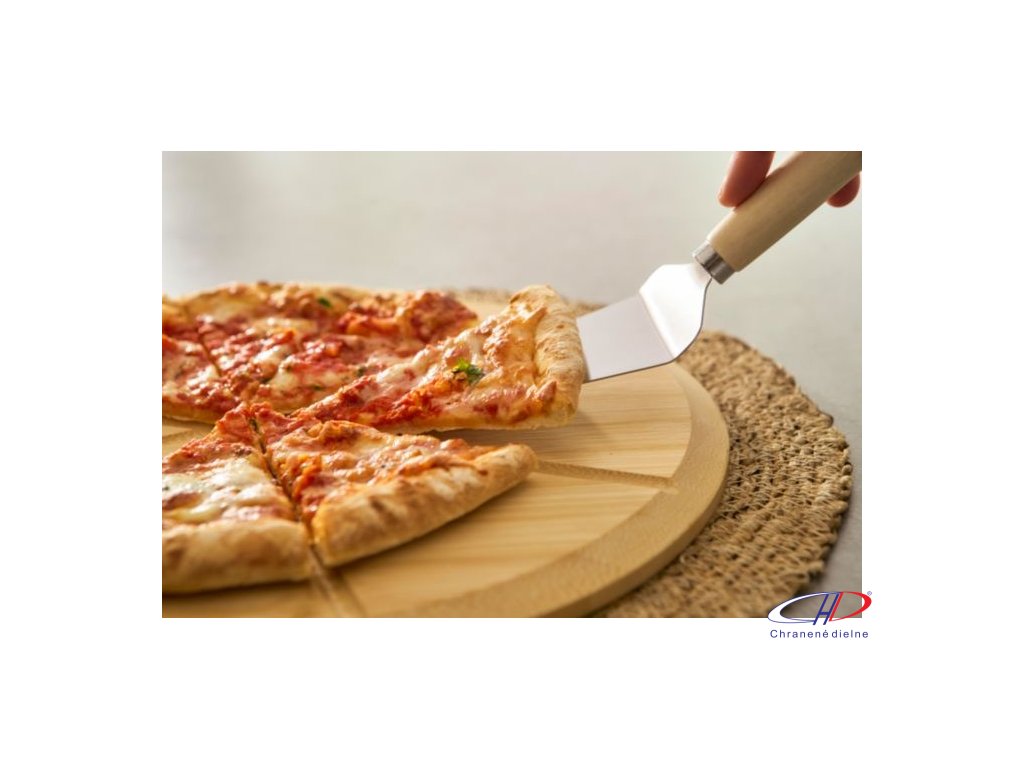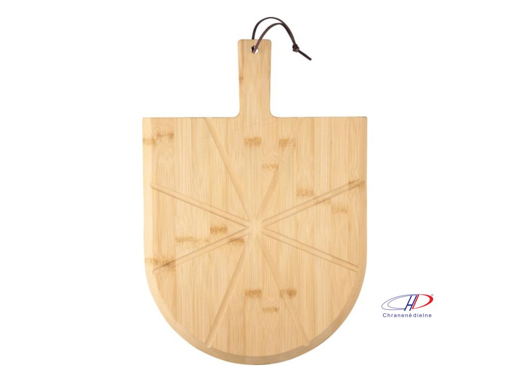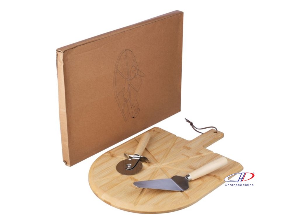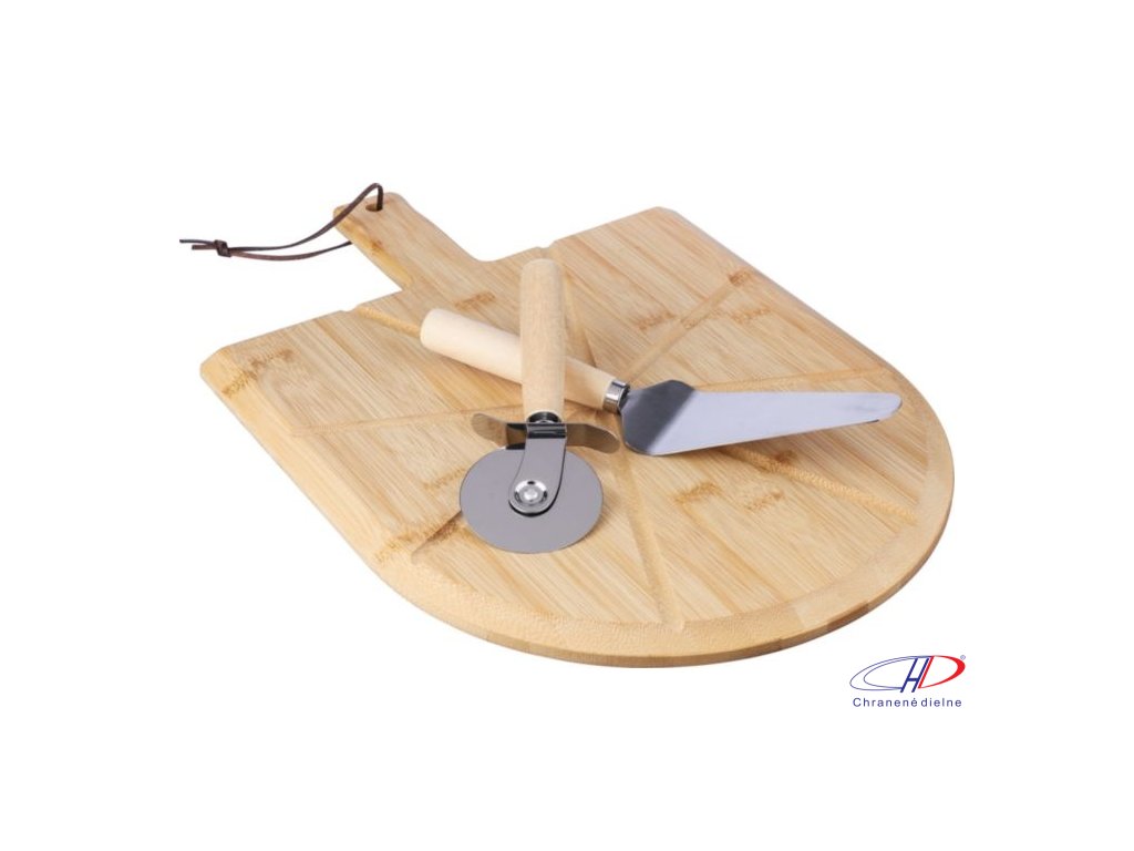 Bambusová doska na pizzu s rukoväťou a predrezanými vodiacimi lištami pre jednoduché servírovanie. Súčasťou je krájač a špachtľa z nehrdzavejúcej ocele a bukového dreva. Na rukoväti je PU závesná šnúrka. Jednotlivo balené v hnedej kartónovej krabici.Dodatočné parametre