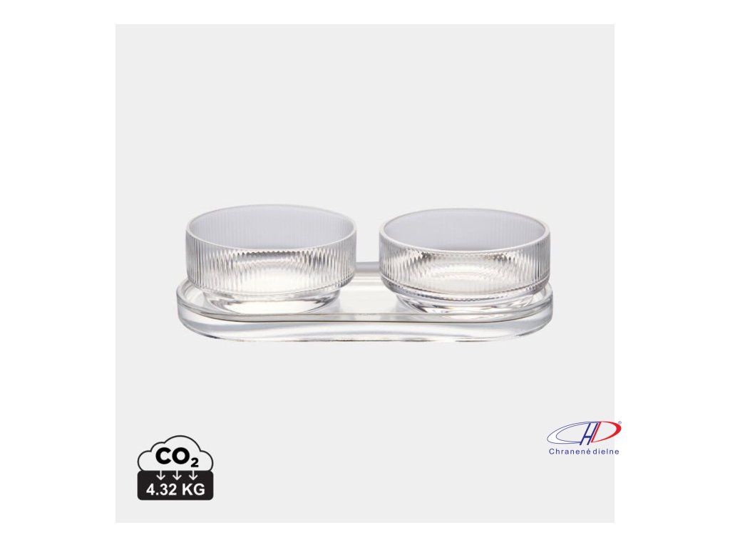 Sada na tapas s nadčasovým dizajnom a klasickými, čistými líniami. Sada obsahuje dve misky a podnos, ktoré sa dajú používať spoločne alebo samostatne. Vyrobené zo sódovo-vápenatého skla. Misky majú objem 250 ml. Vhodné do umývačky riadu.Dodatočné parametre