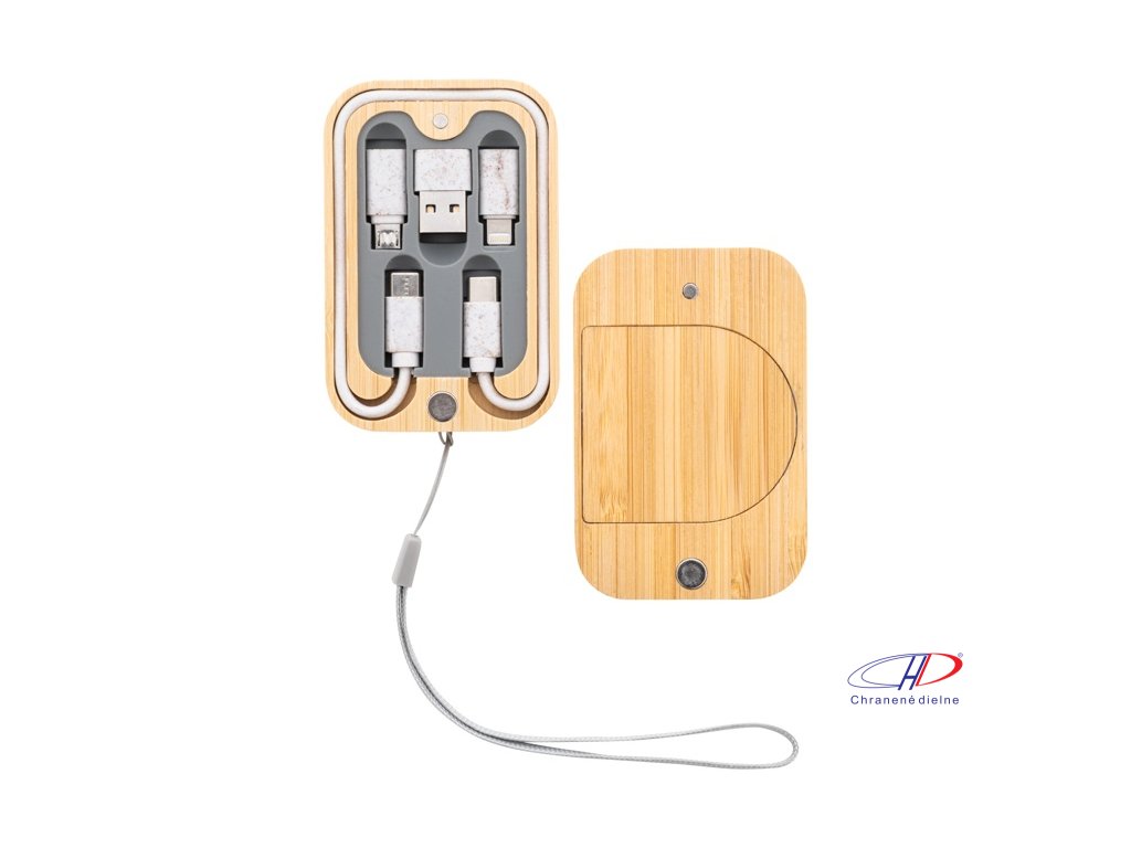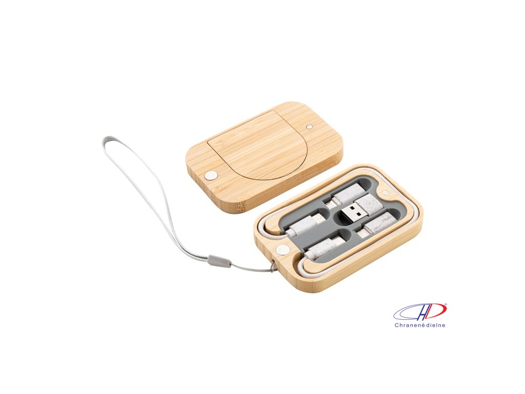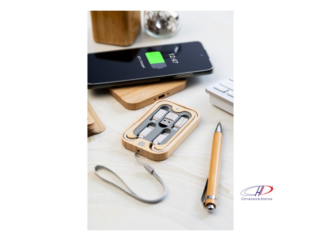 Ekologická sada USB nabíjacieho kábla z pšeničnej slamy a bezdrôtovej rýchlonabíjačky (15W) v magnetickom bambusovom puzdre s popruhom. Vrátane kábla USB-C s adaptérmi USB, micro USB a Lightning.Dodatočné parametre