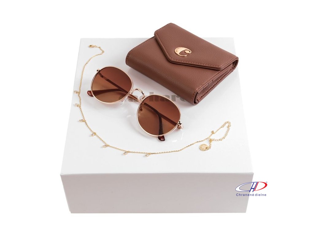 Dámska sada v darčekovom balení obsahuje malú peňaženku, náramok a slnečné okuliare.