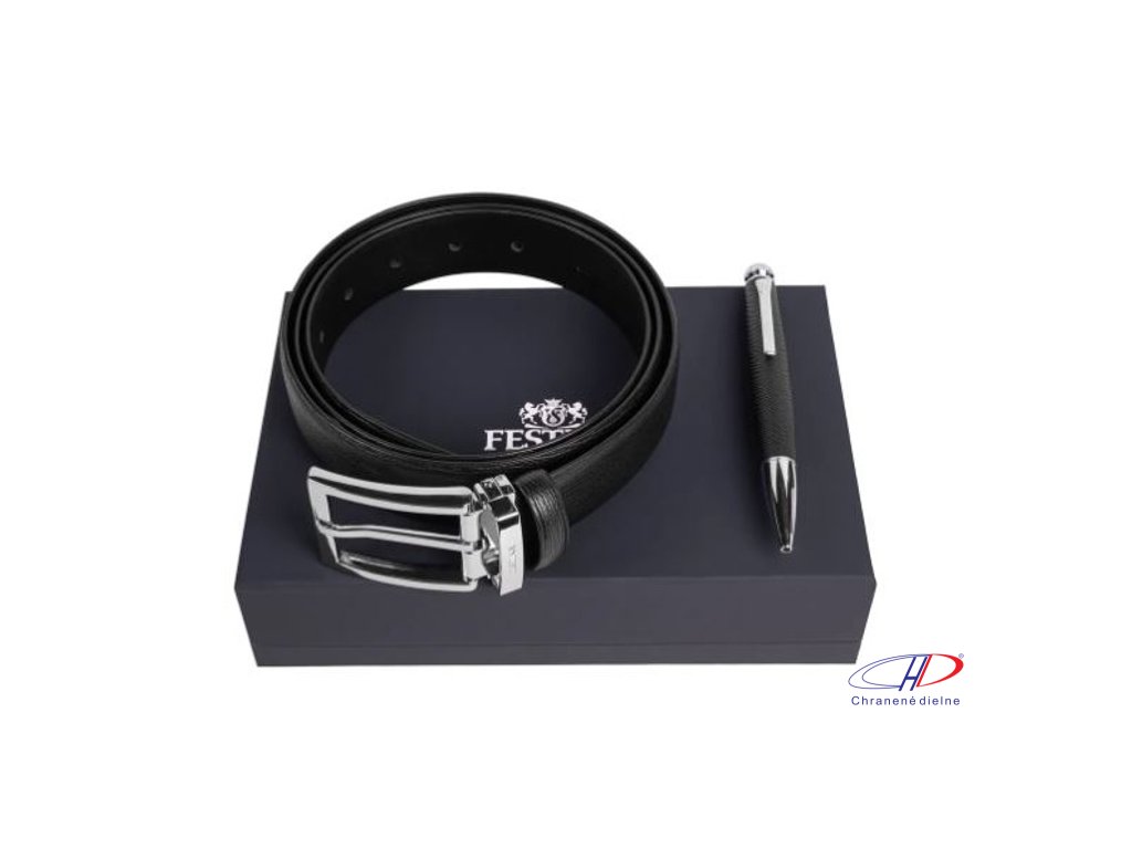 Pánska sada v darčekovom balení obsahuje guľôčkové pero s povrchom z vegánskej kože (čierna náplň) a pánsky kožený opasok (125 x 3,3 cm).Dodatočné parametre