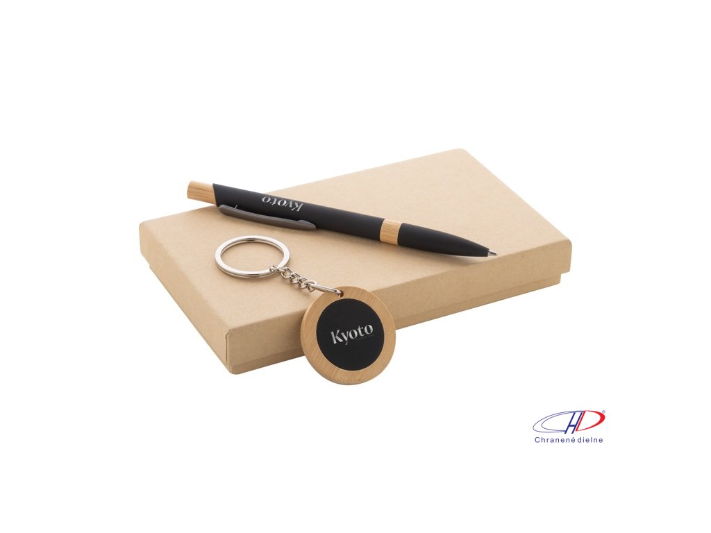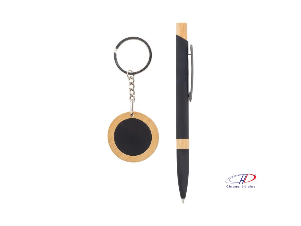 Sada obsahuje pogumované guľôčkové pero z recyklovaného hliníka (modrá náplň) a bambusovú kľúčenku s pogumovaným povrchom z recyklovanej nerezovej ocele. Obe položky majú špeciálnu povrchovú úpravu na zrkadlové laserové gravírovanie.Dodatočné parametre