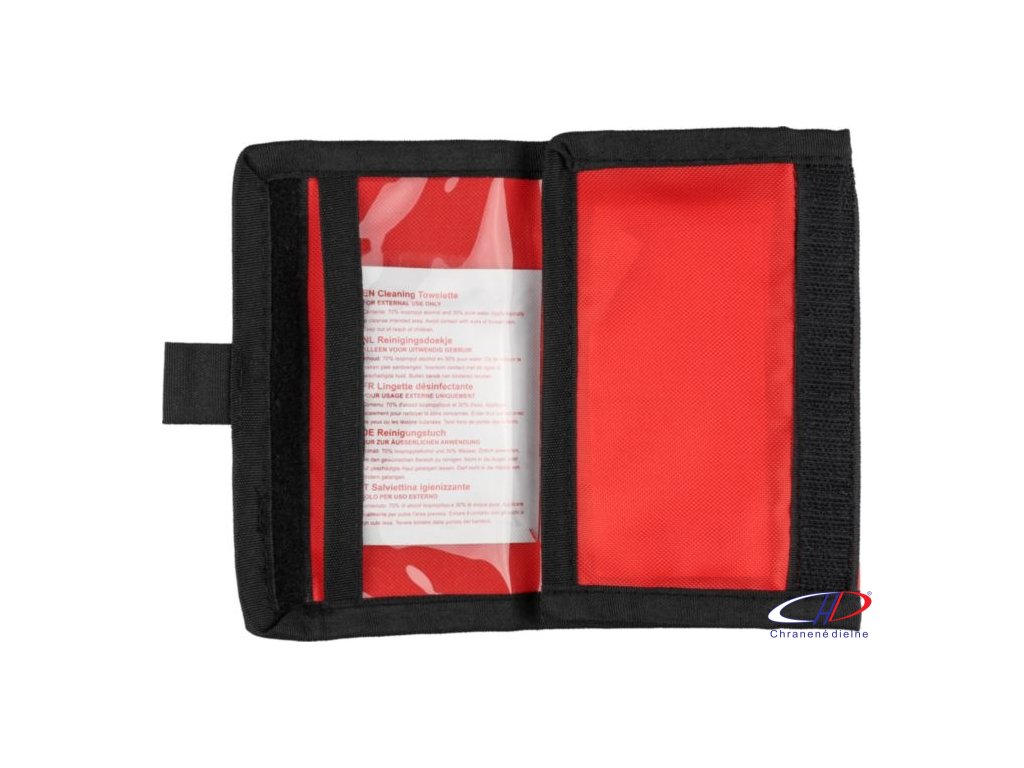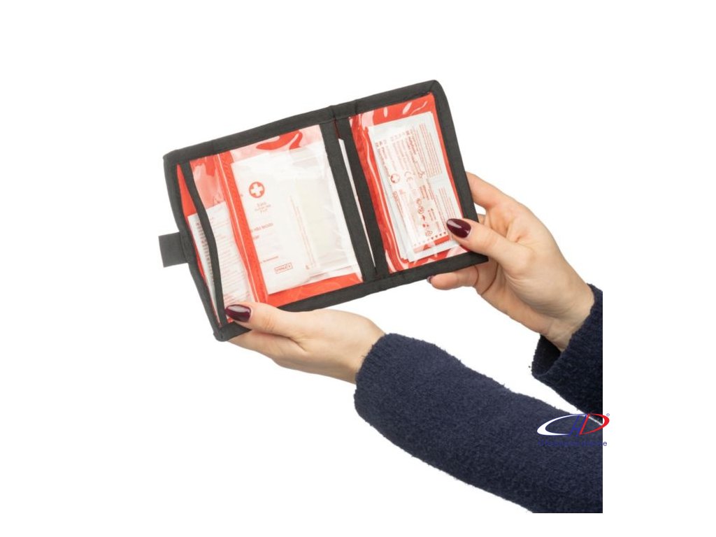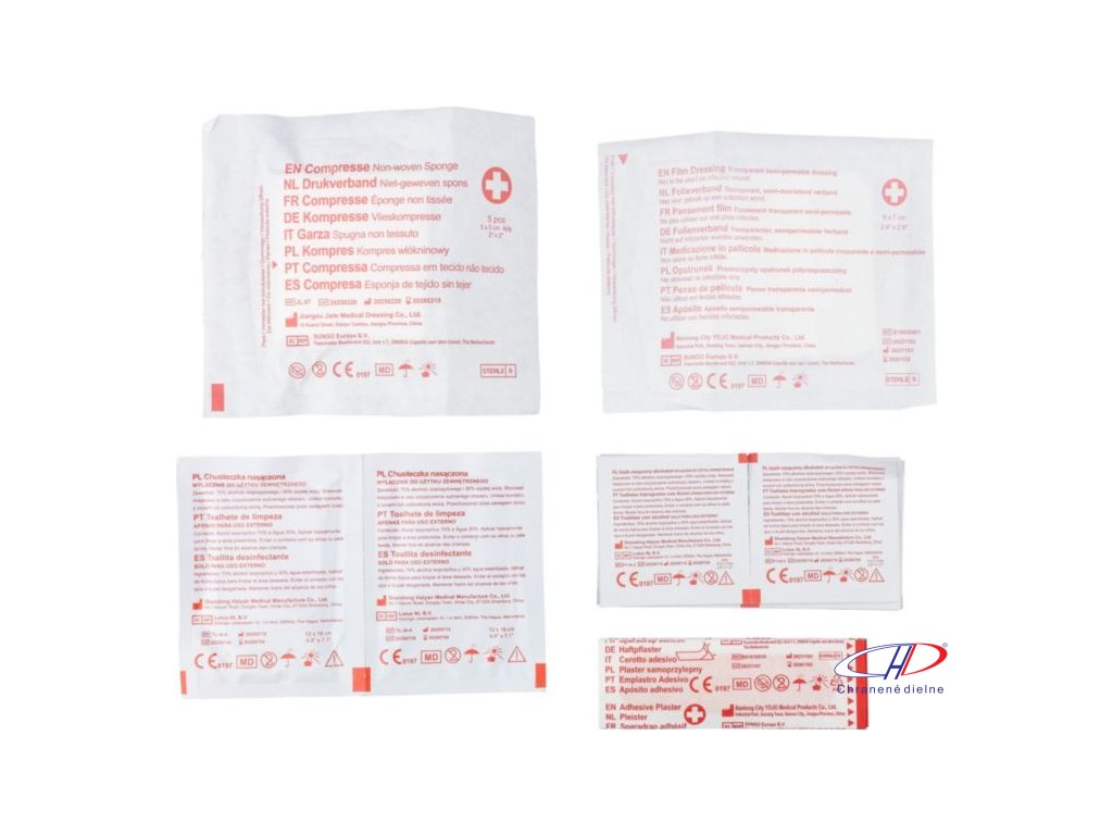 Lekárnička v obale z rPET 600D so zapínaním na suchý zips a pútkom na prenášanie. Obsahuje PVC vrecká a 17 častí: 5 náplastí, 1 sterilný filmový obväz, 1 netkanú špongiu, 8 alkoholových tampónov, 2 čistiace obrúsky.Dodatočné parametre