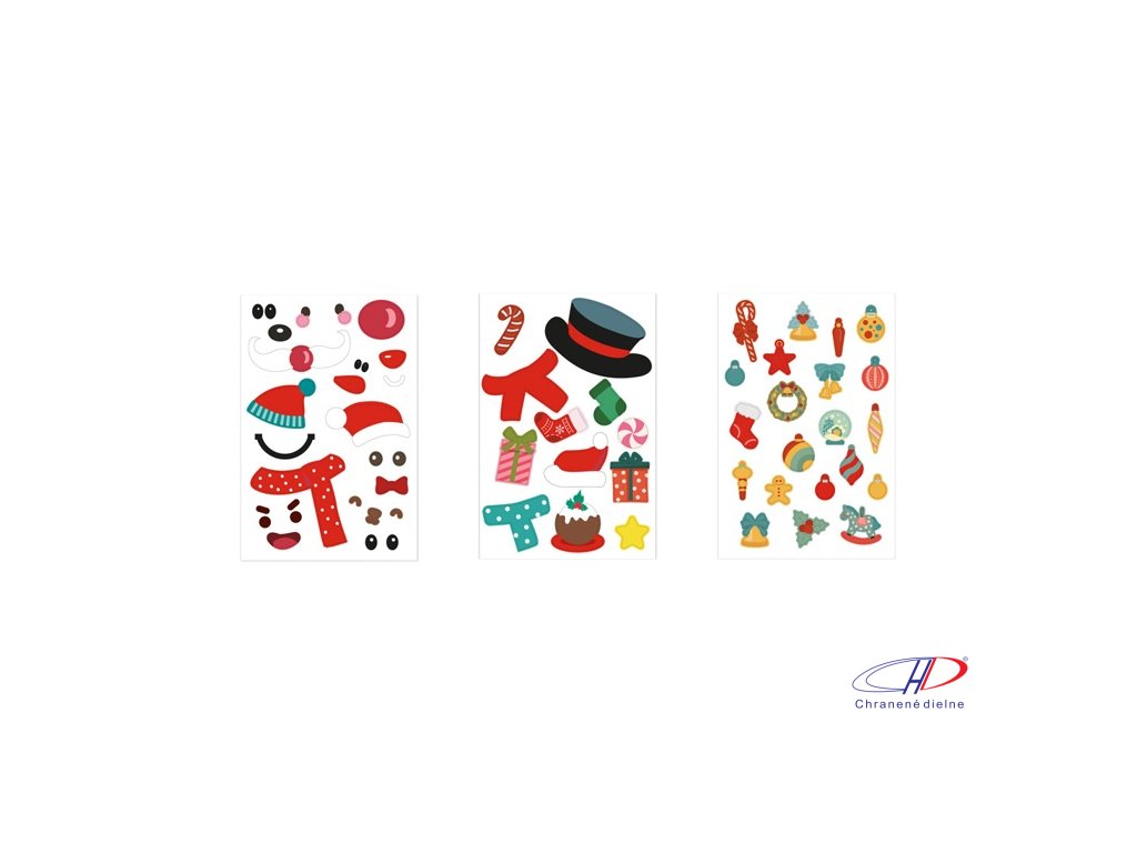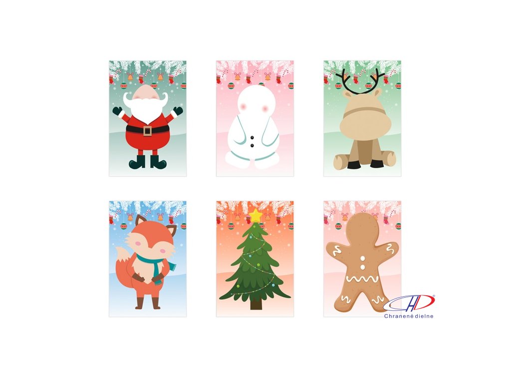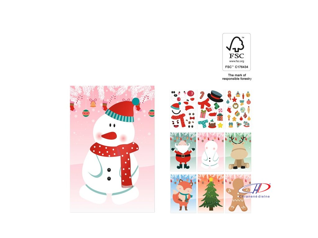 Súprava 6 listov s vianočnými figúrkami: Santa, sob, snehuliak, perníkový muž, líška a vianočný stromček a 3 listov nálepiek. Tento produkt je vyrobený z FSC™ certifikovaného materiálu a iných kontrolovaných materiálov.Dodatočné parametre