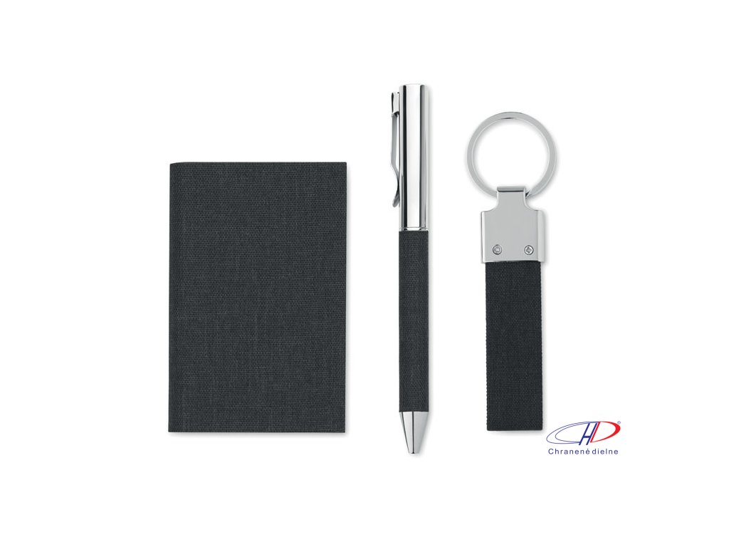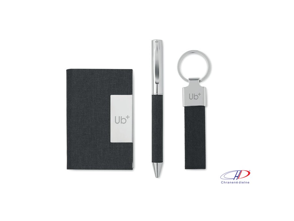 3-dielna darčeková sada v krabičke. Vrátane kovového guľôčkového pera s RPET polyesterovým detailom, RPET polyesterového krúžku na kľúče a RPET polyesterového držiaka na karty s kovovou platňou. Modrá náplň.Dodatočné parametre