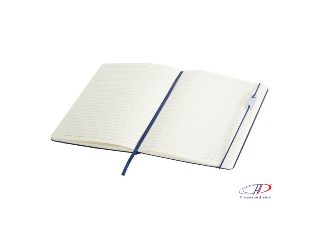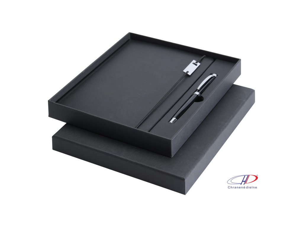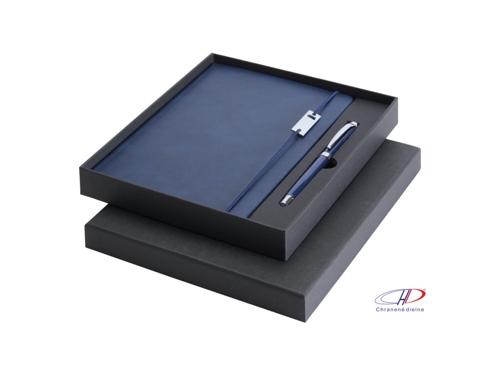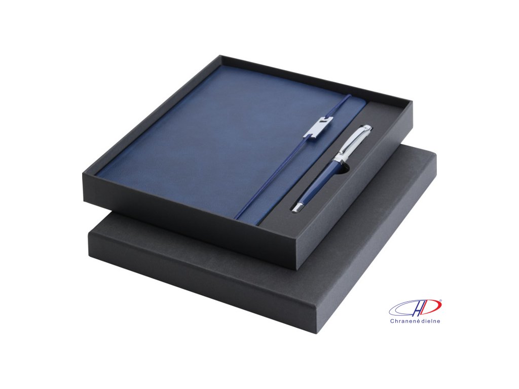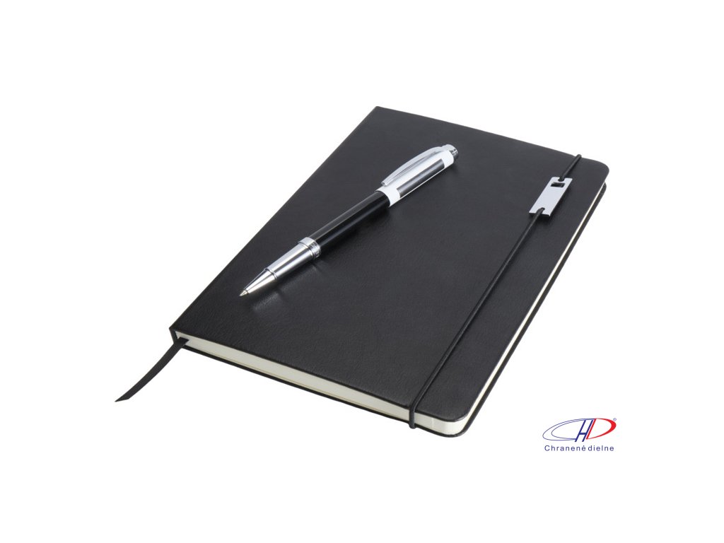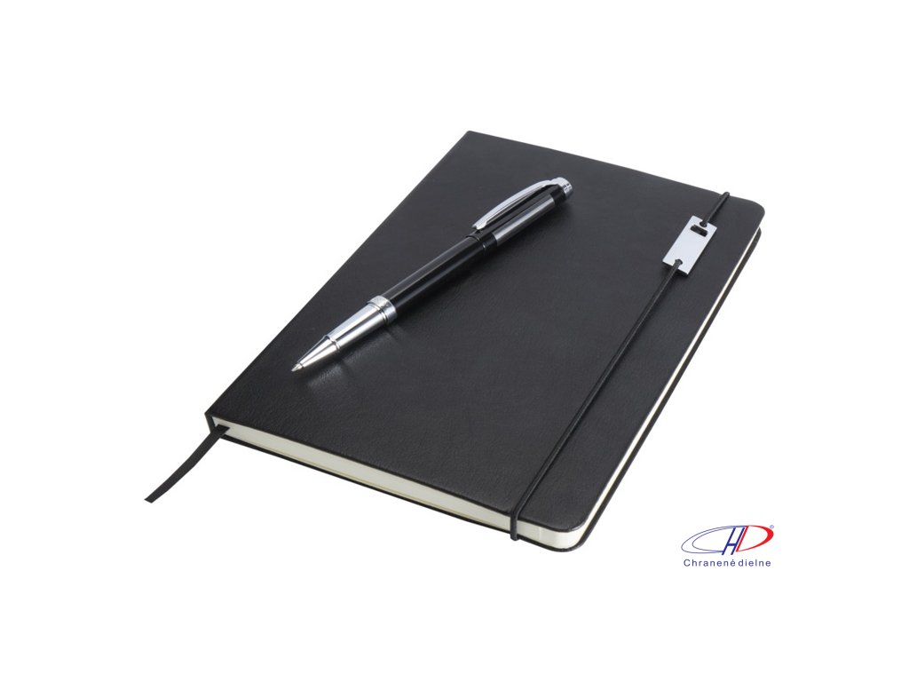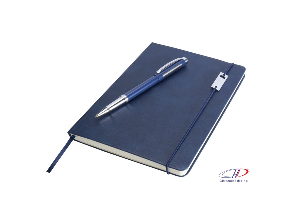Sada obsauje zápisník A5 a kovový roller (modrá+čierna náplň, dĺžka písania 400 metrov, hrot 0,7 mm). Zápisník má 80 listov linkovaného papiera 80 g/m2, dosky z recyklovaného plastu s imitáciou kože, elastické zatváranie, záložku a rozšíriteľné vrecko.Dodatočné parametre