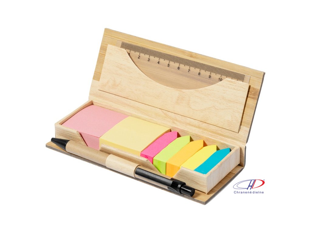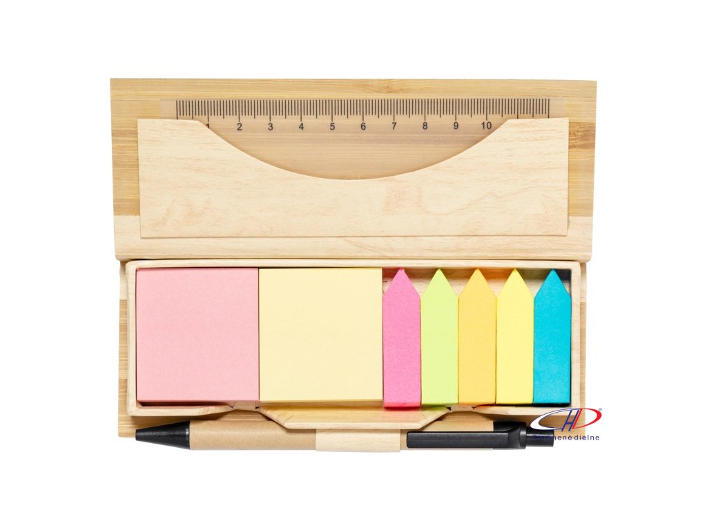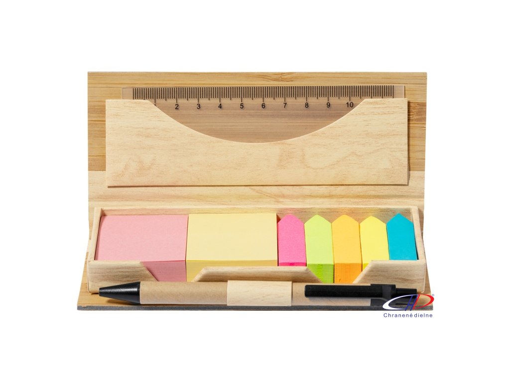 Samolepiaci poznámkový blok s 220 nalepovacími papierikmi (v 2 rôznych farbách) a 550 značkovačmi stránok (v 5 rôznych farbách) v bambusovom puzdre. Vrátane 12 cm pravítka a perá z recyklovaného kartónu s modrou náplňou.Dodatočné parametre