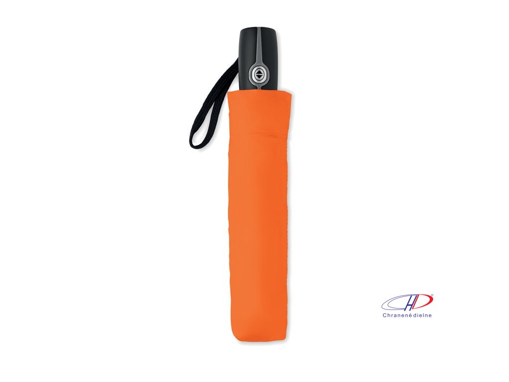 21-palcový luxusný 3-skladací automatický vetruodolný dáždnik s pozinkovanou oceľovou tyčou, čiernymi rebrami s 2 sekciami zo sklenených vlákien a chrómovými kovovými špičkami, čiernou pogumovanou rukoväťou s vyklenutím. Automatické zatváranie.Dodatočné parametre