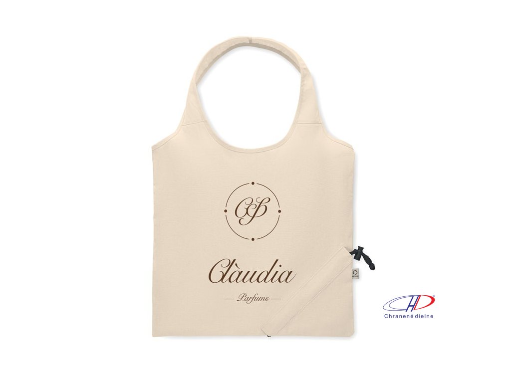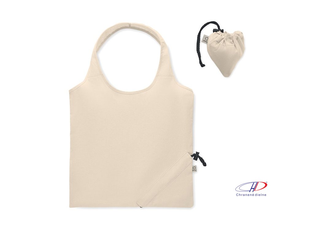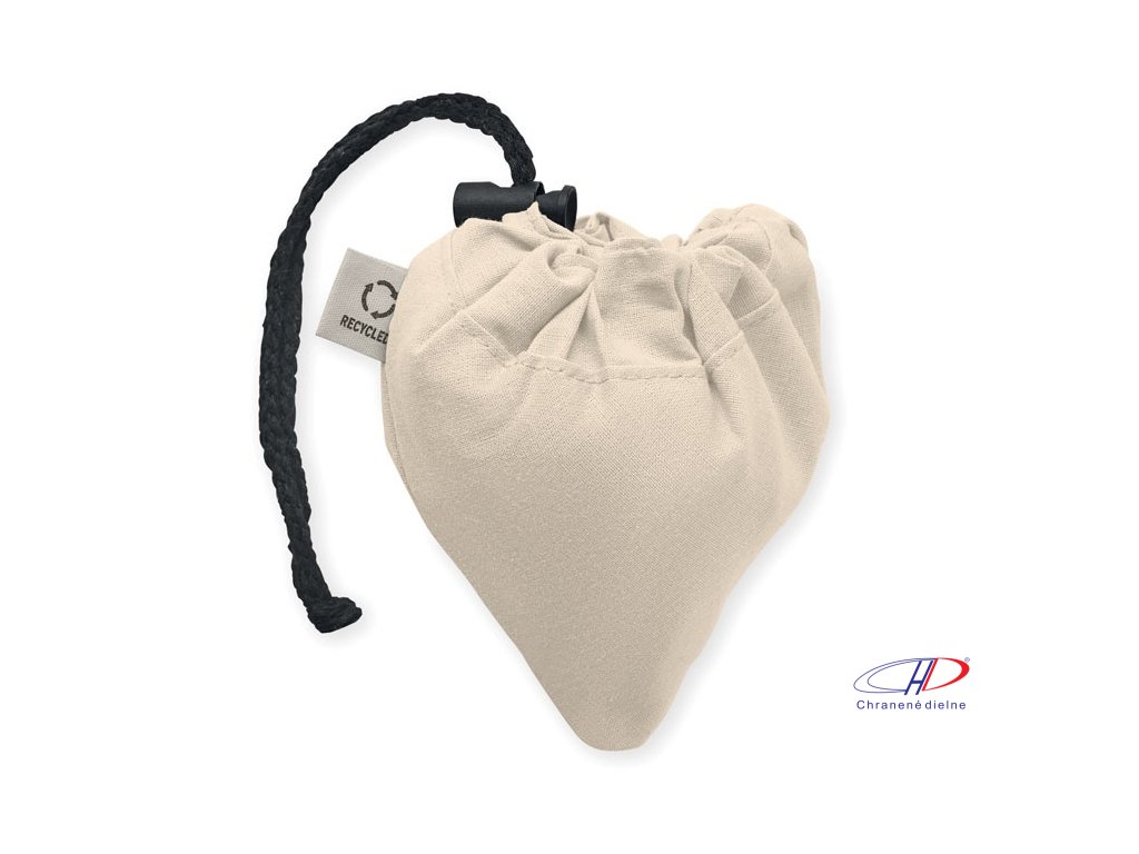 Skladacia taška z recyklovanej bavlny (zmes bavlny a polyesteru). Po potlači sa môže zraziť.