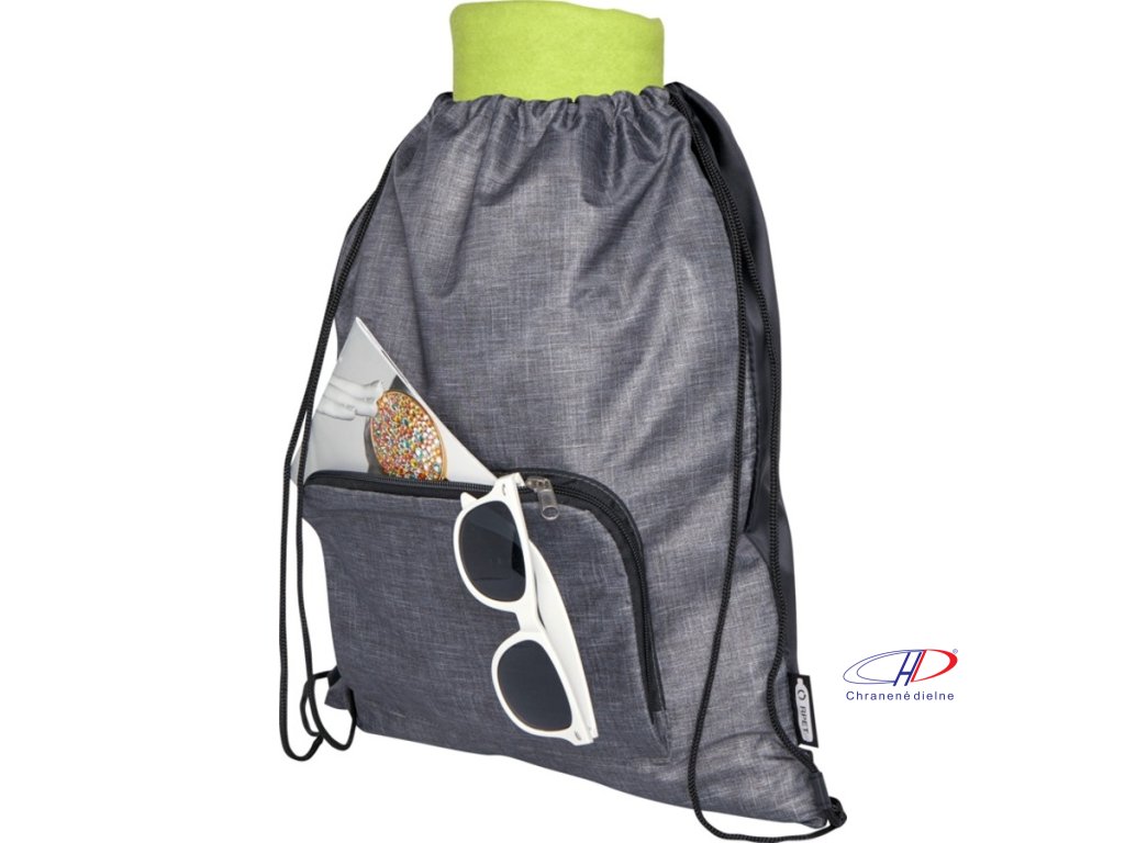 Skladacia recyklovaná taška so sťahovacou šnúrkou má hlavnpú priehradku so zapínaním na cvočky a predné vrecko na zips, do ktorého je možné ťašku jednoducho zložiť.Dodatočné parametre