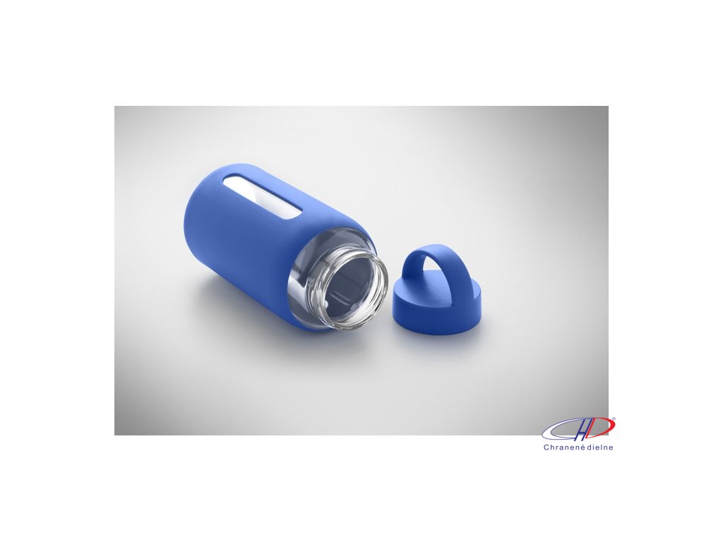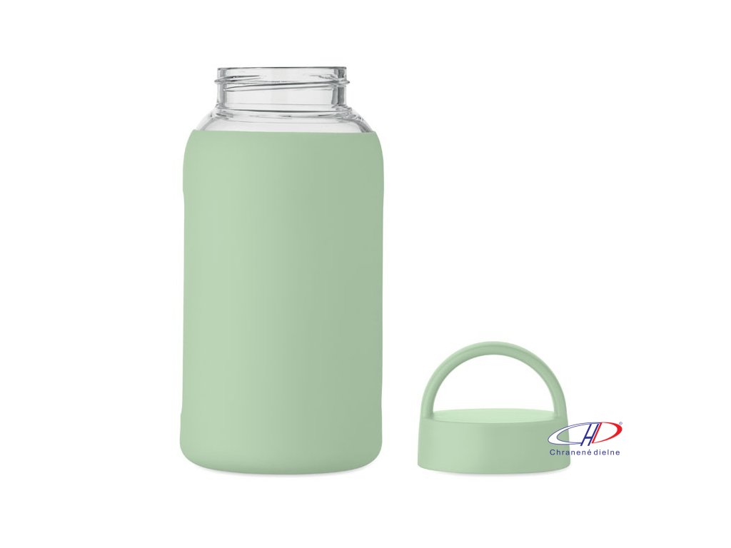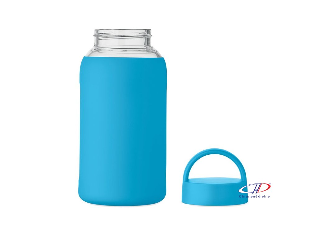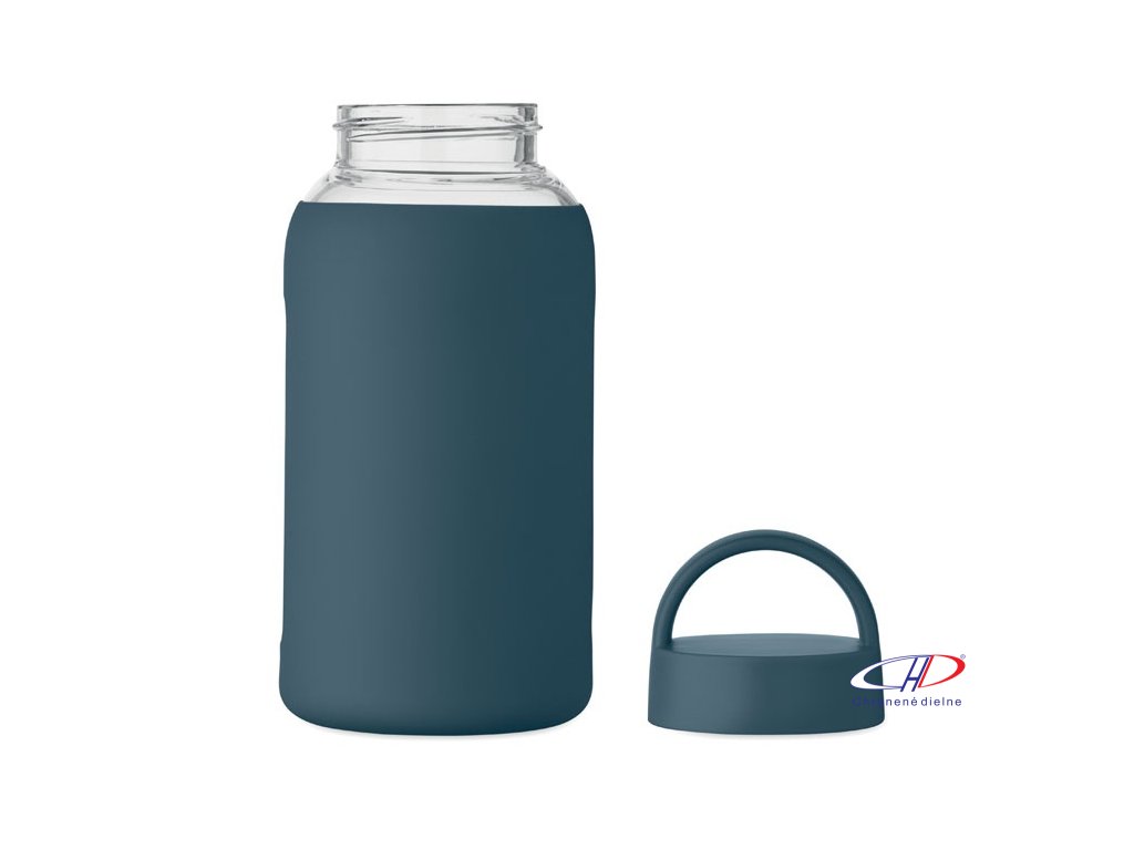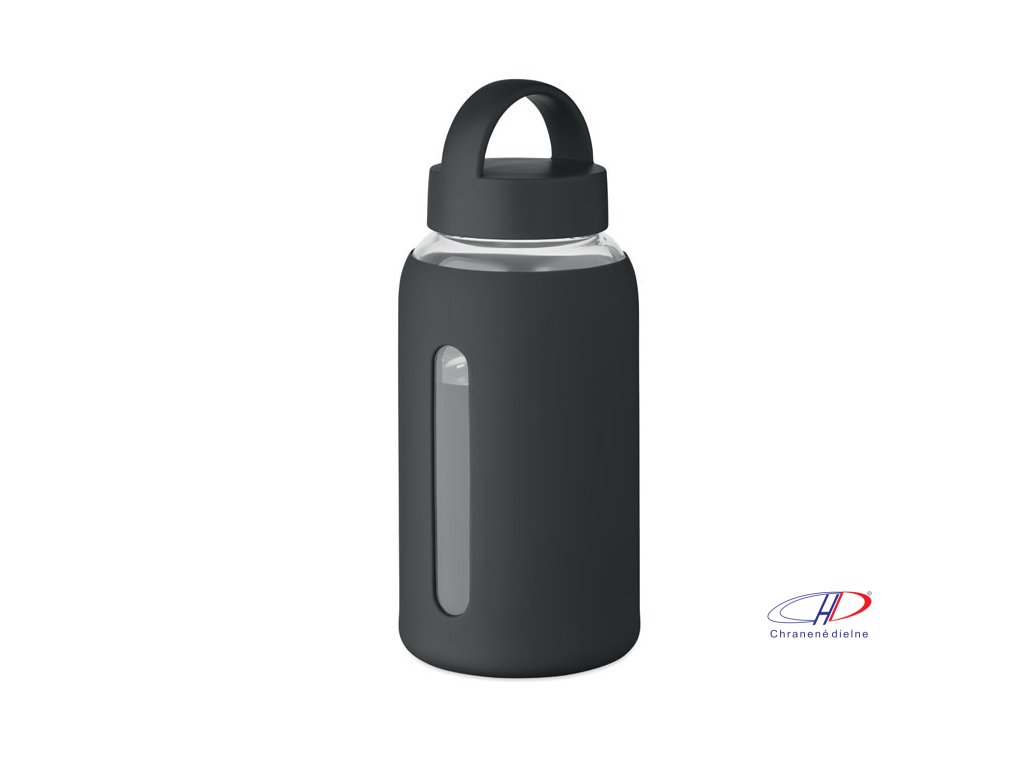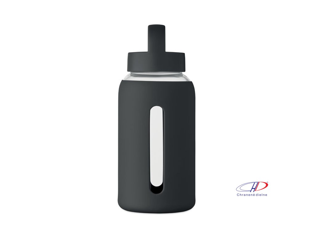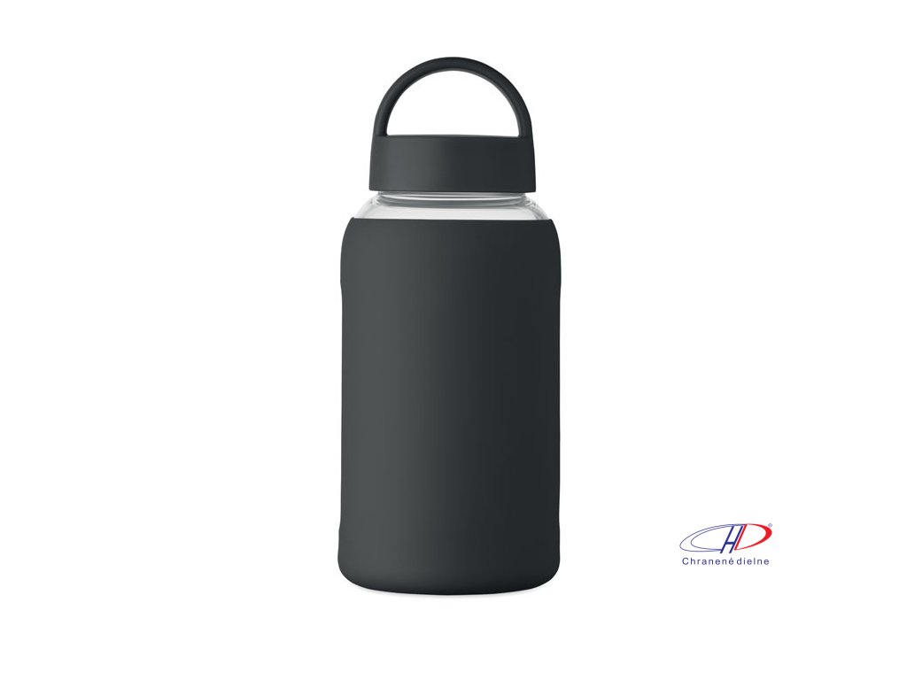 Fľaša z borosilikátového skla so silikónovým vreckom a PP viečkom s rukoväťou. Objem: 600 ml