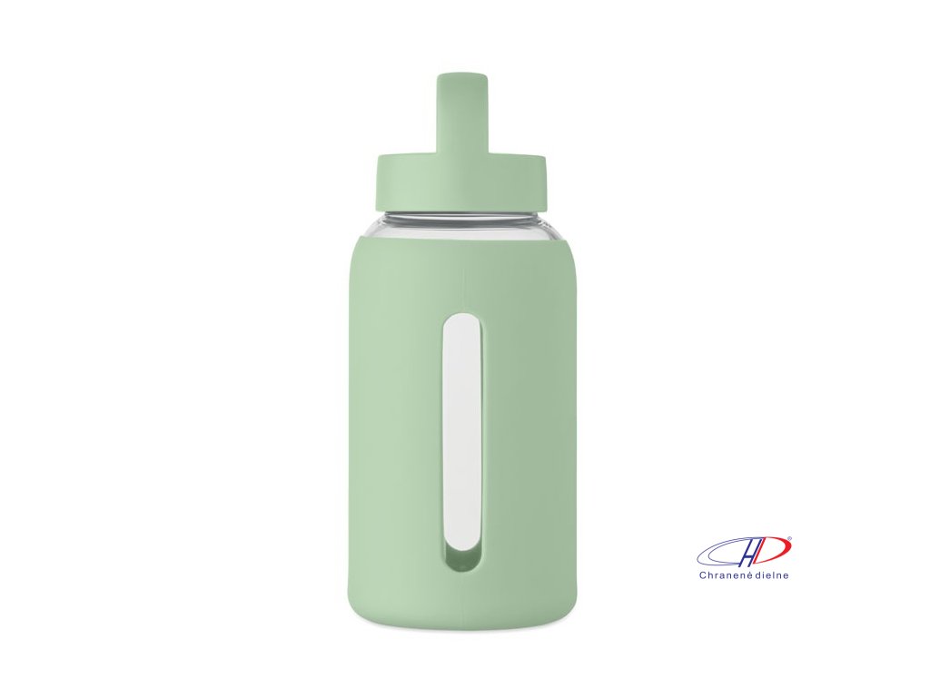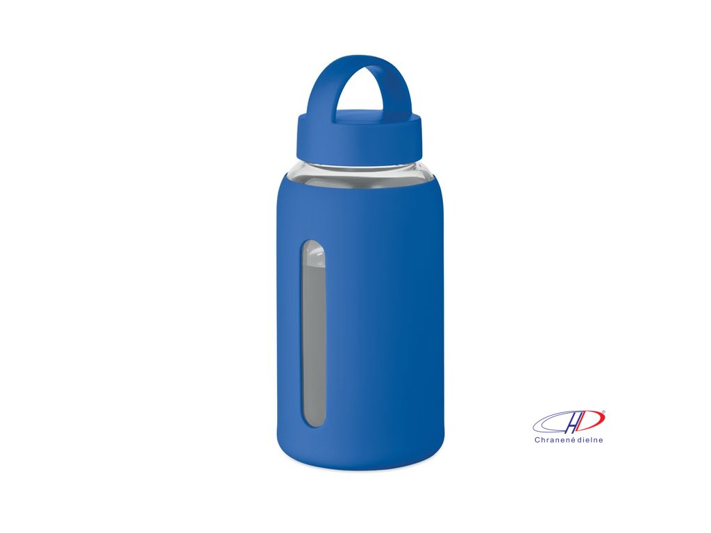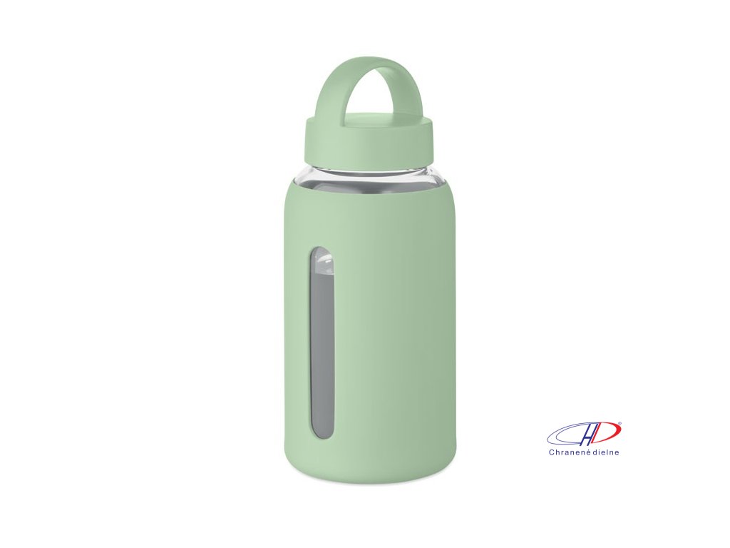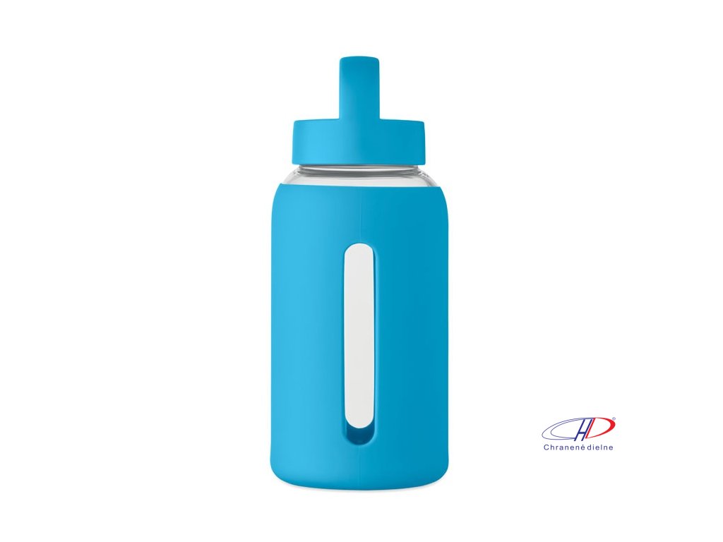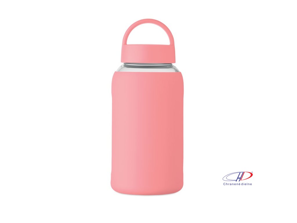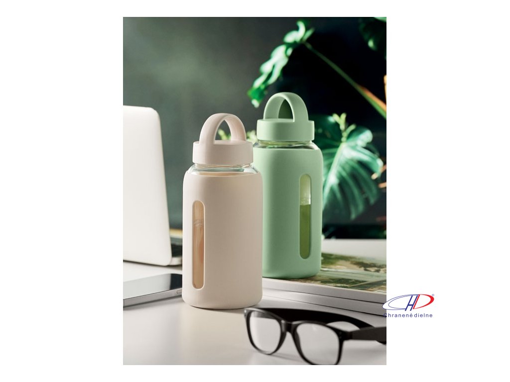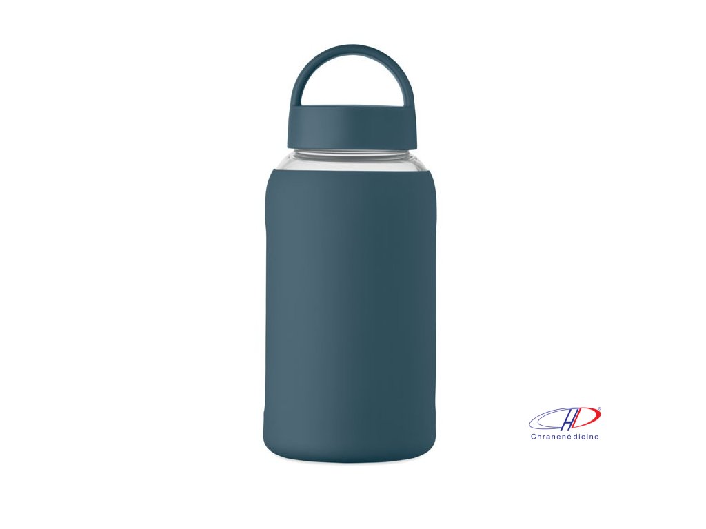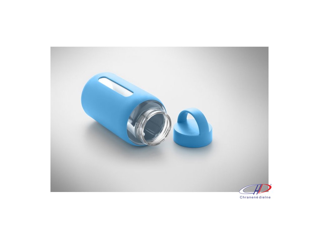 Fľaša z borosilikátového skla so silikónovým vreckom a PP viečkom s rukoväťou. Objem: 600 ml