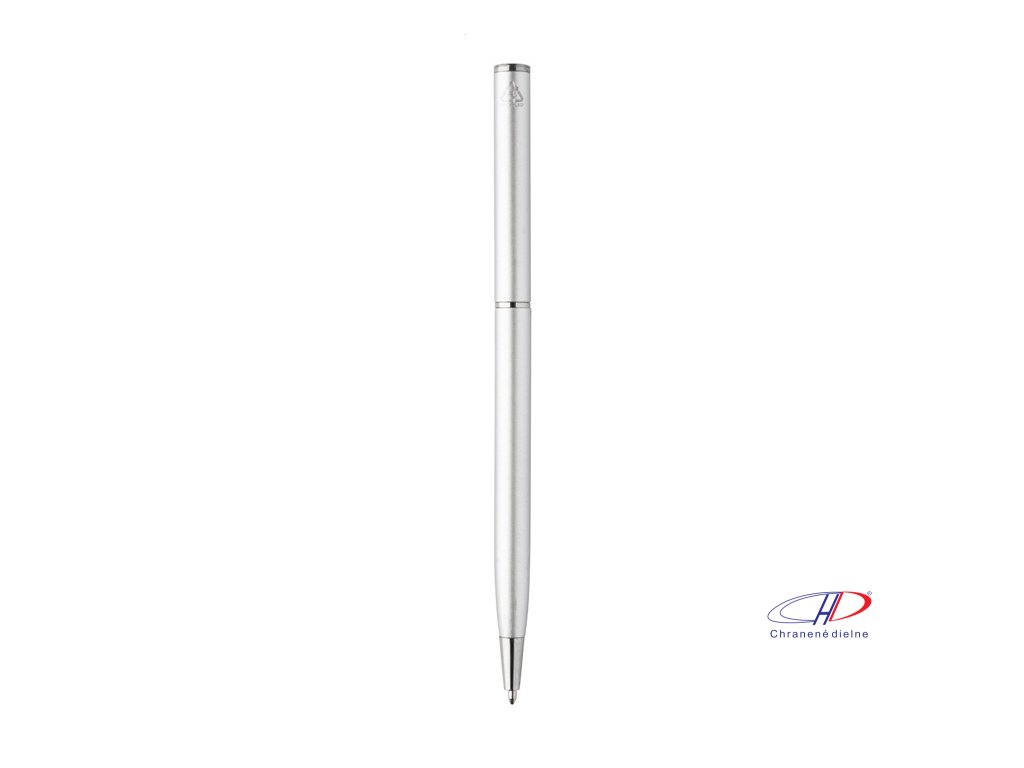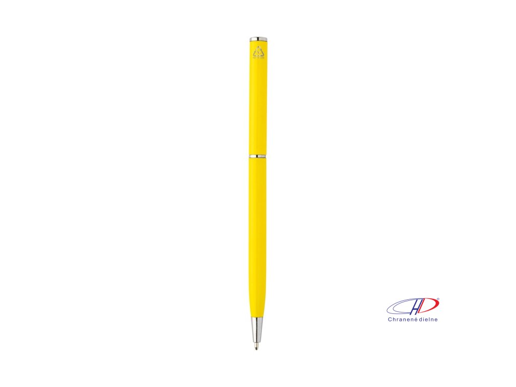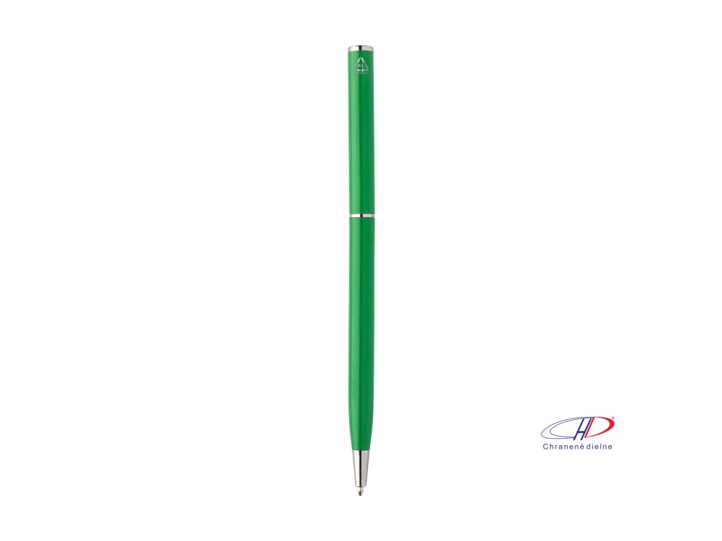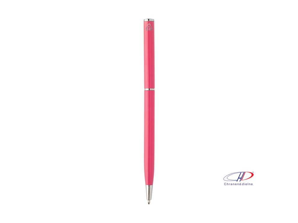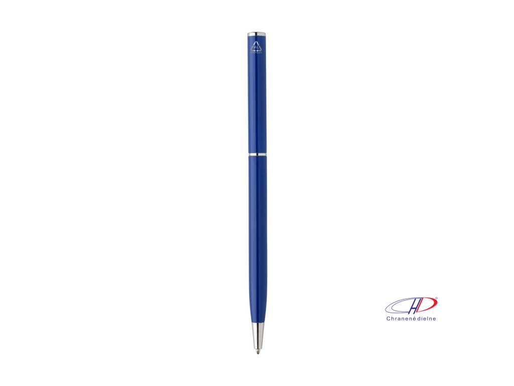 Guľôčkové pero z recyklovaného hliníka s chrómovanými časťami. S modrou náplňou.