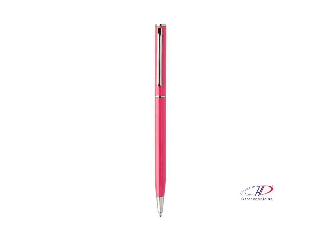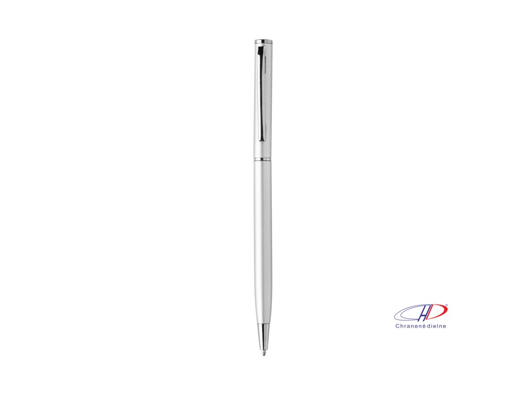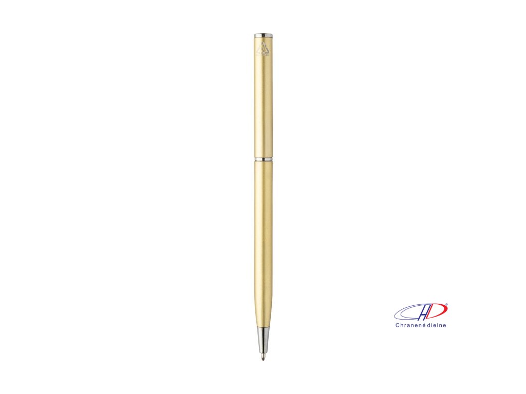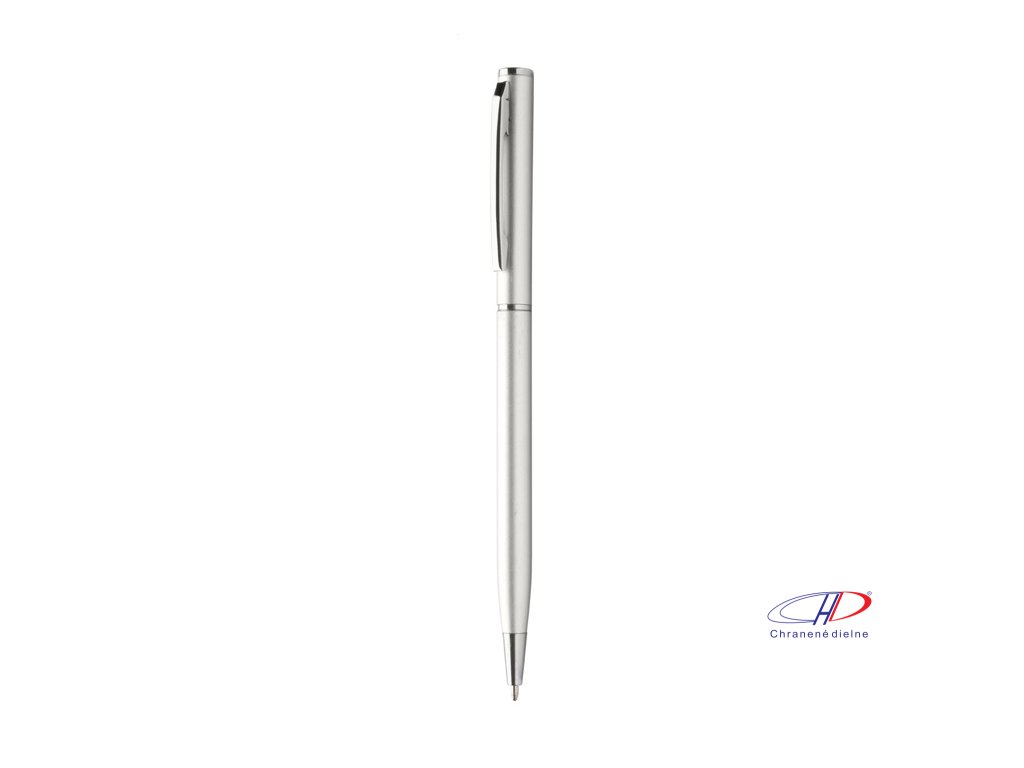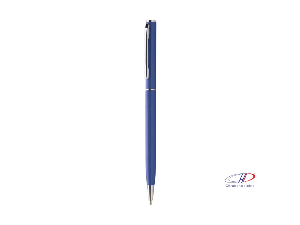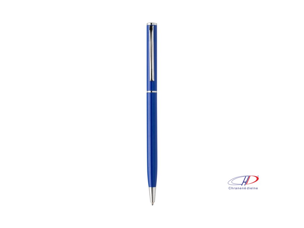 Guľôčkové pero z recyklovaného hliníka s chrómovanými časťami. S modrou náplňou.
