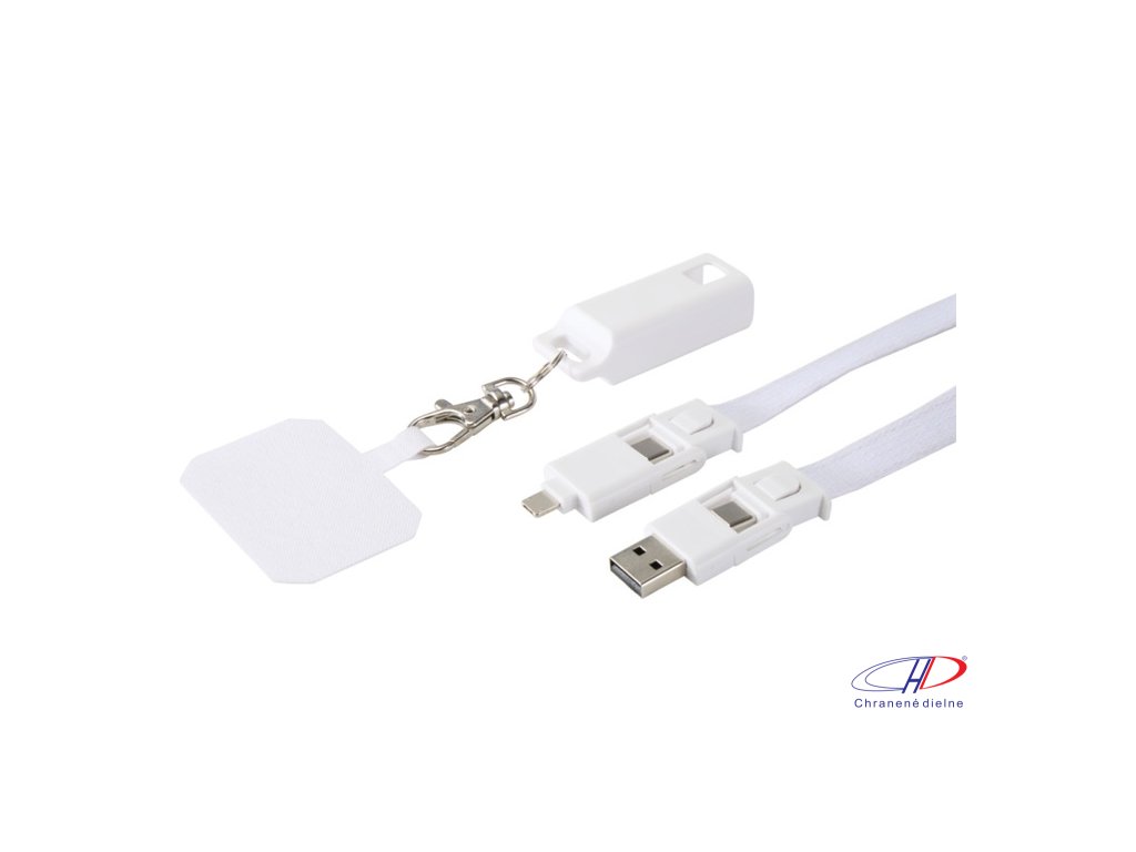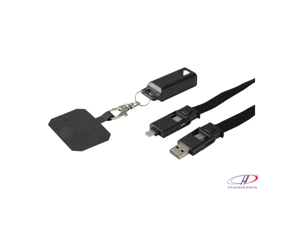 Šnúrka na smartfón z recyklovaného plastu so vstavaným 65W nabíjacím káblom 5v1, ktorý ponúka vstupy typu C a USB-A a výstupy typu C, Lightning a microUSB. Je kompatibilný so štandardmi CarPlay aj Android Auto.Dodatočné parametre