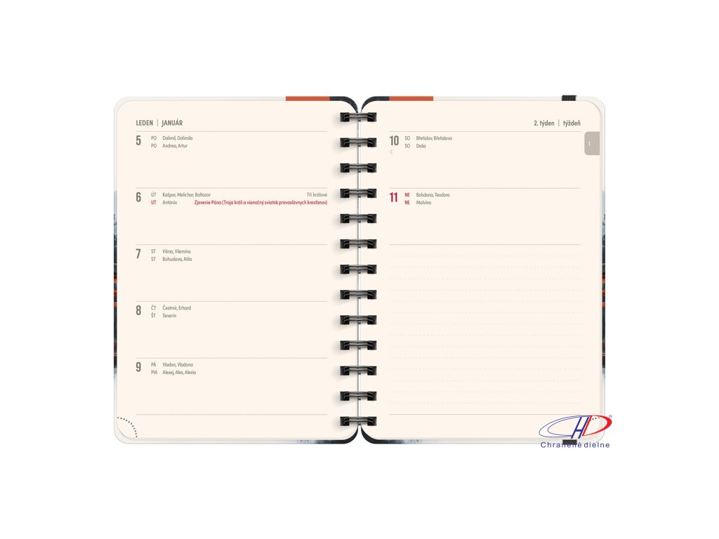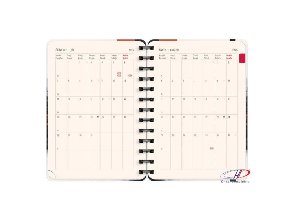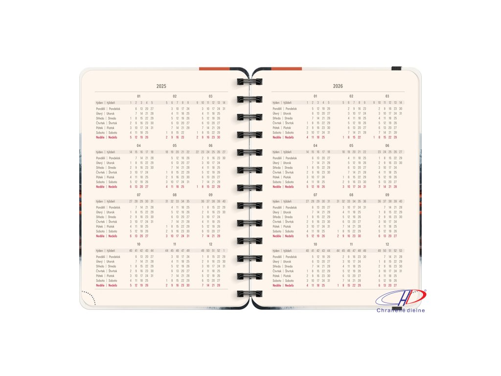 MINIMÁLNY ODBER 2 kusy. 18-mesačný diár (jún 2025 - december 2026) obsahuje prehľad na rok 2025 a 2026, zoznam českých a slovenských mien, česko-slovenské týždenné riadkové kalendárium s menami a sviatkami a priestor na poznámkyDodatočné parametre