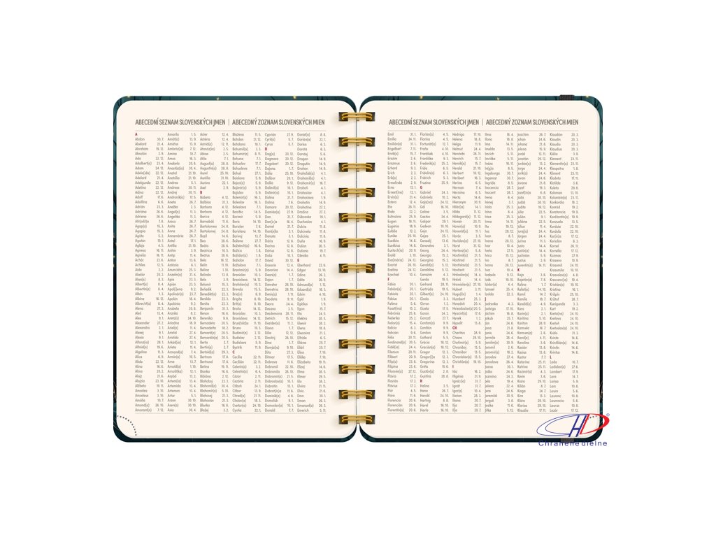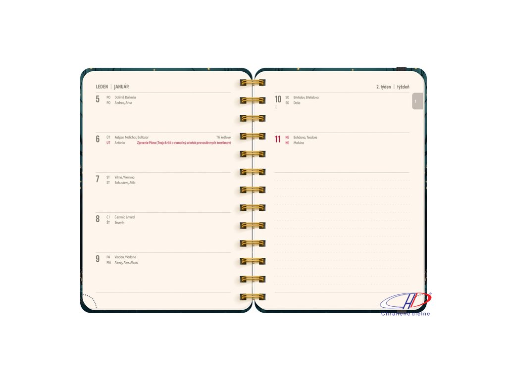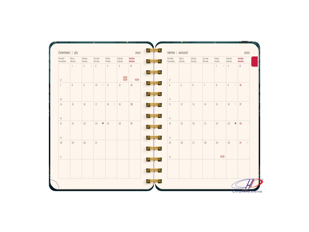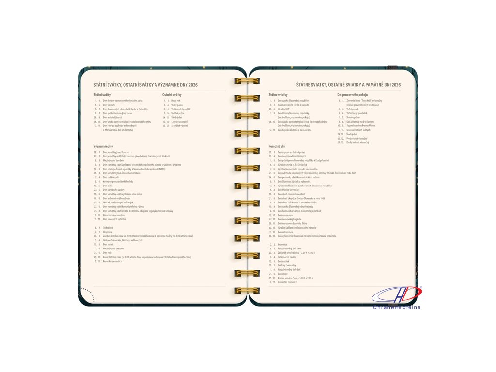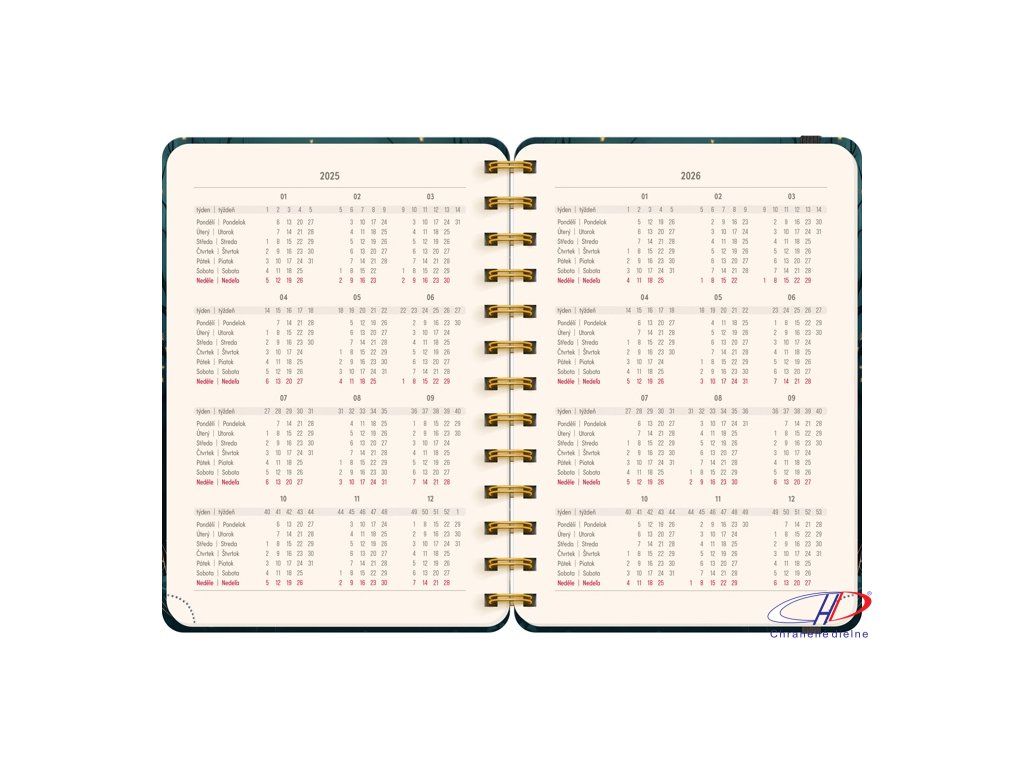 MINIMÁLNY ODBER 2 kusy. 18-mesačný diár (jún 2025 - december 2026) obsahuje prehľad na rok 2025 a 2026, zoznam českých a slovenských mien, česko-slovenské týždenné riadkové kalendárium s menami a sviatkami a priestor na poznámkyDodatočné parametre
