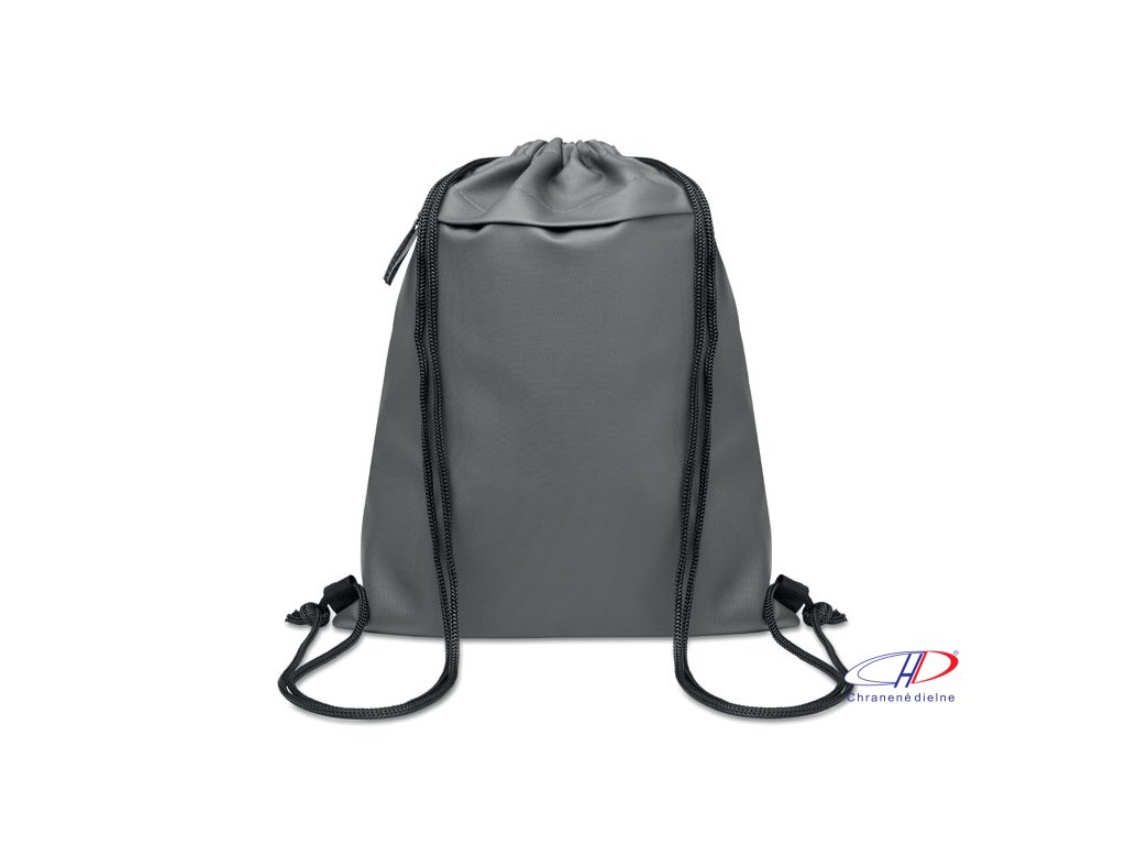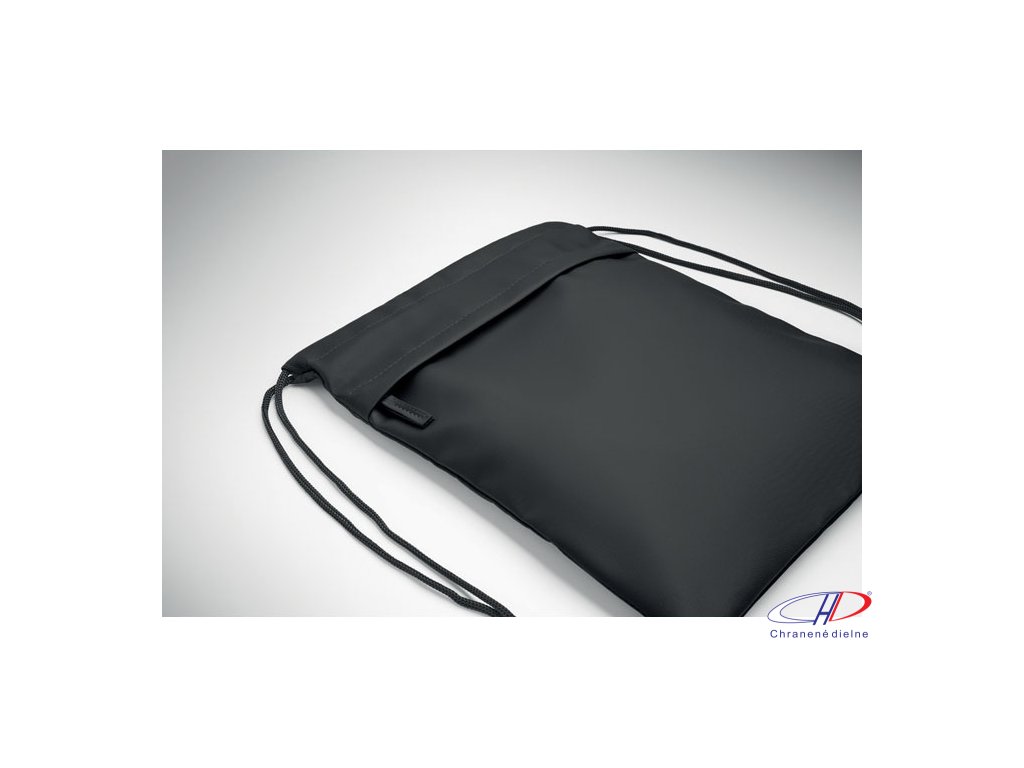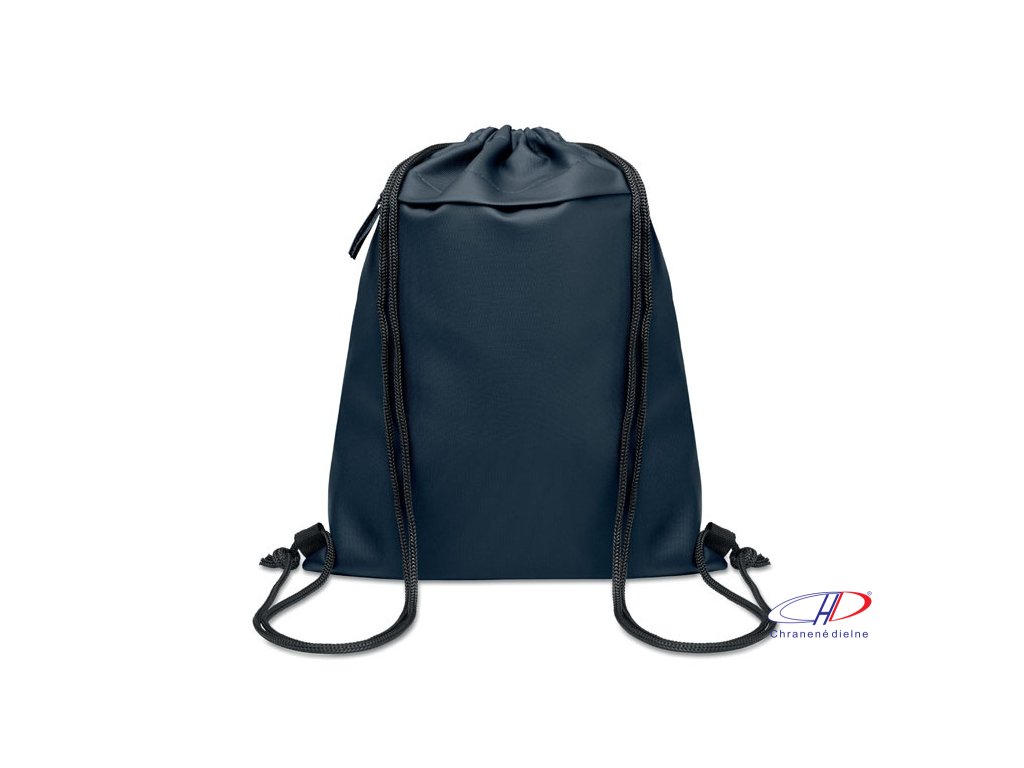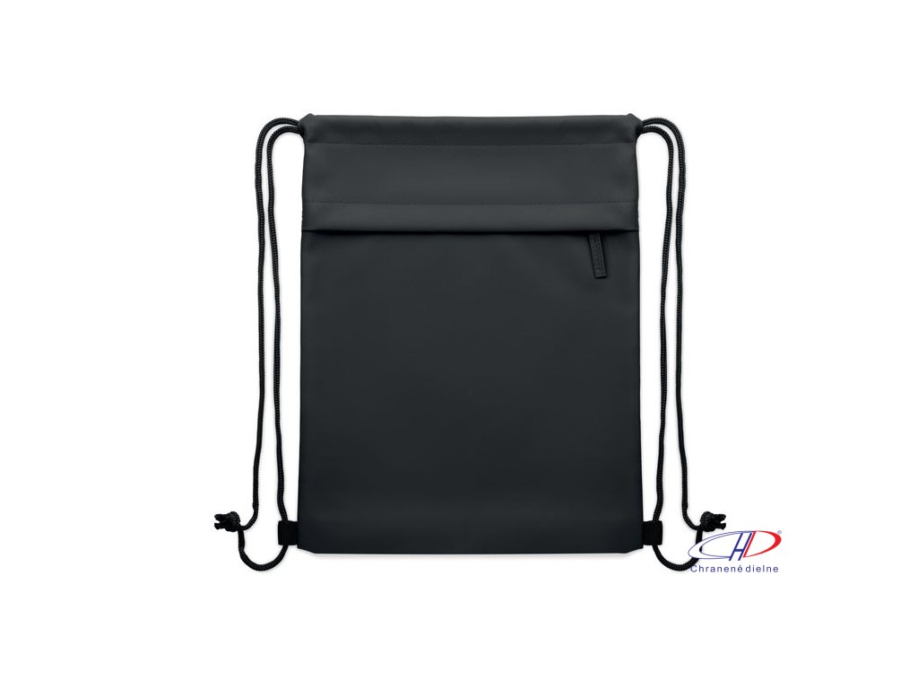 Taška so sťahovacou šnúrkou s PU záterom z polyesteru 600D RPET a podšívkou z polyesteru 190T RPET. Predné vrecko na zips.Dodatočné parametre