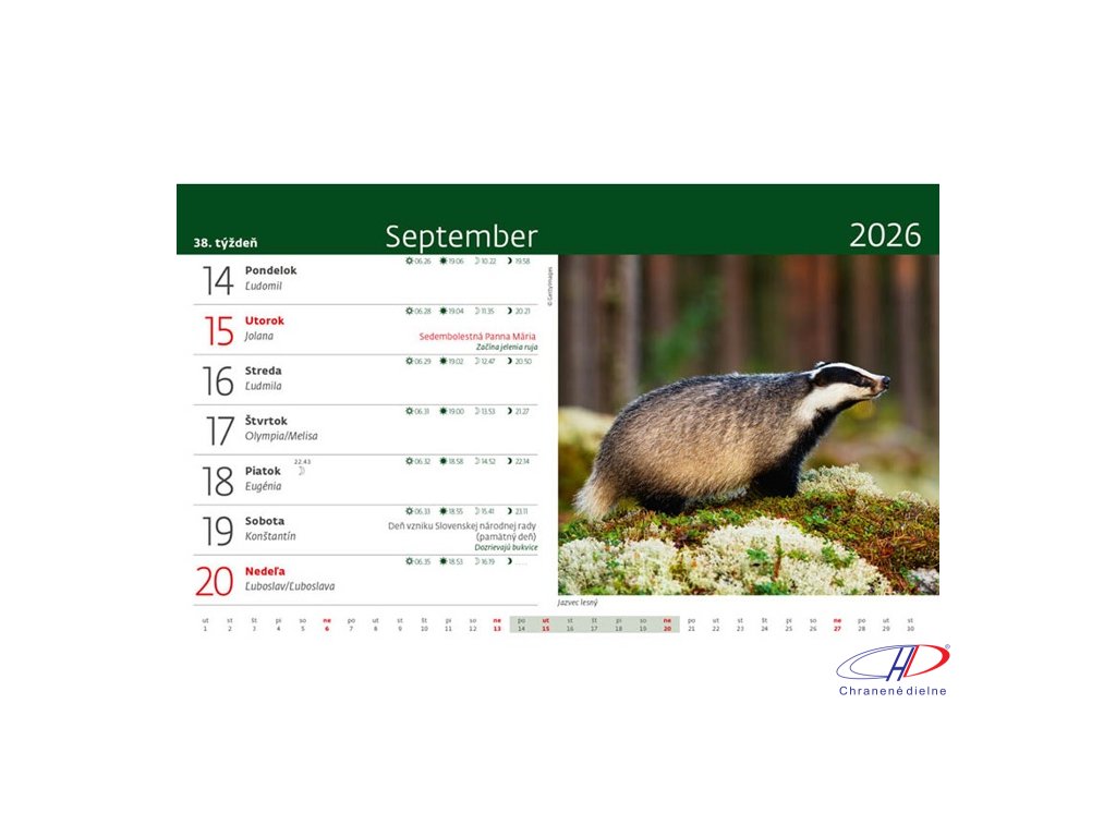 POVINNÉ BALENIE 10 kusov. Formát: 22,6 x 13,9 cm. Kalendárium: slovenské týždenné riadkové. Počet strán: 58 + 2. Stojanček: s plným dnom. Plocha pre potlač: 22,6 x 3 cm. + doby lovu zveri, východy a západy slnka a mesiaca, peľový kalendárDodatočné parametre
