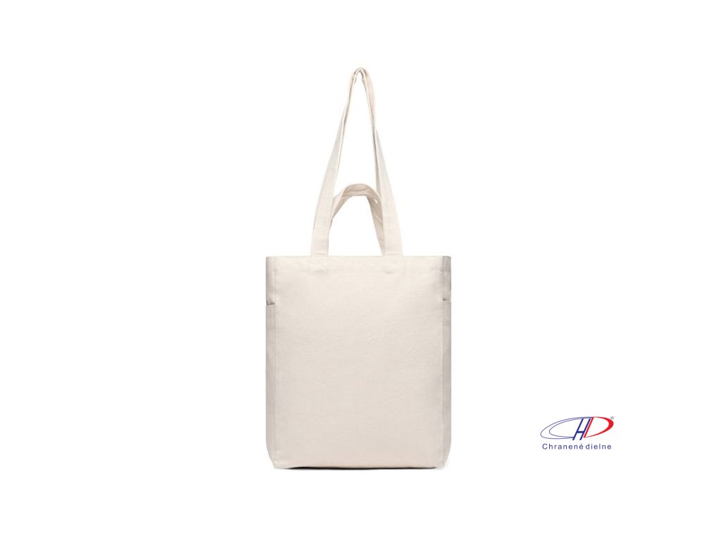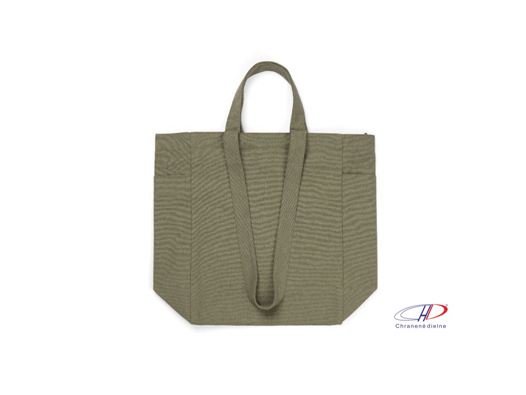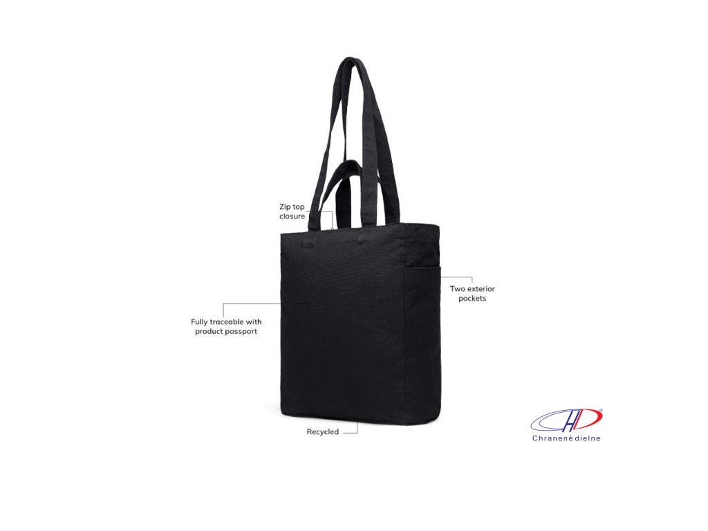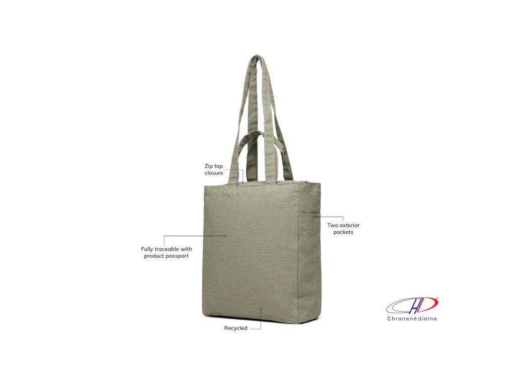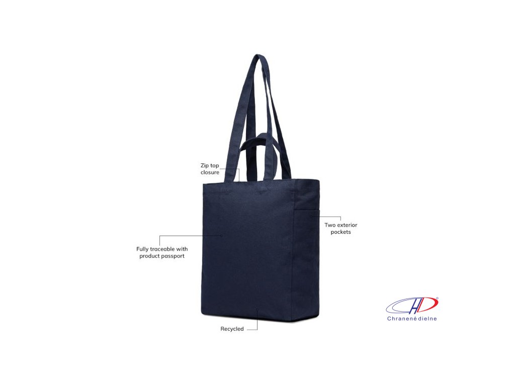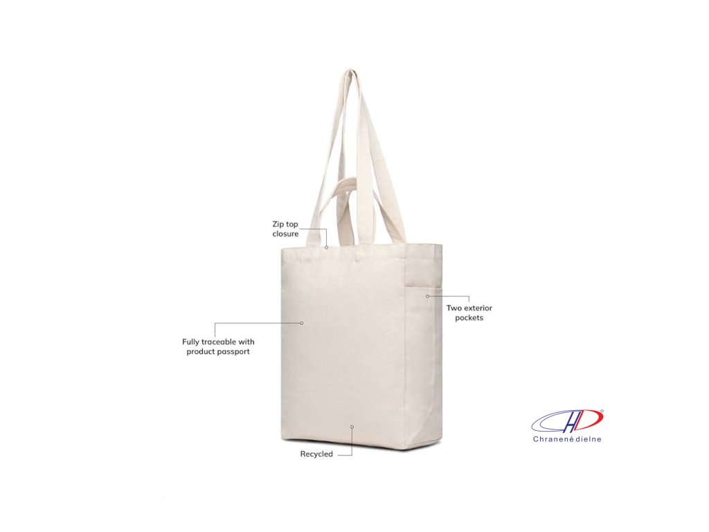 Kratšie uši na nosenie v ruke, dlhšie uši na nosenie na ramene. Dve otvorené vonkajšie vrecká. Vyrobené z recyklovaného nefarbeného plátna (canvas) bez použitia bielidiel a chemikálií. Zloženie: 70% recyklovaná bavlna, 30% recyklovaný polyester. AWARE™Dodatočné parametre
