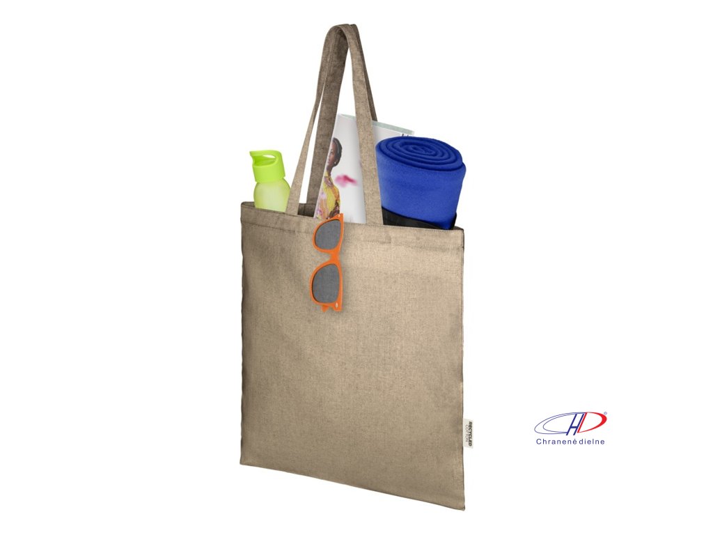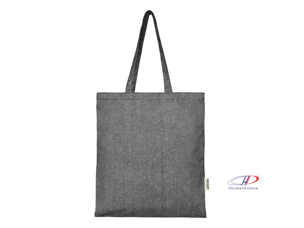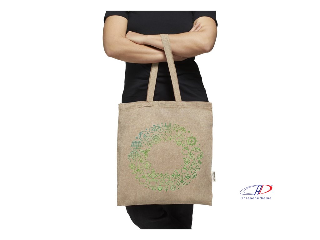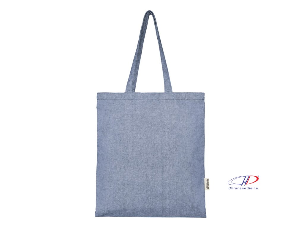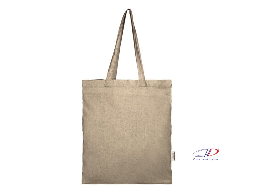 Nákupná taška vyrobená zo zmesi recyklovanej bavlny a polyesteru o hmotnosti 150 g/m?. Recyklovaná bavlna pochádza z výrobného odpadu textilných tovární, vznikajúcich počas procesu rezania. Nosnosť do 5 kg. Dĺžka rukoväte: 31 cm.Dodatočné parametre