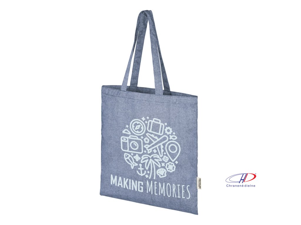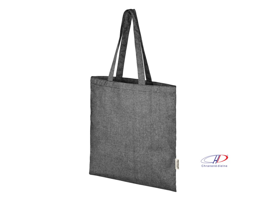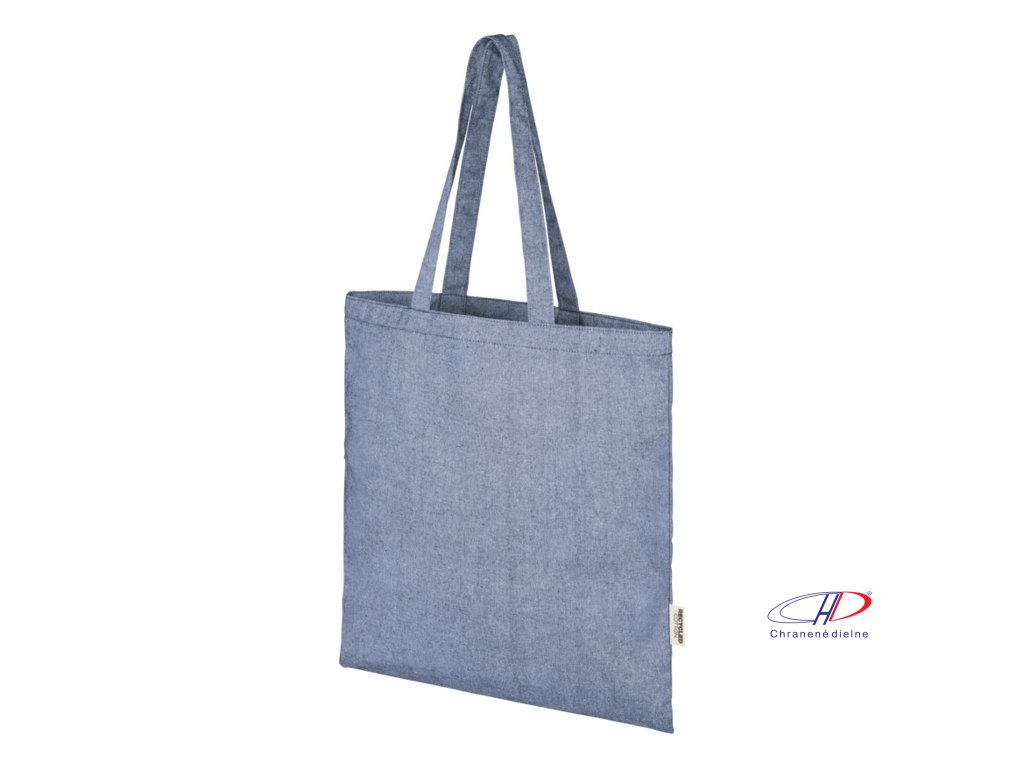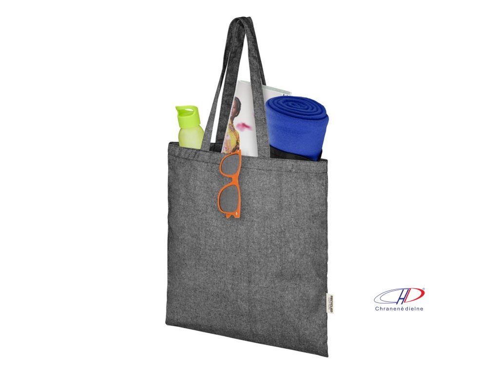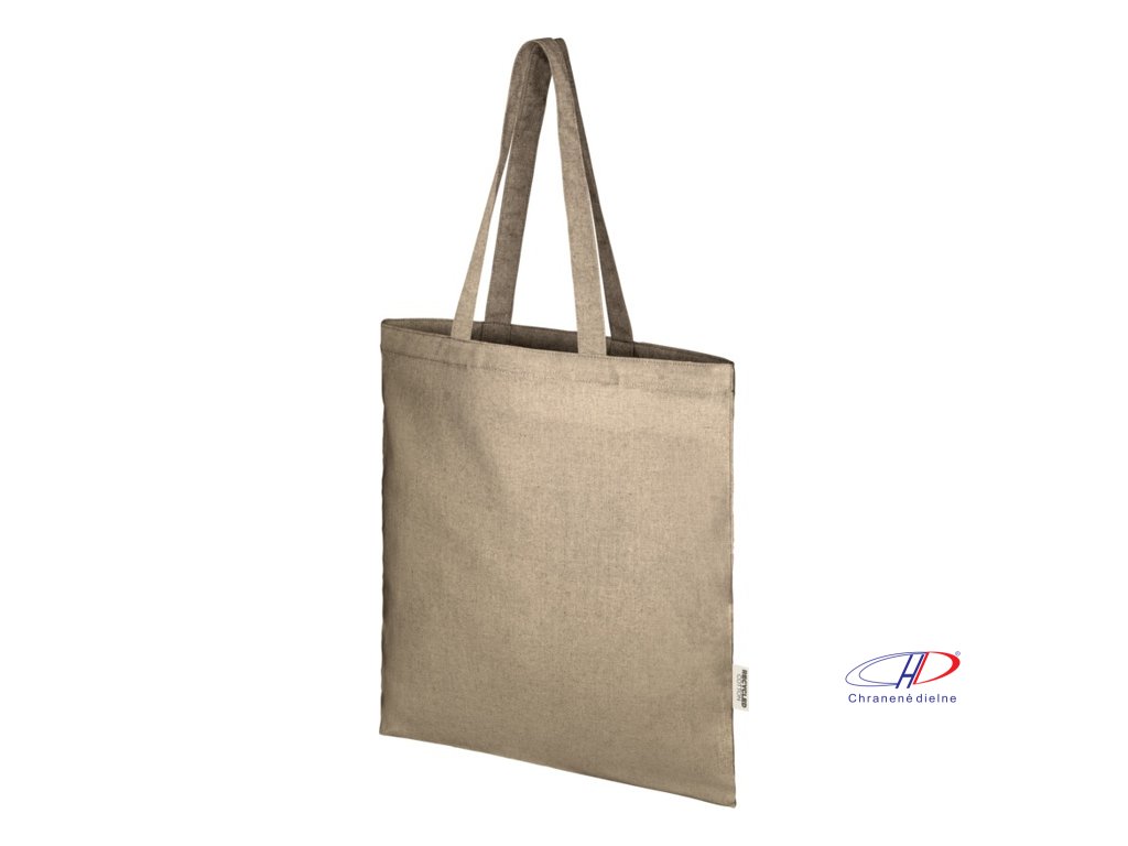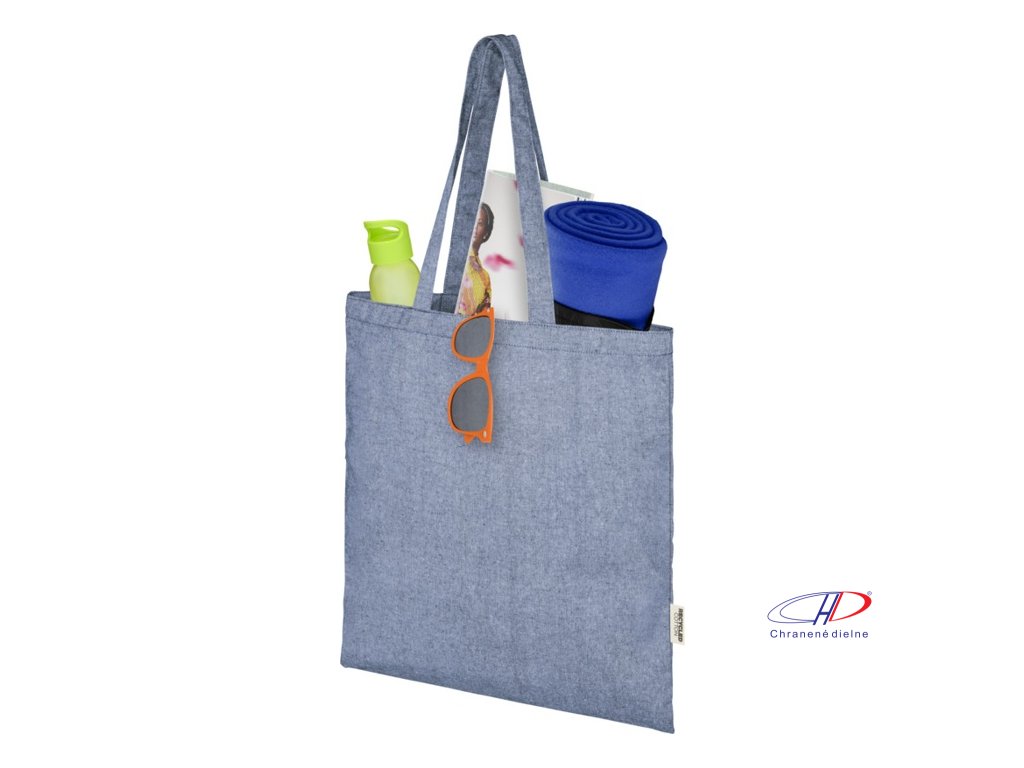 Nákupná taška vyrobená zo zmesi recyklovanej bavlny a polyesteru o hmotnosti 150 g/m?. Recyklovaná bavlna pochádza z výrobného odpadu textilných tovární, vznikajúcich počas procesu rezania. Nosnosť do 5 kg. Dĺžka rukoväte: 31 cm.Dodatočné parametre