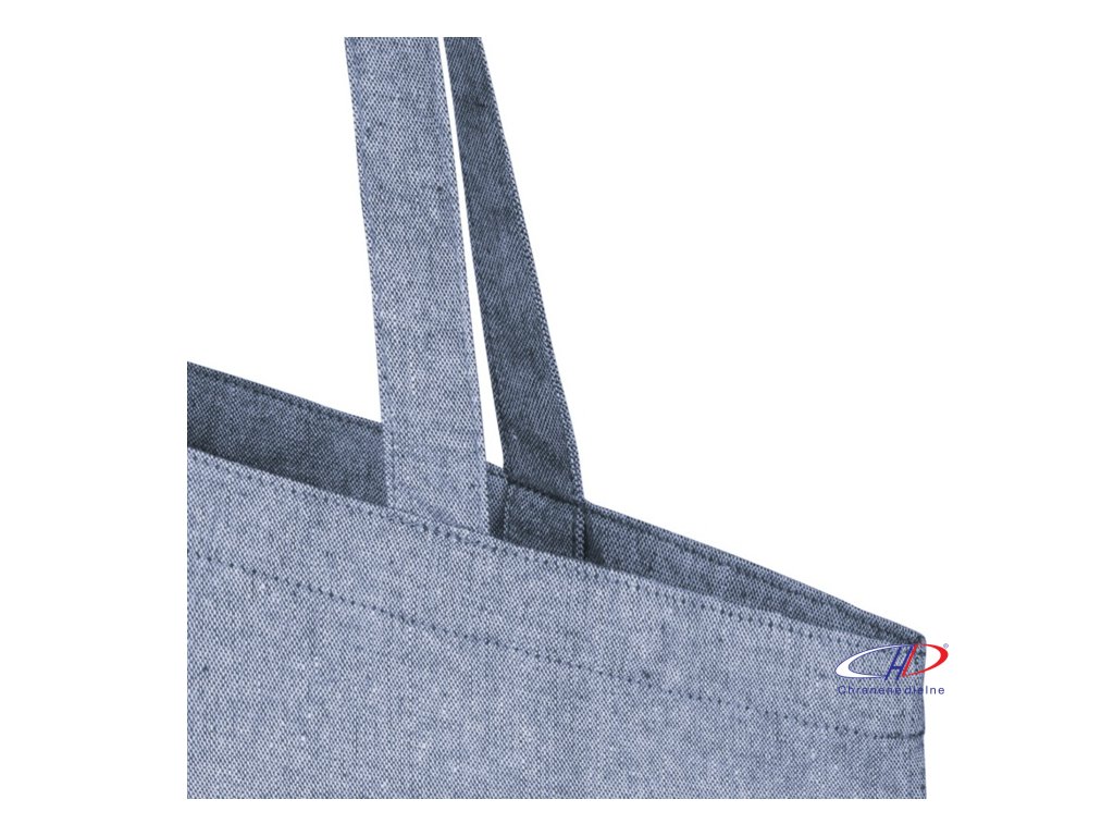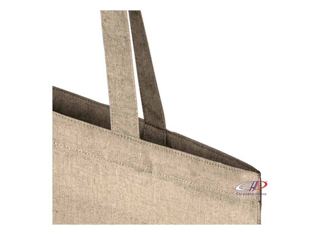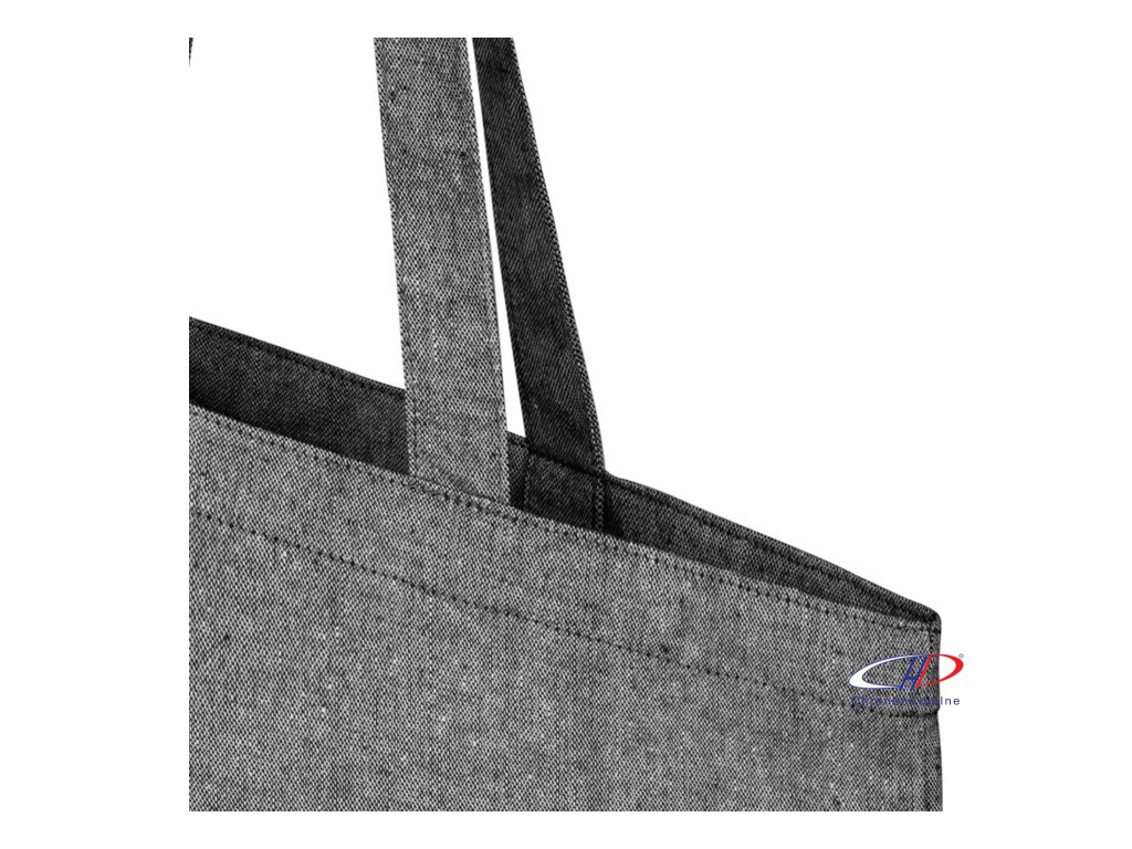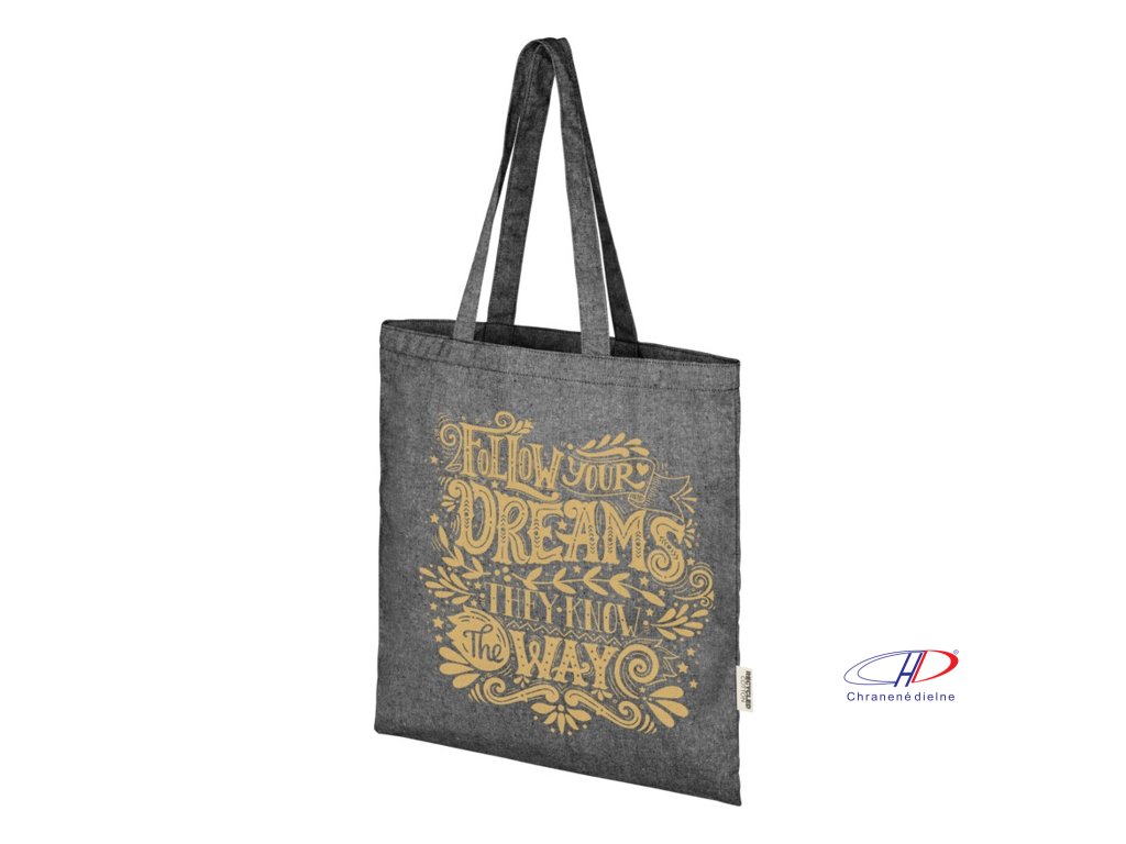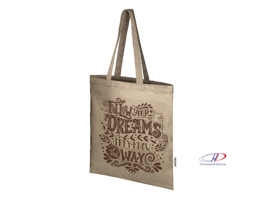 Nákupná taška vyrobená zo zmesi recyklovanej bavlny a polyesteru o hmotnosti 150 g/m?. Recyklovaná bavlna pochádza z výrobného odpadu textilných tovární, vznikajúcich počas procesu rezania. Nosnosť do 5 kg. Dĺžka rukoväte: 31 cm.Dodatočné parametre